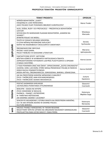 Projekt edukacyjny – Samorządowe Gimnazjum w Bolszewie PROPOZYCJE TEMATÓW PROJEKTÓW GIMNAZJALNYCH TEMAT PROJEKTU język polski WŚRÓD BOHATERÓW „ILIADY”. OSIĄGNIĘCIA LUDZI RENESANSU. JAKIE POLSKIE FILMY POWINIEN OBEJRZEĆ EUROPEJCZYK? ALEK, ZOŚKA, RUDY I ICH PRZYJACIELE – PREZENTACJA BOHATERÓW LEKTURY. WYCIECZKA PO WARSZAWIE ŚLADAMI BOHATERÓW „KAMIENI NA SZANIEC”. WYBITNI POLACY XX WIEKU. TEATR W CZASACH WILIAMA SZEKSPIRA. O CZYM MÓWIĄ PRZYDROŻNE KAPLICZKI? NAPISY NA NAGROBKACH OKOLICZNYCH CMENTARZY. ŚREDNIOWIECZNE OBYCZAJE. RYCERZ I JEGO DAMA. POLSCY NOBLIŚCI W DZIEDZINIE LITERATURY. historia Maria Treder Wiesława Marszała Dorota Sychowska Marzena Jędrzejewska FANTASTYCZNE ISTOTY MITYCZNE. BÓSTWA KOBIECE W WYBRANYCH MITOLOGIACH ŚWIATA. Hanna Lesner ZAPROJEKTOWANIE FOTOGRAFII LUB PRAC PLASTYCZNYCH Z OPISAMI O MAŁEJ OJCZYŹNIE. Z TEGO POWINIEN ZNAĆ NAS ŚWIAT. OPRACOWANIE „ZŁOTEJ DWUNASTKI” ZJAWISK, DZIEŁ LUB OSÓB, KTÓRE MOGĄ PROMOWAĆ POLSKĘ W ŚWIECIE. Hanna Dettlaff DZIEJE RUCHU FEMINISTYCZNEGO. MODA ANTYKU, ŚREDNIOWIECZA, ODRODZENIA, BAROKU, OŚWIECENIA. JAK NA PRZESTRZENI WIEKÓW MÓWIONO O MIŁOŚCI? Justyna ŻYCIE I TWÓRCZOŚĆ JANA KOCHANOWSKIEGO. Gąsiewicz ŻYCIE I TWÓRCZOŚĆ ADAMA MICKIEWICZA POSTAĆ KAZIMIERZA WIELKIEG0 150 ROCZNICA POWSTANIA STYCZNIOWEGO wos OPIEKUN BISKUPIN - OSADA NA WYSPIE. ŻYCIE CODZIENNE W NEOLICIE. PIAŚNICA - PAMIĘĆ I OSTRZEŻENIE. W PAŃSTWIE KRZYŻACKIM. JAK DAWNIEJ JADANO I LECZONO? SPACER PO WEJHEROWE ( ISTORIA MIASTA NA PRZESTRZENI WIEKÓW). CO I W JAKI SPOSÓB JADANO W DAWNEJ POLSCE. KULTURA BAROKU. MIEJSCE PAMIĘCI NARODOWEJ W TWOIM REGIONIE NEGATYWNY WPŁYW UŻYWEK NA ORGANIZM MŁODZIEŻY GIMNAZJALNEJ PROFILAKTYKA RAKA SZYJKI MACICY I RAKA PIERSI. Sławomir Czarnecki Katarzyna Błędzka-Zając Katarzyna Nerowska Sławomir Czarnecki Strona 1 z 5 Projekt edukacyjny – Samorządowe Gimnazjum w Bolszewie DZIEŃ TURYSTY – NASI WSCHODNI SĄSIEDZI. język niemiecki HISTORIA I KULTURA BERLINA. BERLIN OKIEM GIMNAZJALISTY. JEDZ SMACZNIE I ŻYJ ZDROWO – KUCHNIA NIEMIECKA. Paulina Andrzejczak ZIEMIE POLSKIE POD OKUPACJĄ NIEMIECKĄ W LATACH 1939 – 1945. Alicja Hopa WIEDEŃSCY KLASYCY W LATACH 1780 – 1827 (WYBRANI MUZYCY). Hanna Kass SYMBOLE SZWAJCARII. GENEZA I ZNACZENIE. Monika Walkowiak NIEMCY W OCZACH POLAKÓW. WALKA ZE STEREOTYPAMI. GERMANIZACJA ZIEM POLSKICH W II POŁOWIE XIX WIEKU. język angielski CO FASCYNUJE CIĘ W KRAJACH ANGLOJĘZYCZNYCH. HISTORIA I TRADYCJE RODZINY KRÓLEWSKIEJ. KOPCIUSZEK NA DESKACH SZKOLNEGO TEATRU. WPŁYW JĘZYKA ANGIELSKIEGO NA RÓŻNE DZIEDZINY (LITERATURA, MUZYKA, MALARSTWO, NAUKA, FILM). PISARZE BRYTYJSCY, KTÓRZY MIELI NAJWIĘKSZY WKŁAD W LITERATURĘ ŚWIATOWĄ. CZYTAMY POEZJĘ AUTORÓW ANGLOJĘZYCZNYCH - UDZIAŁ W KONKURSIE RECYTATORSKIM. POPULARNE ŚWIĘTA KRAJÓW ANGLOJĘZYCZNYCH. ORGANIZACJA KLASOWYCH OBCHODÓW JEDNEGO Z WYBRANYCH ŚWIĄT. Hanna Honik-Hewelt KARTKA ŚWIĄTECZNA ORAZ TRADYCJE BOŻONARODZENIOWE W NASZYM KRAJU. POZNAJ NASZ KRAJ - ZWYCZAJE SPOŁECZNE PANUJĄCE W POLSCE. I WŁAŚNIE DLATEGO WARTO UCZYĆ SIĘ J. ANGIELSKIEGO - PREZENTACJA ZACHĘCAJĄCA UCZNIÓW DO NAUKI J. ANGIELSKIEGO. Daria Krause-Włas KONCERT KOLĘD W JĘZYKU ANGIELSKIM. HEALTHY OR TASTY? - NAWYKI ŻYWIENIOWE WYSTĘPUJĄCE W WYBRANYM KRAJU ANGLOJĘZYCZNYM. POZNAJEMY KRAJE ANGLOJĘZYCZNE - ZWYCZAJE I TRADYCJE WYBRANEGO KRAJU. Dominika Borzyszkowska BRYTYJSKA RODZINA KRÓLEWSKA - KTO JEST KIM. Z CZEGO SŁYNIE WIELKA BRYTANIA I BRYTYJCZYCY? ILE JEST STANÓW W USA I Z CZEGO SĄ ZNANE RESZCIE ŚWIATA? informatyka Alicja Buczyło - Lniska POTRZEBY LUDZKOŚCI I WIELKICH LUDZI – JAK I DLACZEGO POWSTAŁY KOMPUTERY? PRAKTYCZNE ZASTOSOWANIE TECHNOLOGII INFORMATYCZNEJ W RÓŻNYCH DZIEDZINACH NAUKI. BĄDŹ BEZPIECZNY W SIECI. RODZAJE PAMIĘCI I NOŚNIKI PAMIĘCI – PORADNIK MŁODEGO INFORMATYKA. JEM SMACZNIE – ŻYJĘ ZDROWO. WPŁYW INTERNETU NA NASZE ŻYCIE. JUNIOR MEDIA ON-LINE – REDAGOWANIE GAZETKI REDAKTOR GAZETKI GimNEWS. MOJE MIASTO. MOJA SZKOŁA. Magdalena Czapa Joanna Jagnow Iwona Królak Katarzyna Smentoch Strona 2 z 5 Projekt edukacyjny – Samorządowe Gimnazjum w Bolszewie biologia fizyka WYKORZYSTANIE FAL ELEKTROMAGNETYCZNYCH W MEDYCYNIE I TECHNICE. ŚLADAMI DANIELA FAHRENHEITA. JAK POWSTAJĄ FAZY KSIĘŻYCA WAŻNE ODKRYCIA FIZYCZNE NA OSI CZASU. JEDNOSTKI MIAR I WAG NA MAPIE ŚWIATA. SYLWETKI WAŻNYCH FIZYKÓW. Beata Szymańska UKŁAD SŁONECZNY MASZYNY PROSTEI I ICH OBECNOŚĆ W NASZYM ŻYCIU. NOBLIŚCI W DZIEDZINIE FIZYKI. Anna Drozdowska POROSTY JAKO BIOWSKAŹNIKI ZANIECZYSZCZEŃ POWIETRZA. GRYPA - PRZEBIEG I DZIAŁANIA PROFILAKTYCZNE. ENDEMICZNA FAUNA AUSTRALII. Dawid Kaczmarek HIGIENA ŻYWIENIA A ZDROWIE CZŁOWIEKA ŻYWY DOM’ – FAUNA NASZEGO DOMOSTWA. OCHRONA ŚRODOWISKA W NAJBLIŻSZEJ OKOLICY. Tomasz Stefanowski MIESZKAŃCY LEŚNEGO JEZIORKA MIESZKAŃCY RZEKI PRZED I ZA NASZĄ MIEJSCOWOŚCĄ. CO MOŻNA SPOTKAĆ W PLAŻOWYM PIASKU? MSZAKI NASZYCH OKOLIC. EKOSYSTEMY WODNE EUROPY. WYBRANE SIEDLISKA PRZYRODNICZE W GMINIE WEJHEROWO. geografia SKALNE ARCYDZIEŁA. RZEŹBY NATURY. CUDA ŚWIATOWEGO KRASU. SŁYNNI POLACY I ICH WKŁAD W ODKRYCIA GEOGRAFICZNE. wdżr Beata Sauter BURSZTYN - ZŁOTO PÓŁNOCY. NA TALERZACH ŚWIATA ... MORSKIE OPOWIEŚCI - PRACA MÓRZ I OCEANÓW. CUDA SPOD ZIEMI - W JASKINI KRASOWEJ. KRAJOBRAZ PISANY ... WULKANEM. REZERWATY PRZYRODY W POWIECIE WEJHEROWSKIM. TYPY WYBRZEŻY MORSKICH. WPŁYW LĄDOLODU SKANDYNAWSKIEGO NA RZEŹBĘ POJEZIERZA POMORSKIEGO JAKIE OBYCZAJE I ZWYCZAJE SPOŁECZNE PANUJĄ W NASZYM KRAJU. AIDS I INNE CHOROBY PRZENOSZONE DROGĄ PŁCIOWĄ. CZY TO JEST PRZYJAŹŃ, CZY TO JEST KOCHANIE. RODZINA - NAJMNIEJSZA KOMÓRKA SPOŁECZNA. Zbigniew Lipka Henryka Albecka Alina Ciepłowska Danuta Zaborowska Aneta Mitrowska Strona 3 z 5 Projekt edukacyjny – Samorządowe Gimnazjum w Bolszewie Bożena Brzuzy HISTORIA MASZYN LICZĄCYCH. matematyka TWOJE WOJEWÓDZTWO, POWIAT, GMINA LUB WIEŚ W LICZBACH. LICZBY TRÓJKĄTNE, PIĘCIOKĄTNE, S