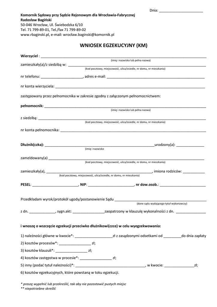 Dnia: ______________________ Komornik Sądowy przy Sądzie Rejonowym dla Wrocławia-Fabrycznej Radosław Bagiński 50-046 Wrocław, Ul. Świebodzka 6/10 Tel. 71 799-89-01, Tel./fax 71 799-89-02 www.rbaginski.pl, e-mail: wrocł[email protected] WNIOSEK EGZEKUCYJNY (KM) Wierzyciel : ___________________________________________________________________________________ (imię i nazwisko lub pełna nazwa) zamieszkały(a)/z siedzibą w: _____________________________________________________________________ (kod pocztowy, miejscowość, ulica/osiedle, nr domu, nr mieszkania) nr telefonu: _____________________, adres e-mail: _________________________________________________ nr konta wierzyciela: ___________________________________________________________________________ zastępowany przez pełnomocnika w zakresie zgodny z załączonym pełnomocnictwem: pełnomocnik: _________________________________________________________________________________ (imię i nazwisko lub pełna nazwa) z siedzibą: ____________________________________________________________________________________ (kod pocztowy, miejscowość, ulica/osiedle, nr domu, nr mieszkania) nr konta pełnomocnika: _________________________________________________________________________ Dłużnik(czka): _______________________________________________________urodzony(a): ______________ (imię i nazwisko zameldowany(a) ______________________________________________________________________________ (kod pocztowy, miejscowość, ulica/osiedle, nr domu, nr mieszkania) zamieszkały(a), _____________________________________________________, imiona rodziców: ___________ (kod pocztowy, miejscowość, ulica/osiedle, nr domu, nr mieszkania) PESEL: _______________________, NIP: _______________________, nr dow.osob.: _______________________ Przedkładam wyrok/protokół ugody/postanowienie Sądu ______________________________________________ (dane sądu wydającego tytuł wykonawczy) z dn. _____________, sygn.akt: ________________zaopatrzony w klauzulę wykonalności z dn. _______________ i wnoszę o wszczęcie egzekucji przeciwko dłużnikowi(czce) w celu wyegzekwowania: 1) należności główne w kwocie*: ___________________zł z zasądzonymi odsetkami od _________do dnia zapłaty 2) kosztów procesów*: ________________ zł; 3) kosztów klauzuli*: ________________ zł; 4) kosztów zastępstwa w procesie*: ________________ zł; 5) inny (podać tytuł należności)*: ___________________________________, w kwocie: _______________zł; 6) kosztów egzekucyjnych, które powstaną w toku egzekucji. * proszę wypełnić lub przekreślić, tak aby nie pozostawić pustych miejsc ** niepotrzebne skreślić Egzekucję proszę prowadzić według następujący sposób */**: [ ] wynagrodzenia za pracę dłużnika: _______________________________________________________________ [ ] ruchomości dłużnika: _________________________________________________________________________ [ ]rachunku bankowego dłużnika nr: _______________________________________________________________ nr: _______________________________________________________________ [ ] innych praw majątkowych/wierzytelności: ________________________________________________________ _____________________________________________________________________________________________ [ ] nieruchomości / spółdzielczego własnościowego prawa do lokalu: _____________________________________ _____________________________________________________________________________________________ * zaznaczyć właściwe **jeżeli wierzyciel nie ma wiedzy w tym zakresie należy wpisać „wg ustaleń komornika” Informacje o dłużniku***: - posiada samochód (marka, model, nr rej.)*: ________________________________________________________ - posiada wartościowe ruchomości*: ______________________________________________________________ - prowadzi działalność gospodarczą*: ______________________________________________________________ - jest właścicielem nieruchomości (działki gruntu, dom, mieszkanie, garaż, itp.)*: ___________________________ _____________________________________________________________________________________________ - posiada udziały w spółkach, spółdzielniach, itp.*: ___________________________________________________ _____________________________________________________________________________________________ - inne*: ______________________________________________________________________________________ _____________________________________________________________________________________________ *** jeżeli wierzyciel nie ma wiedzy w tym zakresie należy wpisać „nie wiem” ________________________________________ (podpis wierzyciela lub pełnomocnika, pieczęć) Oświadczam, że zostałem(am) pouczony(a) zgodnie z art. 136 KPC o obowiązku zawiadamiania o każdej zmianie miejsca swojego zamieszkania i wiem, że w razie zaniedbania tego obowiązku pisma kierowane do mojej osoby pozostaną w aktach sprawy ze skutkiem doręczenia. Oświadczam, że zostałem(am) pouczony(a) o obowiązku informowania organu egzekucyjnego o każdym wydarzeniu mającym wpływ na prowadzenie postępowania egzekucyjnego, w szczególności o obowiązku zgłaszania bezpośrednich wpłat dokonywanych na moją rzecz przez dłużnika w toku prowadzonego postępowania egzekucyjnego. Oświadczam, że zostałem(am) pouczony(a), że w przypadku kiedy dłużnik nie dał podstaw do wszczęcia egzekucji i wywiązuje się z nałożonego na niego przez sąd obowiązku zostanę obciążony(a) przez komornika kosztami niecelowo wszczętej egzekucji. Oświadcza, że dokonuję wyboru komornika Radosława Bagińskiego do prowadzenia niniejszej sprawy na podstawie przepisu art. 8 ust. 5 i 6 ustawy o komornikach sądowych i egzekucji. ________________________________________ (podpis wierzyciela lub pełnomocnika, pieczęć)