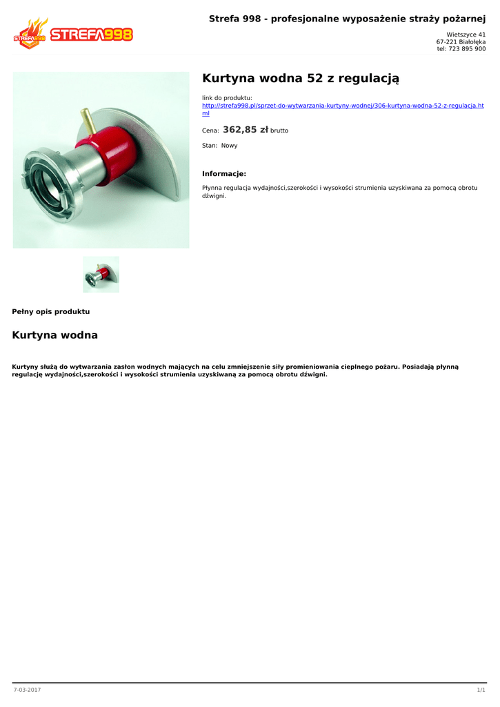 Strefa 998 - profesjonalne wyposażenie straży pożarnej Wietszyce 41 67-221 Białołęka tel: 723 895 900 Kurtyna wodna 52 z regulacją link do produktu: http://strefa998.pl/sprzet-do-wytwarzania-kurtyny-wodnej/306-kurtyna-wodna-52-z-regulacja.ht ml Cena: 362,85 zł brutto Stan: Nowy Informacje: Płynna regulacja wydajności,szerokości i wysokości strumienia uzyskiwana za pomocą obrotu dźwigni. Pełny opis produktu Kurtyna wodna Kurtyny służą do wytwarzania zasłon wodnych mających na celu zmniejszenie siły promieniowania cieplnego pożaru. Posiadają płynną regulację wydajności,szerokości i wysokości strumienia uzyskiwaną za pomocą obrotu dźwigni. 7-03-2017 1/1