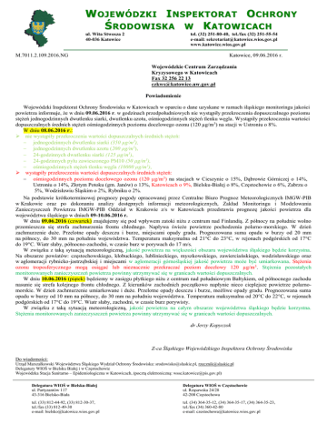 WOJEWÓDZKI INSPEKTORAT OCHRONY ŚRODOWISKA W KATOWICACH ul. Wita Stwosza 2 40-036 Katowice tel. (32) 251-80-40, tel./fax (32) 251-55-54 e-mail: [email protected] www.katowice.wios.gov.pl M.7011.2.109.2016.NG Katowice, 09.06.2016 r. Wojewódzkie Centrum Zarządzania Kryzysowego w Katowicach Fax 32 256 22 13 [email protected] Powiadomienie Wojewódzki Inspektorat Ochrony Środowiska w Katowicach w oparciu o dane uzyskane w ramach śląskiego monitoringu jakości powietrza informuje, że w dniu 09.06.2016 r. w godzinach przedpołudniowych nie wystąpiły przekroczenia dopuszczalnego poziomu stężeń jednogodzinnych dwutlenku siarki, dwutlenku azotu, ośmiogodzinnych stężeń tlenku węgla. Wystąpiły przekroczenia wartości dopuszczalnych średnich stężeń ośmiogodzinnych poziomu docelowego ozonu (120 µg/m 3) na stacji w Ustroniu o 8%. W dniu 08.06.2016 r.: nie wystąpiły przekroczenia wartości dopuszczalnych średnich stężeń: jednogodzinnych dwutlenku siarki (350 µg/m3), jednogodzinnych dwutlenku azotu (200 µg/m3), 24-godzinnych dwutlenku siarki (125 µg/m3), 24-godzinnych pyłu zawieszonego PM10 (50 µg/m3), ośmiogodzinnych stężeń tlenku węgla (10000 µg/m3), wystąpiły przekroczenia wartości dopuszczalnych średnich stężeń: ośmiogodzinnych poziomu docelowego ozonu (120 µg/m3) na stacjach w Cieszynie o 15%, Dąbrowie Górniczej o 14%, Ustroniu o 14%, Złotym Potoku (gm. Janów) o 13%, Katowicach o 9%, Bielsku-Białej o 8%, Częstochowie o 6%, Zabrzu o 5%, Wodzisławiu Śląskim o 2%, Rybniku o 2%. Na podstawie krótkoterminowej prognozy pogody opracowanej przez Centralne Biuro Prognoz Meteorologicznych IMGW-PIB w Krakowie oraz po dokonaniu analizy dostępnych informacji meteorologicznych, Zakład Monitoringu i Modelowania Zanieczyszczeń Powietrza IMGW-PIB Oddział w Krakowie z/s w Katowicach przedstawia prognozę jakości powietrza dla województwa śląskiego w dniach 09-10.06.2016 r. W dniu 09.06.2016 (czwartek) znajdujemy się pod wpływem zatoki niżu z centrum nad Finlandią. Z północy na południe wolno przemieszcza się strefa zachmurzenia frontu chłodnego. Napływa świeże powietrze pochodzenia polarno-morskiego. W dzień zachmurzenie duże. Przelotne opady deszczu i burze, miejscami opady gradu. Prognozowana suma opadu w burzy od 20 mm na północy, do 30 mm na południu województwa. Temperatura maksymalna od 21°C do 23°C, w rejonach podgórskich od 17°C do 19°C. Wiatr słaby, północno-zachodni, w czasie burz w porywach do 17 m/s. W związku z taką sytuacją meteorologiczną, jakość powietrza na większości obszaru województwa śląskiego będzie korzystna. Na obszarze powiatów: częstochowskiego, kłobuckiego, lublinieckiego, myszkowskiego, zawierciańskiego, wodzisławskiego oraz w aglomeracji rybnicko-jastrzębskiej i miejscami w aglomeracji górnośląskiej jakość powietrza może być umiarkowana. Stężenia ozonu troposferycznego mogą osiągać lub nieznacznie przekraczać poziom docelowy 120 µg/m 3. Stężenia pozostałych monitorowanych zanieczyszczeń powietrza powinny utrzymywać się w granicach wartości dopuszczalnych. W dniu 10.06.2016 (piątek) będziemy w zasięgu płytkiego niżu z centrum nad południowym Bałtykiem, od północnego zachodu nasunie się strefa kolejnego frontu chłodnego. Z kierunków zachodnich początkowo napłynie nieco cieplejsze powietrze polarnomorskie. W dzień zachmurzenie umiarkowane i duże. Przelotne opady deszczu i burze, możliwe opady gradu. Prognozowana suma opadu w burzy od 10 mm na północy, do 30 mm na południu województwa. Temperatura maksymalna od 20°C do 22°C, w rejonach podgórskich od 17°C do 19°C. Wiatr słaby, zachodni, w czasie burz porywisty. W związku z taką sytuacją meteorologiczną, jakość powietrza na całym obszarze województwa śląskiego będzie korzystna. Stężenia monitorowanych zanieczyszczeń powietrza powinny utrzymywać się w granicach wartości dopuszczalnych. dr Jerzy Kopyczok Z-ca Śląskiego Wojewódzkiego Inspektora Ochrony Środowiska Do wiadomości: Urząd Marszałkowski Województwa Śląskiego Wydział Ochrony Środowiska: [email protected], [email protected] Delegatury WIOŚ w Bielsku Białej i w Częstochowie Wojewódzka Stacja Sanitarno – Epidemiologiczna w Katowicach, (pocztą elektroniczną: [email protected]) Delegatura WIOŚ w Bielsku-Białej ul. Partyzantów 117 43-316 Bielsko-Biała Delegatura WIOŚ w Częstochowie ul. Rząsawska 24/28 42-200 Częstochowa tel. (33) 812-44-92, (33) 812-30-37, tel./fax (33) 812-49-30 e-mail: [email protected] tel. (34) 364-35-12, (34) 364-35-17, (34) 364-35-23, tel./fax (34) 360-42-80 e-mail: [email protected]