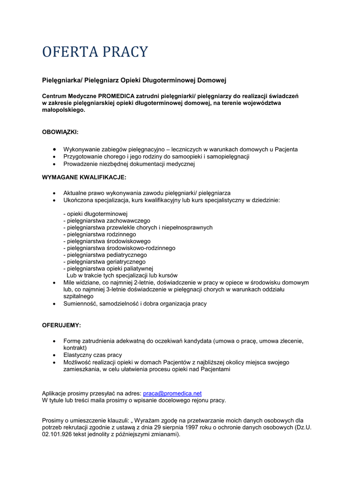 OFERTA PRACY Pielęgniarka/ Pielęgniarz Opieki Długoterminowej Domowej Centrum Medyczne PROMEDICA zatrudni pielęgniarki/ pielęgniarzy do realizacji świadczeń w zakresie pielęgniarskiej opieki długoterminowej domowej, na terenie województwa małopolskiego. OBOWIĄZKI: Wykonywanie zabiegów pielęgnacyjno – leczniczych w warunkach domowych u Pacjenta Przygotowanie chorego i jego rodziny do samoopieki i samopielęgnacji Prowadzenie niezbędnej dokumentacji medycznej WYMAGANE KWALIFIKACJE: Aktualne prawo wykonywania zawodu pielęgniarki/ pielęgniarza Ukończona specjalizacja, kurs kwalifikacyjny lub kurs specjalistyczny w dziedzinie: - opieki długoterminowej - pielęgniarstwa zachowawczego - pielęgniarstwa przewlekle chorych i niepełnosprawnych - pielęgniarstwa rodzinnego - pielęgniarstwa środowiskowego - pielęgniarstwa środowiskowo-rodzinnego - pielęgniarstwa pediatrycznego - pielęgniarstwa geriatrycznego - pielęgniarstwa opieki paliatywnej Lub w trakcie tych specjalizacji lub kursów Mile widziane, co najmniej 2-letnie, doświadczenie w pracy w opiece w środowisku domowym lub, co najmniej 3-letnie doświadczenie w pielęgnacji chorych w warunkach oddziału szpitalnego Sumienność, samodzielność i dobra organizacja pracy OFERUJEMY: Formę zatrudnienia adekwatną do oczekiwań kandydata (umowa o pracę, umowa zlecenie, kontrakt) Elastyczny czas pracy Możliwość realizacji opieki w domach Pacjentów z najbliższej okolicy miejsca swojego zamieszkania, w celu ułatwienia procesu opieki nad Pacjentami Aplikacje prosimy przesyłać na adres: [email protected] W tytule lub treści maila prosimy o wpisanie docelowego rejonu pracy. Prosimy o umieszczenie klauzuli: „ Wyrażam zgodę na przetwarzanie moich danych osobowych dla potrzeb rekrutacji zgodnie z ustawą z dnia 29 sierpnia 1997 roku o ochronie danych osobowych (Dz.U. 02.101.926 tekst jednolity z późniejszymi zmianami).
