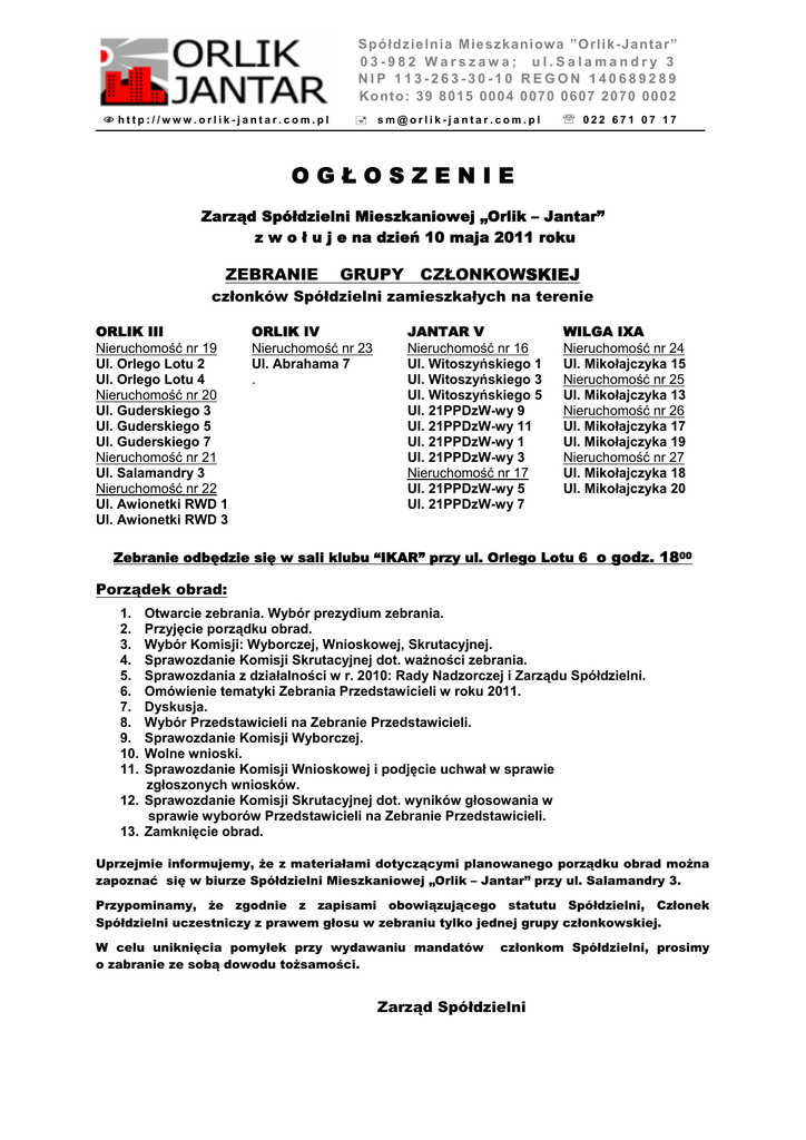 S p ó łdz ielnia Miesz kaniow a ”Orlik-Jantar” 03-982 Warszawa; ul.Salamandry 3 NIP 113-263-30-10 REGON 140689289 Ko nt o: 39 8 015 000 4 0 070 060 7 2 070 000 2 http://www.orlik-jantar.com.pl [email protected] ℡ 022 671 07 17 OGŁOSZENIE Zarząd Spółdzielni Mieszkaniowej „Orlik – Jantar” z w o ł u j e na dzień 10 maja 2011 roku ZEBRANIE GRUPY CZŁONKOWSKIEJ członków Spółdzielni zamieszkałych na terenie ORLIK III Nieruchomość nr 19 Ul. Orlego Lotu 2 Ul. Orlego Lotu 4 Nieruchomość nr 20 Ul. Guderskiego 3 Ul. Guderskiego 5 Ul. Guderskiego 7 Nieruchomość nr 21 Ul. Salamandry 3 Nieruchomość nr 22 Ul. Awionetki RWD 1 Ul. Awionetki RWD 3 ORLIK IV Nieruchomość nr 23 Ul. Abrahama 7 . JANTAR V Nieruchomość nr 16 Ul. Witoszyńskiego 1 Ul. Witoszyńskiego 3 Ul. Witoszyńskiego 5 Ul. 21PPDzW-wy 9 Ul. 21PPDzW-wy 11 Ul. 21PPDzW-wy 1 Ul. 21PPDzW-wy 3 Nieruchomość nr 17 Ul. 21PPDzW-wy 5 Ul. 21PPDzW-wy 7 WILGA IXA Nieruchomość nr 24 Ul. Mikołajczyka 15 Nieruchomość nr 25 Ul. Mikołajczyka 13 Nieruchomość nr 26 Ul. Mikołajczyka 17 Ul. Mikołajczyka 19 Nieruchomość nr 27 Ul. Mikołajczyka 18 Ul. Mikołajczyka 20 Zebranie odbędzie się w sali klubu “IKAR” przy ul. Orlego Lotu 6 o godz. 1800 Porządek obrad: 1. 2. 3. 4. 5. 6. 7. 8. 9. 10. 11. Otwarcie zebrania. Wybór prezydium zebrania. Przyjęcie porządku obrad. Wybór Komisji: Wyborczej, Wnioskowej, Skrutacyjnej. Sprawozdanie Komisji Skrutacyjnej dot. ważności zebrania. Sprawozdania z działalności w r. 2010: Rady Nadzorczej i Zarządu Spółdzielni. Omówienie tematyki Zebrania Przedstawicieli w roku 2011. Dyskusja. Wybór Przedstawicieli na Zebranie Przedstawicieli. Sprawozdanie Komisji Wyborczej. Wolne wnioski. Sprawozdanie Komisji Wnioskowej i podjęcie uchwał w sprawie zgłoszonych wniosków. 12. Sprawozdanie Komisji Skrutacyjnej dot. wyników głosowania w sprawie wyborów Przedstawicieli na Zebranie Przedstawicieli. 13. Zamknięcie obrad. Uprzejmie informujemy, że z materiałami dotyczącymi planowanego porządku obrad można zapoznać się w biurze Spółdzielni Mieszkaniowej „Orlik – Jantar” przy ul. Salamandry 3. Przypominamy, że zgodnie z zapisami obowiązującego statutu Spółdzielni, Członek Spółdzielni uczestniczy z prawem głosu w zebraniu tylko jednej grupy członkowskiej. W celu uniknięcia pomyłek przy wydawaniu mandatów o zabranie ze sobą dowodu tożsamości. członkom Spółdzielni, prosimy Zarząd Spółdzielni