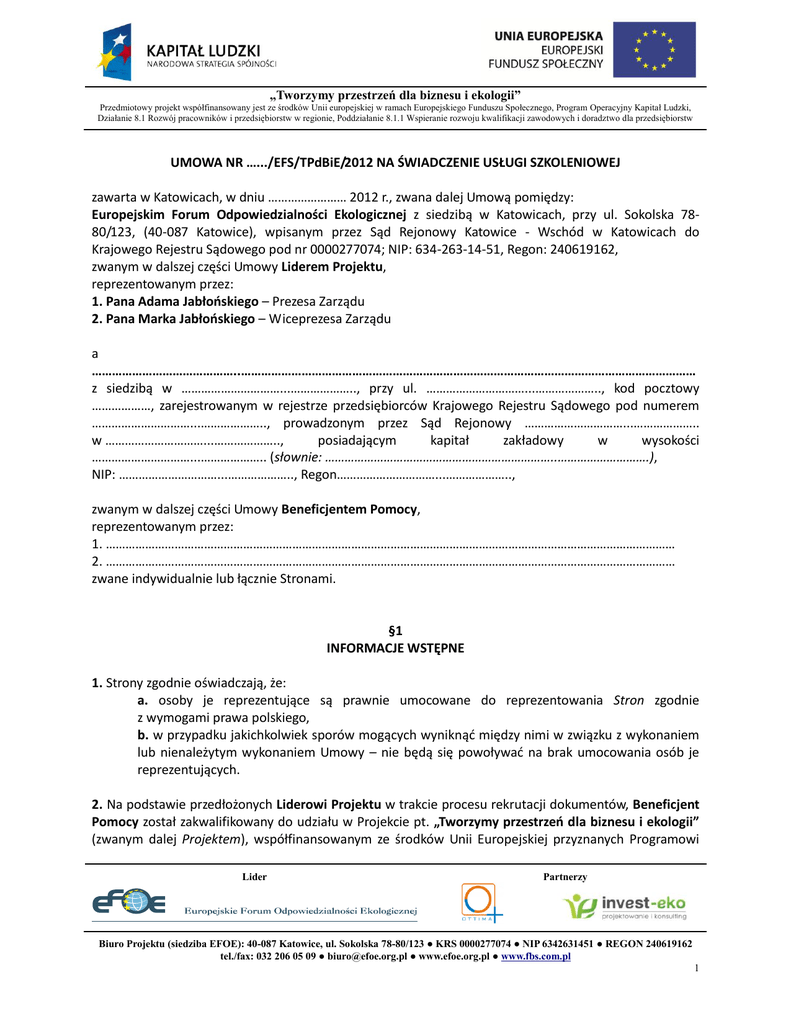 „Tworzymy przestrzeń dla biznesu i ekologii” Przedmiotowy projekt współfinansowany jest ze środków Unii europejskiej w ramach Europejskiego Funduszu Społecznego, Program Operacyjny Kapitał Ludzki, Działanie 8.1 Rozwój pracowników i przedsiębiorstw w regionie, Poddziałanie 8.1.1 Wspieranie rozwoju kwalifikacji zawodowych i doradztwo dla przedsiębiorstw UMOWA NR ….../EFS/TPdBiE/2012 NA ŚWIADCZENIE USŁUGI SZKOLENIOWEJ zawarta w Katowicach, w dniu …………………… 2012 r., zwana dalej Umową pomiędzy: Europejskim Forum Odpowiedzialności Ekologicznej z siedzibą w Katowicach, przy ul. Sokolska 7880/123, (40-087 Katowice), wpisanym przez Sąd Rejonowy Katowice - Wschód w Katowicach do Krajowego Rejestru Sądowego pod nr 0000277074; NIP: 634-263-14-51, Regon: 240619162, zwanym w dalszej części Umowy Liderem Projektu, reprezentowanym przez: 1. Pana Adama Jabłońskiego – Prezesa Zarządu 2. Pana Marka Jabłońskiego – Wiceprezesa Zarządu a ……………………………………..……………………………………………………………………………………………………………………… z siedzibą w …………………………...……………….., przy ul. …………………………...……………….., kod pocztowy ………………, zarejestrowanym w rejestrze przedsiębiorców Krajowego Rejestru Sądowego pod numerem …………………………...……………….., prowadzonym przez Sąd Rejonowy …………………………...……………….. w …………………………...……………….., posiadającym kapitał zakładowy w wysokości …………………………...……………….. (słownie: ……………………………………………………………..……………………….), NIP: …………………………...……………….., Regon…………………………...……………….., zwanym w dalszej części Umowy Beneficjentem Pomocy, reprezentowanym przez: 1. ………………………………………………………………………………………………………………………………………………………… 2. ………………………………………………………………………………………………………………………………………………………… zwane indywidualnie lub łącznie Stronami. §1 INFORMACJE WSTĘPNE 1. Strony zgodnie oświadczają, że: a. osoby je reprezentujące są prawnie umocowane do reprezentowania Stron zgodnie z wymogami prawa polskiego, b. w przypadku jakichkolwiek sporów mogących wyniknąć między nimi w związku z wykonaniem lub nienależytym wykonaniem Umowy – nie będą się powoływać na brak umocowania osób je reprezentujących. 2. Na podstawie przedłożonych Liderowi Projektu w trakcie procesu rekrutacji dokumentów, Beneficjent Pomocy został zakwalifikowany do udziału w Projekcie pt. „Tworzymy przestrzeń dla biznesu i ekologii” (zwanym dalej Projektem), współfinansowanym ze środków Unii Europejskiej przyznanych Programowi Lider Partnerzy Biuro Projektu (siedziba EFOE): 40-087 Katowice, ul. Sokolska 78-80/123 ● KRS 0000277074 ● NIP 6342631451 ● REGON 240619162 tel./fax: 032 206 05 09 ● [email protected] ● www.efoe.org.pl ● www.fbs.com.pl 1 „Tworzymy przestrzeń dla biznesu i ekologii” Przedmiotowy projekt współfinansowany jest ze środków Unii europejskiej w ramach Europejskiego Funduszu Społecznego, Program Operacyjny Kapitał Ludzki, Działanie 8.1 Rozwój pracowników i przedsiębiorstw w regionie, Poddziałanie 8.1.1 Wspieranie rozwoju kwalifikacji zawodowych i doradztwo dla przedsiębiorstw Operacyjnemu Kapitał Ludzki, Priorytet VIII Regionalne kadry gospodarki, Działanie 8.1 Rozwój pracowników i przedsiębiorstw w regionie, Poddziałanie 8.1.1 Wspieranie wzrostu kwalifikacji zawodowych i doradztwo dla przedsiębiorstw w ramach Europejskiego Funduszu Społecznego. 3. Na podstawie art. 38 Ustawy z dnia 30 kwietnia 2004 r. o postępowaniu w sprawach dotyczących pomocy publicznej, Lider Projektu informuje o braku obowiązku uprzedniej notyfikacji Komisji Europejskiej o pomocy publicznej udzielanej na podstawie niniejszej Umowy. §2 OŚWIADCZENIA STRON 1. Lider Projektu oświadcza, że: a. zawarł w dniu 17.08.2011 r. umowę z Samorządem Województwa Śląskiego - Wojewódzkim Urzędem Pracy w Katowicach (Instytucją Pośredniczącą II Stopnia) nr UDA-POKL.08.01.01-24412/10-00 na dofinansowanie projektu szkoleniowego pt. „Tworzenie przestrzeni dla biznesu i ekologii”, kierowanego do przedsiębiorstw działających na terenie województwa śląskiego i ich pracowników. b. szkolenia i egzaminy w ramach Projektu będą realizowane - na mocy zawartej w dniu 28.03.2011 r. umowy partnerstwa na rzecz realizacji Projektu pt. „Tworzenie przestrzeni dla biznesu i ekologii”- przez Lidera Projektu oraz Partnera 1 (Ottima Plus Sp. z o.o.) i Partnera 2 (Invest-Eko Arkadiusz Primus). 2. Beneficjent Pomocy oświadcza, że: a. wszystkie dane Pracowników delegowanych przez niego na szkolenia (zwanych dalej Uczestnikami Projektu) przedstawione w toku procedury rekrutacyjnej są zgodne z prawdą i aktualne na dzień podpisania niniejszej Umowy, b. zobowiązuje się do bezzwłocznego (nie później jednak niż w terminie 14 dni od daty zaistnienia przesłanki uzasadniającej dokonanie zmiany) informowania Lidera Projektu o zmianie danych dotyczących Beneficjenta Pomocy, w szczególności zaś zmianie danych podstawowych tj. wielkości przedsiębiorstwa oraz danych teleadresowych, c. wszystkie osoby zgłoszone przez Beneficjenta Pomocy do udziału w szkoleniach są jego Pracownikami zgodnie z art. 2 Kodeksu Pracy tzn. są przez niego zatrudnione na podstawie umowy o pracę lub umowę cywilno-prawnej – zgodnie z oświadczeniem o zatrudnieniu przedłożonym w trakcie procesu rekrutacyjnego i stanowiącym załącznik nr 1 do nini