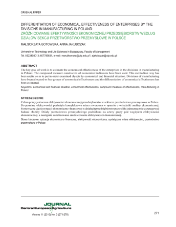 ORIGINAL PAPER DIFFERENTIATION OF ECONOMICAL EFFECTIVENESS OF ENTERPRISES BY THE DIVISIONS IN MANUFACTURING IN POLAND ZRÓŻNICOWANIE EFEKTYWNOŚCI EKONOMICZNEJ PRZEDSIĘBIORSTW WEDŁUG DZIAŁÓW SEKCJI PRZETWÓRSTWO PRZEMYSŁOWE W POLSCE MAŁGORZATA GOTOWSKA, ANNA JAKUBCZAK University of Technology and Life Sciences in Bydgoszczy, Faculty of Management Tel. 0523408013; 607789831, e-mail: [email protected]*; [email protected] ABSTRACT The key goal of work is to estimate the economical effectiveness of the enterprises in the divisions in manufacturing in Poland. The compound measure constructed of economical indicators have been used. This methodical way has been useful so as to put in order examined objects by economical and financial situation. Divisions of manufacturing have been allocated to four groups of economical effectiveness and the differentiation of economical effectiveness has been estimated. Keywords: economical and financial situation, economical effectiveness, compound measure of effectiveness, manufacturing in Poland STRESZCZENIE Celem pracy jest ocena efektywności ekonomicznej przedsiębiorstw w sektorze przetwórstwo przemysłowe w Polsce. Do pomiaru efektywności posłużyła kompleksowa miara stworzona w oparciu o wskaźniki analizy ekonomicznej. Syntetyczne ujęcie sytuacji ekonomiczno-finansowej w działach przedsiębiorstw pozwoliło jednoznacznie uszeregować badane obiekty. Działy przetwórstwa przemysłowego podzielono na cztery grupy pod względem efektywności ekonomicznej, a następnie zanalizowano zróżnicowanie efektywności ekonomicznej. Słowa kluczowe: sytuacja ekonomiczno finansowa, efektywność ekonomiczna, syntetyczna miara efektywności, przetwórstwo przemysłowe w Polsce Volume 11 (2010) No. 3 (271-278) 271 MAŁGORZATA GOTOWSKA, ANNA JAKUBCZAK DETAILED ABSTRACT The key goal of work is to estimate the economical effectiveness of the enterprises in the divisions in manufacturing in Poland. Statistical data of GUS (Central Statistical Office of Poland) concerning the finances of enterprises has been analysed. The data have been presented in: „Bilansowe wyniki finansowe podmiotów gospodarczych w 2006 r.” The compound measure constructed of economical indicators have been used. The following stages can be distinguished in the process of compound measure of development creation: initial variables are chosen and then diagnostic variables are chosen according to definite premises (using Hellwig’s parametric metod); characteristics are made comparable; the taxonomic pattern is created; taxonomic distances from pattern are calculated; the taxonomic measure is marked out; objects are set in order according to the level of taxonomic measure that has been reached; objects are grouped according to the degree of internal homogeneity of individual subsets. Diagnostic variables, which are used to construct compound measure were chosen from the list of primary indicators taken from economic analysis. These indicators can be arranged into the following groups: profitability ratios, liquidity and solvency ratios, efficiency ratios, debts ratios. As the result of diagnostic variables choice procedure the 6 variables were selected out of the 18 initial ones. This methodical way has been useful so as to put in order examined objects by economical and financial situation. Divisions of manufacturing have been allocated to four groups of economical effectiveness and the differentiation of economical effectiveness has been estimated. Conducted audits permitted to get the cognition in structure of level the economical effectiveness. The weakest economical effectiveness be characterized by with: the production of medical instruments of, precise and optical, clocks and watches; the textile industry as well as production of pieces of furniture together with the activity elsewhere productive classified. The highest and approximate level of efficiency of farming was observed in sections: the cokemaking, products of refinement and nuclear fuels; the production of metals and production of final metal goods, from the trip - out the machine engines and devices. WSTĘP Efektywność ekonomiczna, zwana także efektywnością gospodarowania [5] jako podstawowa kategoria służąca określaniu możliwości przetrwania i rozwoju przedsiębiorstw jest pojęciem szerokim. To sprawia, że wielu autorów różnie podchodzi do jej interpretowania, a zwłaszcza do pomiaru efektywności ekonomicznej 272 [13]. Ogólne zbadanie efektywności ekonomicznej i jej jednoznaczna ocena przysparza trudności. Spotyka się kilka proponowanych rozwiązań w tym zakresie. Przede wszystkim stosowane są wskaźniki z analizy ekonomicznej. Wybór tych wskaźników podyktowany jest celem analizy. Proponowane są rozwiązania takie jak: systemy wielu wskaźników, ograniczenie się do analizy tylko kilku najważniejszych wskaźników lub tworzenie miar syntetycznych [4, 2]. W analizach dotyczących różnych fragmentów efektywności ekonomicznej wybierane są grupy lub systemy wskaźników, które reprezentują badaną sferę zainteresowań. W pracy natomiast zastosowano podejście kompleksowe co do konstrukcji zastosowanej miary. Celem badań było jak najpełniejsze odzwierciedlenie efektywności gospodarowania, wykorzystano więc wskaźniki pochodzące z wielu obszarów ekonomicznej analizy wskaźnikowej i utworzono z nich miernik syntetyczny. W badaniach dotyczących zróżnicowania obiektów wielocechowych najczęściej stosowane są miary syntetyczne, uzyskiwane poprzez agregację zmiennych, należących do zbioru cech diagnostycznych charakteryzujących badane zjawisko. Syntetyczny miernik rozwoju jest sprawdzoną miarą posiadającą wiele zalet. Przede wszystkim pozwala na przejście z opisu wielowymiarowego na jednowymiarowy, gdyż analizowane obiekty wielocechowe są opisywane za pomocą jednej zagregowanej wielkości tzw. zmiennej syntetycznej, co z kolei daje możliwość porównywania i p