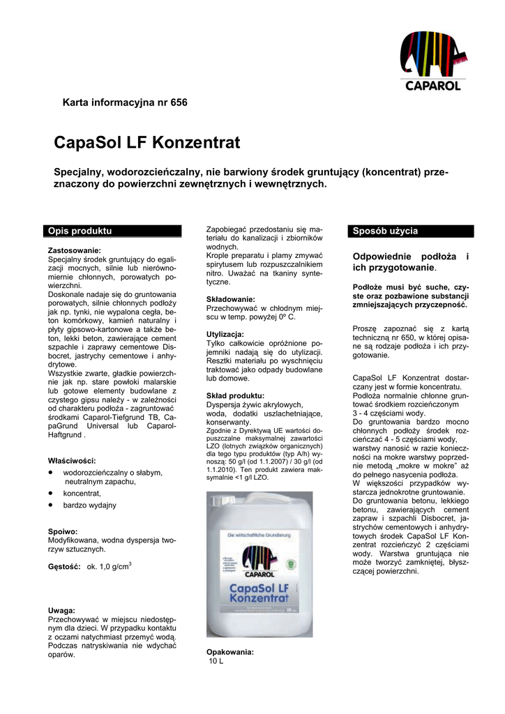 Karta informacyjna nr 656 CapaSol LF Konzentrat Specjalny, wodorozcieńczalny, nie barwiony środek gruntujący (koncentrat) przeznaczony do powierzchni zewnętrznych i wewnętrznych. Opis produktu Zastosowanie: Specjalny środek gruntujący do egalizacji mocnych, silnie lub nierównomiernie chłonnych, porowatych powierzchni. Doskonale nadaje się do gruntowania porowatych, silnie chłonnych podłoży jak np. tynki, nie wypalona cegła, beton komórkowy, kamień naturalny i płyty gipsowo-kartonowe a także beton, lekki beton, zawierające cement szpachle i zaprawy cementowe Disbocret, jastrychy cementowe i anhydrytowe. Wszystkie zwarte, gładkie powierzchnie jak np. stare powłoki malarskie lub gotowe elementy budowlane z czystego gipsu należy - w zależności od charakteru podłoża - zagruntować środkami Caparol-Tiefgrund TB, CapaGrund Universal lub CaparolHaftgrund . Właściwości: • wodorozcieńczalny o słabym, neutralnym zapachu, • • koncentrat, Zapobiegać przedostaniu się materiału do kanalizacji i zbiorników wodnych. Krople preparatu i plamy zmywać spirytusem lub rozpuszczalnikiem nitro. Uważać na tkaniny syntetyczne. Składowanie: Przechowywać w chłodnym miejscu w temp. powyżej 0º C. Utylizacja: Tylko całkowicie opróżnione pojemniki nadają się do utylizacji. Resztki materiału po wyschnięciu traktować jako odpady budowlane lub domowe. Skład produktu: Dyspersja żywic akrylowych, woda, dodatki uszlachetniające, konserwanty. Zgodnie z Dyrektywą UE wartości dopuszczalne maksymalnej zawartości LZO (lotnych związków organicznych) dla tego typu produktów (typ A/h) wynoszą: 50 g/l (od 1.1.2007) / 30 g/l (od 1.1.2010). Ten produkt zawiera maksymalnie <1 g/l LZO. bardzo wydajny Spoiwo: Modyfikowana, wodna dyspersja tworzyw sztucznych. Gęstość: ok. 1,0 g/cm3 Uwaga: Przechowywać w miejscu niedostępnym dla dzieci. W przypadku kontaktu z oczami natychmiast przemyć wodą. Podczas natryskiwania nie wdychać oparów. Opakowania: 10 L Sposób użycia Odpowiednie podłoża ich przygotowanie. i Podłoże musi być suche, czyste oraz pozbawione substancji zmniejszających przyczepność. Proszę zapoznać się z kartą techniczną nr 650, w której opisane są rodzaje podłoża i ich przygotowanie. CapaSol LF Konzentrat dostarczany jest w formie koncentratu. Podłoża normalnie chłonne gruntować środkiem rozcieńczonym 3 - 4 częściami wody. Do gruntowania bardzo mocno chłonnych podłoży środek rozcieńczać 4 - 5 częściami wody, warstwy nanosić w razie konieczności na mokre warstwy poprzednie metodą „mokre w mokre” aż do pełnego nasycenia podłoża. W większości przypadków wystarcza jednokrotne gruntowanie. Do gruntowania betonu, lekkiego betonu, zawierających cement zapraw i szpachli Disbocret, jastrychów cementowych i anhydrytowych środek CapaSol LF Konzentrat rozcieńczyć 2 częściami wody. Warstwa gruntująca nie może tworzyć zamkniętej, błyszczącej powierzchni. Zużycie: W zależności od zastosowania, właściwości podłoża a także stopnia rozcieńczenia ok. 50 - 200 ml/m2. Dokładne zużycie można ustalić wyłącznie w praktyce na powierzchni próbnej. Sposób nakładania: CapaSol LF Konzentrat obficie nakładać i dobrze wcierać w podłoże pędzlem lub szczotką. Natryskiwanie lub nakładanie wałkiem także jest możliwe, ale mniej skuteczne. Natrysk airless: kąt natrysku : 20 - 50° dysza : 0,015" ciśnienie : 60 bar Narzędzia natychmiast po użyciu myć wodą. Doradztwo techniczne W karcie niniejszej niemożliwe jest opisanie sposobów przygotowania wszystkich występujących w praktyce podłoży. W przypadkach, które nie zostały opisane powyżej, pomocnym może okazać się kontakt z naszym Działem technicznym. Chętnie udzielimy Państwu szczegółowych informacji związanych z konkretnym obiektem. Tel. (22) 544 20 40 Fax (22) 544 20 41 [email protected] Rozcieńczenie: Wodą. Minimalna temperatura użycia: +5° C (otoczenia, podłoża i materiału). Czas schnięcia: W temp. +20°C i względnej wilgotności powietrza 65% warstwa jest powierzchniowo sucha i nadaje się do powtórnego malowania po 12 godz. W niższych temperaturach i przy wyższej wilgotności powietrza czas ten ulega wydłużeniu. Uwaga: Nie stosować na powierzchniach poziomych narażonych na długotrwałe działanie wody. Techniczna karta informacyjna Nr 655. Stan: kwiecień 2007 2 Niniejsza karta informacyjna została sporządzona na bazie najnowszych osiągnięć techniki i naszych doświadczeń. Ze względu na różnorodność możliwych podłoży i warunków wykonawstwa każdorazowy Kupujący / Użytkownik jest zobowiązany sprawdzić na własną odpowiedzialność przydatność naszych produktów do zamierzonego celu przy każdorazowym uwzględnieniu warunków obiektowych wykonawstwa oraz wymogów i zasad sztuki i rzemiosła. Po ukazaniu się następnej wersji niniejsza karta traci swoją ważność. Caparol Polska Sp. z o. o.; ul. Baletowa 5C; PL – 02-867 Warszawa; tel. 022 544 20 40, faks 022 544 20 41; internet: www.caparol.com.pl Caparol Farben Lacke Bautenschutz GmbH; Roßdörfer Straße 50; D – 64372 Ober Ramstadt; tel. +49 6154 71-0; faks +49 6154 711391; internet: www.caparol.de