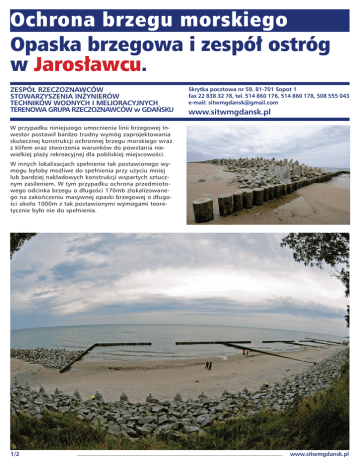 Ochrona brzegu morskiego Opaska brzegowa i zespół ostróg w Jarosławcu. ZESPÓŁ RZECZOZNAWCÓW STOWARZYSZENIA INŻYNIERÓW TECHNIKÓW WODNYCH I MELIORACYJNYCH TERENOWA GRUPA RZECZOZNAWCÓW w GDAŃSKU Skrytka pocztowa nr 59, 81-701 Sopot 1 fax 22 838 32 78, tel. 514 860 176, 514 860 178, 508 555 043 e-mail: [email protected] www.sitwmgdansk.pl W przypadku niniejszego umocnienia linii brzegowej Inwestor postawił bardzo trudny wymóg zaprojektowania skutecznej konstrukcji ochronnej brzegu morskiego wraz z klifem oraz stworzenia warunków do powstania niewielkiej plaży rekreacyjnej dla pobliskiej miejscowości. W innych lokalizacjach spełnienie tak postawionego wymogu byłoby możliwe do spełnienia przy użyciu mniej lub bardziej nakładowych konstrukcji wspartych sztucznym zasileniem. W tym przypadku ochrona przedmiotowego odcinka brzegu o długości 170mb zlokalizowanego na zakończeniu masywnej opaski brzegowej o długości około 1000m z tak postawionymi wymogami teoretycznie było nie do spełnienia. 1/2 www.sitwmgdansk.pl Ochrona brzegu morskiego Opaska brzegowa i zespół ostróg w Jarosławcu. ZESPÓŁ RZECZOZNAWCÓW STOWARZYSZENIA INŻYNIERÓW TECHNIKÓW WODNYCH I MELIORACYJNYCH TERENOWA GRUPA RZECZOZNAWCÓW w GDAŃSKU Skrytka pocztowa nr 59, 81-701 Sopot 1 fax 22 838 32 78, tel. 514 860 176, 514 860 178, 508 555 043 e-mail: [email protected] Zaproponowano rozwiązanie sprzeczne z zaleceniami podręcznikowymi określającymi sposoby kształtowania budowli ochronnych. jednak nie spowodowałyby sedymentacji rumowiska na przedmiotowym odcinku brzegu i utworzenia nawet bardzo skromnej plaży, żeby efekt sedymentacji wymusić a zdeponowane w tym miejscu rumowisko zatrzymać w miejscu gdzie nie było uwarunkowań do tworzenia plaży ostrogi wyposażono w poprzeczki, przerwa pomiędzy sąsiednimi poprzeczkami wynosi 20m przy rozstawie ostróg 60m. Umocnienie brzegu zaprojektowano jako system dwóch budowli: zespołu czterech ostróg brzegowych typu L i T oraz opaski brzegowej narzutowej zlokalizowanej u podnóża zbocza klifu. Opaska brzegowa została zaprojektowana w postaci narzutu ochronnego z kamienia granitowego, z rdzeniem wykonanym z gwiazdobloków 5T, długość całkowita opaski narzutowej 176mb, rzędna korony opaski +3,50m npm, zespół ostróg brzegowych został zaprojektowany z ostróg o długości 40m od istniejącego brzegu do linii odmorskiej sąsiadującego umocnienia brzegowego, ostrogi zatem schowano w cieniu erozyjnym sąsiedniej istniejącej opaski, same proste ostrogi BYŁO 2/2 www.sitwmgdansk.pl Uzyskany efekt spełnił oczekiwania Inwestora oraz okolicznych mieszkańców. Zbocze klifowe zostało ustabilizowane poprzez odcięcie abrazji morskiej od jego podnóża a system ostróg wytworzył obszar wzmożonej sedymentacji która uaktywnia się po zimowo – wiosennych sztormach tworząc plażę w miejscu gdzie jej nie było i nigdy by nie powstała. JEST www.sitwmgdansk.pl