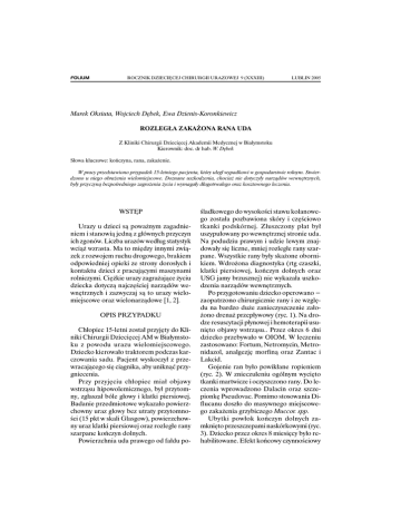 FOLIUM 142 ROCZNIK DZIECIĘCEJ CHIRURGII URAZOWEJ 9 (XXXIII) M. Oksiuta, W. Dębek, E. Dzienis-Koronkiewicz LUBLIN 2005 Marek Oksiuta, Wojciech Dębek, Ewa Dzienis-Koronkiewicz ROZLEGŁA ZAKAŻONA RANA UDA Z Kliniki Chirurgii Dziecięcej Akademii Medycznej w Białymstoku Kierownik: doc. dr hab. W. Dębek Słowa kluczowe: kończyna, rana, zakażenie. W pracy przedstawiono przypadek 15-letniego pacjenta, który uległ wypadkowi w gospodarstwie rolnym. Stwierdzono u niego obrażenia wielomiejscowe. Doznane uszkodzenia, chociaż nie dotyczyły narządów wewnętrznych, były przyczyną bezpośredniego zagrożenia życia i wymagały długotrwałego oraz kosztownego leczenia. WSTĘP Urazy u dzieci są poważnym zagadnieniem i stanowią jedną z głównych przyczyn ich zgonów. Liczba urazów według statystyk wciąż wzrasta. Ma to między innymi związek z rozwojem ruchu drogowego, brakiem odpowiedniej opieki ze strony dorosłych i kontaktu dzieci z pracującymi maszynami rolniczymi. Ciężkie urazy zagrażające życiu dziecka dotyczą najczęściej narządów wewnętrznych i zazwyczaj są to urazy wielomiejscowe oraz wielonarządowe [1, 2]. OPIS PRZYPADKU Chłopiec 15-letni został przyjęty do Kliniki Chirurgii Dziecięcej AM w Białymstoku z powodu urazu wielomiejscowego. Dziecko kierowało traktorem podczas karczowania sadu. Pacjent wyskoczył z przewracającego się ciągnika, aby uniknąć przygniecenia. Przy przyjęciu chłopiec miał objawy wstrząsu hipowolemicznego, był przytomny, zgłaszał bóle głowy i klatki piersiowej. Badanie przedmiotowe wykazało powierzchowny uraz głowy bez utraty przytomności (15 pkt w skali Glasgow), powierzchowny uraz klatki piersiowej oraz rozległe rany szarpane kończyn dolnych. Powierzchnia uda prawego od fałdu po- śladkowego do wysokości stawu kolanowego została pozbawiona skóry i częściowo tkanki podskórnej. Złuszczony płat był uszypułowany po wewnętrznej stronie uda. Na podudziu prawym i udzie lewym znajdowały się liczne, mniej rozległe rany szarpane. Wszystkie rany były skażone obornikiem. Wdrożona diagnostyka (rtg czaszki, klatki piersiowej, kończyn dolnych oraz USG jamy brzusznej) nie wykazała uszkodzenia narządów wewnętrznych. Po przygotowaniu dziecko operowano − zaopatrzono chirurgicznie rany i ze względu na bardzo duże zanieczyszczenie założono drenaż przepływowy (ryc. 1). Na drodze resuscytacji płynowej i hemoterapii usunięto objawy wstrząsu.. Przez okres 6 dni dziecko przebywało w OIOM. W leczeniu zastosowano: Fortum, Netromycin, Metronidazol, analgezję morfiną oraz Zantac i Lakcid. Gojenie ran było powikłane ropieniem (ryc. 2). W znieczuleniu ogólnym wycięto tkanki martwicze i oczyszczono rany. Do leczenia wprowadzono Dalacin oraz szczepionkę Pseudovac. Pomimo stosowania Diflucanu doszło do masywnego miejscowego zakażenia grzybiczego Muccor. spp. Ubytki powłok kończyn dolnych zamknięto przeszczepami naskórkowymi (ryc. 3). Dziecko przez okres 8 miesięcy było rehabilitowane. Efekt końcowy czynnościowy Rozległa zakażona rana uda i kosmetyczny po 4 latach od urazu jest dobry. OMÓWIENIE Przedstawiony przypadek uzmysłowił nam, że doznane obrażenia chociaż nie dotyczyły narządów wewnętrznych były przy- Ryc. 1. Drenaż zanieczyszczonej obornikiem rany Fig. 1. Drainage of the wound contaminated with dung Ryc. 3. Stan bezpośrednio po zagojeniu rany Fig. 3. The healed wound 143 czyną bezpośredniego zagrożenia życia i wymagały długotrwałego, kosztownego leczenia: ponad miesięcznej hospitalizacji, leczenia wstrząsu pourazowego, antybiotykoterapii o szerokim spektrum, hemoterapii oraz trzykrotnego zabiegu operacyjnego. Ryc. 2. Zropienie rany − stan po oczyszczeniu z martwicy Fig. 2. Purulence of the wound − condition after scouring the necrotic tissue 144 M. Oksiuta, W. Dębek, E. Dzienis-Koronkiewicz PIŚMIENNICTWO 1. Schanchez J.I., Paidas C.: Childhood trauma. Now an in the new millenium. Surg. Clin. of North Am., 1999, 79 (6), 1503. 2. Suominen P., Kivioja A., Ohman J., Korpela R., Rintala R., Olkkola K.T.: Severe and fatal childhood trauma. Injury, 1998, 29, 425. Marek Oksiuta, Wojciech Dębek, Ewa Dzienis-Koronkiewicz EXTENSIVE INFECTED WOUND OF THE THIGH Key words: an extremity, a wound, infection. The paper presents case of 15-year-old boy, who had an accident in a farm. He suffered from multiplace injuries. Those injuries did not affect internal organs, but were life-threatening and needed long-lasting and expensive treatment. Adres autorów: Klinika Chirurgii Dziecięcej Akademii Medycznej w Białymstoku S. P. Dziecięcy Szpital Kliniczny ul. Waszyngtona 17 15-274 Białystok