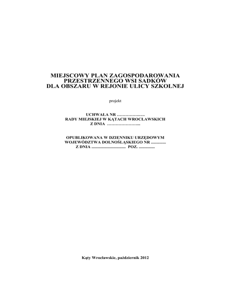 MIEJSCOWY PLAN ZAGOSPODAROWANIA PRZESTRZENNEGO WSI SADKÓW DLA OBSZARU W REJONIE ULICY SZKOLNEJ projekt UCHWAŁA NR …………….…. RADY MIEJSKIEJ W KĄTACH WROCŁAWSKICH Z DNIA …………………... OPUBLIKOWANA W DZIENNIKU URZĘDOWYM WOJEWÓDZTWA DOLNOŚLĄSKIEGO NR .............. Z DNIA ................................ POZ. ............... Kąty Wrocławskie, październik 2012 UCHWAŁA NR .................. RADY MIEJSKIEJ W KĄTACH WROCŁAWSKICH z dnia .................................. w sprawie uchwalenia miejscowego planu zagospodarowania przestrzennego wsi Sadków dla obszaru w rejonie ulicy Szkolnej. Na podstawie art. 18 ust. 2 pkt. 5 ustawy z dnia 8 marca 1990 r. o samorządzie gminnym (Dz. U. z 2001 r. Nr 142, poz. 1591, z 2002 r. Nr 23, poz. 220, Nr 62, poz. 558, Nr 113, poz. 984, Nr 153, poz. 1271, Nr 214, poz. 1806, z 2003 r. Nr 80, poz. 717, Nr 162, poz. 1568, z 2004 r. Nr 102, poz. 1055, Nr 116, poz. 1203, Nr 167, poz. 1759, z 2005 r. Nr 172, poz. 1441, Nr 175, poz. 1457, z 2006 r. Nr 17, poz. 128, Nr 181, poz. 1337, z 2007 r. Nr 48, poz. 327, Nr 138 poz. 974, Nr 173, poz. 1218 z 2008r., Nr 180, poz.1111, Nr 223, poz. 1458, z 2009r. Nr 52, poz. 420), art. 20 ust. 1 ustawy z dnia 27 marca 2003 r. o planowaniu i zagospodarowaniu przestrzennym (t.j. Dz. U. z 2012r., poz. 647), w związku z uchwałą Nr XV/145/11 z dnia 25 listopada 2011r. w sprawie przystąpienia do sporządzenia miejscowego planu zagospodarowania przestrzennego wsi Sadków dla obszaru w rejonie ulicy Szkolnej, po stwierdzeniu braku naruszenia przez projekt planu ustaleń Studium uwarunkowań i kierunków zagospodarowania przestrzennego gminy Kąty Wrocławskie, Rada Miejska w Kątach Wrocławskich uchwala co następuje: ROZDZIAŁ I PRZEPISY OGÓLNE § 1. 1. 2. Uchwala się miejscowy plan zagospodarowania przestrzennego wsi Sadków dla obszaru w rejonie ulicy Szkolnej - w granicach określonych na załączniku nr 1 do uchwały. Ze względu na brak występowania na obszarze planu problematyki, terenów lub obiektów określonych w poniższych pkt 1 - 3, w planie nie określa się: 1) granic i sposobów zagospodarowania terenów lub obiektów podlegających ochronie, ustalonych na podstawie odrębnych przepisów, w tym terenów górniczych, a także narażonych na niebezpieczeństwo powodzi oraz zagrożonych osuwaniem się mas ziemnych; 2) szczególnych warunków zagospodarowania terenów oraz ograniczeń w ich użytkowaniu; 3) sposobu i terminu tymczasowego zagospodarowania, urządzania i użytkowania terenów. § 2. Załącznikami do niniejszej uchwały są: 1) rysunek planu w skali 1:1000 będący integralną częścią uchwały, stanowiący załącznik nr 1; 2) rozstrzygnięcie o sposobie rozpatrzenia uwag, stanowiące załącznik nr 2; 3) rozstrzygnięcie o sposobie realizacji, zapisanych w planie, inwestycji z zakresu infrastruktury technicznej, które należą do zadań własnych gminy oraz o zasadach ich finansowania, zgodnie z przepisami o finansach publicznych, stanowiące załącznik nr 3. § 3. Następujące oznaczenia graficzne przedstawione na rysunku planu, są obowiązującymi ustaleniami planu: 1) granica obszaru objętego planem; 2) linie rozgraniczające tereny o różnym przeznaczeniu lub różnych zasadach zagospodarowania; 3) nieprzekraczalne linie zabudowy; 4) granica strefy ochrony zabytków archeologicznych; 5) przeznaczenie terenów oznaczone symbolami: US, KS, KD. 1 § 4. Ilekroć w przepisach niniejszej uchwały jest mowa o: 1) infrastrukturze towarzyszącej – należy przez to rozumieć towarzyszące niezbędne urządzenia budowlane, zjazdy, dojścia, dojazdy; 2) linii rozgraniczającej – należy przez to rozumieć linię rozgraniczającą tereny o różnym przeznaczeniu lub różnych zasadach zagospodarowania; 3) nieprzekraczalnej linii zabudowy – należy przez to rozumieć wyznaczoną na rysunku zmiany planu linię, której nie mogą przekraczać zewnętrzne ściany nadziemnej części projektowanego budynku lub zewnętrzny obrys wiaty; 4) przeznaczeniu podstawowym terenu – należy przez to rozumieć wiodące przeznaczenie oraz sposób zagospodarowania terenu; 5) przeznaczeniu uzupełniającym terenu – należy przez to rozumieć przeznaczenie oraz sposób zagospodarowania terenu, mogące być traktowane jako towarzyszące zapisanemu w planie przeznaczeniu podstawowemu i nie mogące występować jako samodzielna funkcja w granicach działki budowlanej lub terenu; 6) powierzchni zabudowy budynków – należy przez to rozumieć powierzchnię pod budynkami, po zewnętrznym ich obrysie; 7) reklamie – należy przez to rozumieć tekst lub grafikę umieszczone na materialnym podłożu lub formę przestrzenną niosącą wizualny przekaz informacyjno – reklamowy, nie będące szyldem i tablicą informacyjną; 8) szyldzie – należy przez to rozumieć zewnętrzne graficzne lub tekstowe oznaczenie miejsca i zakresu prowadzenia działalności, przeznaczenia obiektu lub terenu; 9) stanowisku postojowym – należy przez to rozumieć stanowisko służące do parkowania pojazdów samochodowych - zewnętrzne lub garażowe; 10) tablicy informacyjnej – należy przez to rozumieć tekst lub grafikę umieszczone na płaszczyźnie, niosące przekaz informacyjny prowadzonej działalności, przeznaczenia obiektu lub terenu; 11) terenie – należy przez to rozumieć obszar ograniczony na rysunku planu liniami rozgraniczającymi, oznaczony symbolem; 12) wskaźniku intensywności zabudowy – należy przez to rozumieć sumę powierzchni całkowitej budynków w odniesieniu do powierzchni działki budowlanej lub zespołu działek przeznaczonych dla realizacji inwestycji; 13) urządzonych miejscach wypoczynku – należy przez to rozumieć ogólnodostępne miejsca przystosowane do palenia ognisk i grillowania, łąki, ścieżki spacerowe, place zabaw dla dzieci, itp. wyposażone w obiekty małej architektury. ROZDZIAŁ II USTALENIA OGÓLNE § 5. W zakresie zasad ochrony środowiska, pr