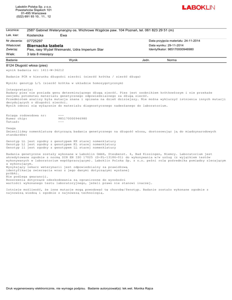 Laboklin Polska Sp. z o.o. Powstańców Śląskich 101 01-495 Warszawa (022) 691 93 10.. 11.. 12 Lecznica: 2587 Gabinet Weterynaryjny os. Wichrowe Wzgórze paw. 104 Poznań, tel. 061 823 29 51 (m) Lek. kier: Kostencka Nr zlecenia: 07725297 Data przyjęcia materiału: 24-11-2014 Biernacka Izabela Data wyniku: 29-11-2014 Identyfikator: 985170000946980 Właściciel: Zwierzę: Wiek: Ewa Pies, rasy Wyżeł Weimarski, Udra Imperium Star 3 lata 8 miesięcy Badanie Wynik Jedn. Norma 8124 Długość włosa (pies) wynik badania nr: 1411-W-36212 Badanie PCR w kierunku długości sierści (sierść krótka / sierść długa) Wynik: genotyp L/L (sierść krótka w układzie homozygotycznym) Interpretacja: Badany pies nie posiada genu determinującego długą sierść. Pies jest osobnikiem krótkowłosym i nie przekaże swojemu potomstwu materiału genetycznego odpowiedzialnego za długą sierść. Przedmiotem analizy była mutacja znana i opisana na dzień dzisiejszy. Nie można wykluczyć istnienia innych mutacji decydujących o długości sierści. Wynik odnosi się wyłącznie do materiału diagnostycznego nadesłanego do laboratorium. Księga rodowodowa nr: Numer chip: Tatuaż: --985170000946980 --- Uwaga Zmieniliśmy nomenklaturę dotyczącą badania genetycznego na długość włosa, dostosowując ją do międzynarodowych standardów: Genotyp LL jest zgodny z genotypem KK starej nomenklatury Genotyp Ll jest zgodny z genotypem KL starej nomenklatury Genotyp ll jest zgodny z genotypem LL starej nomenklatury Badania genetyczne zostały wykonane w Laboklin GmbH, Steubenst. 4, Bad Kissingen, Niemcy. Laboratorium jest akredytowane zgodnie z normą DIN EN ISO 17025 (D-PL-13186-01) do wykonywania w/w usług (z wyjątkiem testów wykonywanych w laboratorium współpracującym). Laboklin Polska Sp. z o.o. pełni rolę pośrednika pomiędzy zlecającym a wykonującym. Wysyłający lekarz weterynarii jest odpowiedzialny za prawidłową identyfikację zwierzęcia wraz z jego danymi dotyczącymi wysłanej próbki. Nie podlega gwarancji. Roszczenia dotyczące odszkodowania są ograniczone do wysokości wartości wykonanego testu laboratoryjnego, jeżeli prawo nie stanowi inaczej. Istnieje możliwość, że inne mutacje mogą powodować tę chorobę/fenotyp. Badanie zostało wykonane zgodnie z najnowszą wiedzą i zgodnie z najnowszą technologią. Druk wygenerowany elektronicznie, nie wymaga podpisu. Badanie autoryzował(a): lek.wet. Monika Rajca
