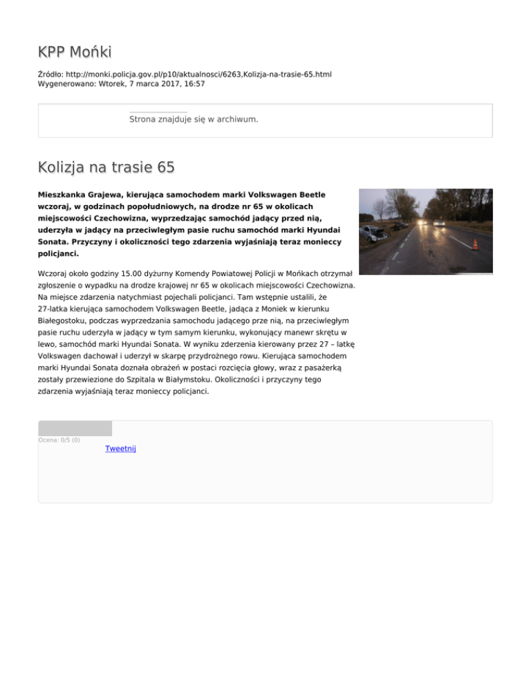 KPP Mońki Źródło: http://monki.policja.gov.pl/p10/aktualnosci/6263,Kolizja-na-trasie-65.html Wygenerowano: Wtorek, 7 marca 2017, 16:57 Strona znajduje się w archiwum. Kolizja na trasie 65 Mieszkanka Grajewa, kierująca samochodem marki Volkswagen Beetle wczoraj, w godzinach popołudniowych, na drodze nr 65 w okolicach miejscowości Czechowizna, wyprzedzając samochód jadący przed nią, uderzyła w jadący na przeciwległym pasie ruchu samochód marki Hyundai Sonata. Przyczyny i okoliczności tego zdarzenia wyjaśniają teraz monieccy policjanci. Wczoraj około godziny 15.00 dyżurny Komendy Powiatowej Policji w Mońkach otrzymał zgłoszenie o wypadku na drodze krajowej nr 65 w okolicach miejscowości Czechowizna. Na miejsce zdarzenia natychmiast pojechali policjanci. Tam wstępnie ustalili, że 27-latka kierująca samochodem Volkswagen Beetle, jadąca z Moniek w kierunku Białegostoku, podczas wyprzedzania samochodu jadącego prze nią, na przeciwległym pasie ruchu uderzyła w jadący w tym samym kierunku, wykonujący manewr skrętu w lewo, samochód marki Hyundai Sonata. W wyniku zderzenia kierowany przez 27 – latkę Volkswagen dachował i uderzył w skarpę przydrożnego rowu. Kierująca samochodem marki Hyundai Sonata doznała obrażeń w postaci rozcięcia głowy, wraz z pasażerką zostały przewiezione do Szpitala w Białymstoku. Okoliczności i przyczyny tego zdarzenia wyjaśniają teraz monieccy policjanci. Ocena: 0/5 (0) Tweetnij