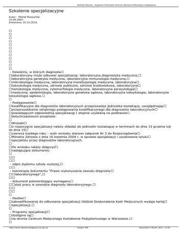 Wydział Zdrowia - Kujawsko-Pomorskie Centrum Zdrowia Publicznego w Bydgoszczy Szkolenie specjalizacyjne Autor: Michał Muszyński 14.09.2007. Zmieniony 10.10.2016. - Dziedziny, w których diagnosta laboratoryjny może odbywać specjalizację: laboratoryjna diagnostyka medyczna, laboratoryjna genetyka medyczna, laboratoryjna immunologia medyczna, mikrobiologia medyczna, laboratoryjna transfuzjologia medyczna, laboratoryjna toksykologia medyczna, zdrowie publiczne, zdrowie środowiskowe, laboratoryjna hematologia medyczna, cytomorfologia medyczna, laboratoryjna parazytologia medyczna, epidemiologia, laboratoryjna genetyka sądowa, laboratoryjna toksykologia, laboratoryjna toksykologia sądowa. - Postępowanie kwalifikacyjne dla diagnostów laboratoryjnych przeprowadza jednostka kształcąca, uwzględniając przeprowadzenie odrębnego postępowania kwalifikacyjnego dla diagnostów laboratoryjnych posiadających odpowiednią specjalizację I stopnia uzyskaną na podstawie dotychczasowych przepisów. Wnioski o rozpoczęcie specjalizacji należy składać do jednostki kształcącej w terminach do dnia 15 grudnia lub do dnia 15 czerwca każdego roku - wzór wniosku stanowi załącznik Nr 3 do Rozporządzenia Ministra Zdrowia z dnia 16 kwietnia 2004 r. w sprawie specjalizacji i uzyskiwania tytułu specjalisty przez diagnostów laboratoryjnych. Do wniosku należy dołączyć następujące dokumenty: - odpis dyplomu szkoły wyższej, - kserokopię dokumentu "Prawo wykonywania zawodu diagnosty laboratoryjnego", - dokument potwierdzający wymagany staż pracy w zawodzie diagnosty laboratoryjnego. - Osobie zakwalifikowanej do odbywania specjalizacji Oddział Doskonalenia Kadr Medycznych wydaje kartę specjalizacji. - Programy specjalizacji dostępne są na stronie Centrum Medycznego Kształcenia Podyplomowego w Warszawie. http://www.zdrowie.bydgoszcz.uw.gov.pl Kreator PDF Utworzono 7 March, 2017, 17:05 Wydział Zdrowia - Kujawsko-Pomorskie Centrum Zdrowia Publicznego w Bydgoszczy - Możliwość skracania, przedłużania szkolenia specjalizacyjnego regulują przepisy rozporządzenia Ministra Zdrowia z dnia 16 kwietnia 2004 r. w sprawie specjalizacji i uzyskiwania tytułu specjalisty przez diagnostów laboratoryjnych (Dz. U. z 2015 r. poz. 683). - Wojewoda prowadzi rejestr osób odbywających specjalizację na obszarze województwa. - Wojewoda skreśla diagnostę laboratoryjnego z rejestru w przypadkach: - utraty prawa wykonywania zawodu, - niepodjęcia przez diagnostę laboratoryjnego specjalizacji w okresie 3 miesięcy od dnia wskazanego jako termin rozpoczęcia specjalizacji w karcie specjalizacji, - przerwania specjalizacji dokonanej przez pełnomocnika na wniosek kierownika specjalizacji, w przypadku gdy diagnosta laboratoryjny nie uczestniczy w kursach lub nie odbywa staży kierunkowych albo podstawowego stażu, - upływu okresu, w którym diagnosta laboratoryjny był zobowiązany ukończyć specjalizację, po otrzymaniu powiadomienia od pełnomocnika. - O skreśleniu z rejestru powiadamia się osobę odbywającą specjalizację za pośrednictwem pełnomocnika. Osoba skreślona może w terminie 14 dni od uzyskania informacji o skreśleniu wystąpić do ministra właściwego do spraw zdrowia z uzasadnionym wnioskiem o przywrócenie możliwości kontynuowania specjalizacji. Minister właściwy do spraw zdrowia uwzględnia wniosek po uzyskaniu pozytywnej opinii konsultanta krajowego w danej dziedzinie lub dziedzinie pokrewnej, co skutkuje dokonaniem zmian w rejestrze. http://www.zdrowie.bydgoszcz.uw.gov.pl Kreator PDF Utworzono 7 March, 2017, 17:05 Wydział Zdrowia - Kujawsko-Pomorskie Centrum Zdrowia Publicznego w Bydgoszczy http://www.zdrowie.bydgoszcz.uw.gov.pl Kreator PDF Utworzono 7 March, 2017, 17:05