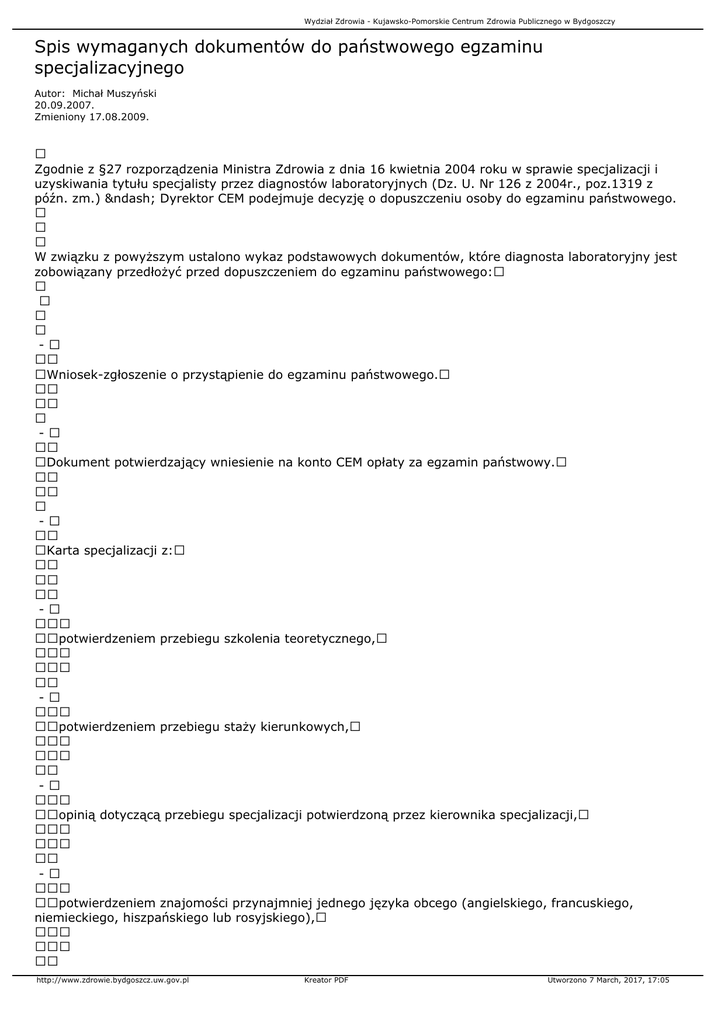 Wydział Zdrowia - Kujawsko-Pomorskie Centrum Zdrowia Publicznego w Bydgoszczy Spis wymaganych dokumentów do państwowego egzaminu specjalizacyjnego Autor: Michał Muszyński 20.09.2007. Zmieniony 17.08.2009. Zgodnie z §27 rozporządzenia Ministra Zdrowia z dnia 16 kwietnia 2004 roku w sprawie specjalizacji i uzyskiwania tytułu specjalisty przez diagnostów laboratoryjnych (Dz. U. Nr 126 z 2004r., poz.1319 z późn. zm.) – Dyrektor CEM podejmuje decyzję o dopuszczeniu osoby do egzaminu państwowego. W związku z powyższym ustalono wykaz podstawowych dokumentów, które diagnosta laboratoryjny jest zobowiązany przedłożyć przed dopuszczeniem do egzaminu państwowego: - Wniosek-zgłoszenie o przystąpienie do egzaminu państwowego. - Dokument potwierdzający wniesienie na konto CEM opłaty za egzamin państwowy. - Karta specjalizacji z: - potwierdzeniem przebiegu szkolenia teoretycznego, - potwierdzeniem przebiegu staży kierunkowych, - opinią dotyczącą przebiegu specjalizacji potwierdzoną przez kierownika specjalizacji, - potwierdzeniem znajomości przynajmniej jednego języka obcego (angielskiego, francuskiego, niemieckiego, hiszpańskiego lub rosyjskiego), http://www.zdrowie.bydgoszcz.uw.gov.pl Kreator PDF Utworzono 7 March, 2017, 17:05 Wydział Zdrowia - Kujawsko-Pomorskie Centrum Zdrowia Publicznego w Bydgoszczy - opisem formy samokształcenia potwierdzoną przez kierownika specjalizacji, - zaliczeniem specjalizacji przez kierownika specjalizacji, - Zaświadczenia o ukończonych kursach. - Laboratoryjna hematologia medyczna - praca poglądowa oceniona przez kierownika specjalizacji, jeżeli nie została opublikowana. - Świadectwo potwierdzające znajomość jednego języka obcego. - laboratoryjna diagnostyka medyczna, laboratoryjna immunologia medyczna, laboratoryjna toksykologia medyczna, laboratoryjna transfuzjologia medyczna, zdrowia publiczne, zdrowie środowiskowe - wydane przez studium języków obcych uczelni wyższej, - laboratoryjna genetyka medyczna - wydane przez studium języków obcych uczelni wyższej lub udokumentowane certyfikatami co najmniej na poziomie - Język angielski: FCE, TOEFL, - Język francuski: DEFL, DL, - http://www.zdrowie.bydgoszcz.uw.gov.pl Kreator PDF Utworzono 7 March, 2017, 17:05 Wydział Zdrowia - Kujawsko-Pomorskie Centrum Zdrowia Publicznego w Bydgoszczy Język niemiecki: ZD, - Język hiszpański: DELE, - Język rosyjski: PURJ - mikrobiologia medyczna, laboratoryjna hematologia medyczna - wydane przez studium języków obcych uczelni medycznej - Kserokopia prawa wykonywania zawodu diagnosty laboratoryjnego – widoczny numer, data i przynależność do Krajowej Izby Diagnostów Laboratoryjnych, lub kserokopia zaświadczenia wydanego przez Krajową Radę Diagnostów Laboratoryjnych potwierdzające wpis na listę diagnostów laboratoryjnych (zaświadczenie obowiązuje wyłącznie do 31 grudnia 2006 roku), - Kserokopia dyplomu ukończonej szkoły wyższej. Uwaga: Świadectwo wydane przez studium języków obcych jest uznawane, gdy okres od dnia zdania egzaminu z języka obcego do dnia rozpoczęcia specjalizacji nie przekracza 5 lat. Dokumenty prosimy składać w białej, wiązanej, nie podpisanej teczce. http://www.zdrowie.bydgoszcz.uw.gov.pl Kreator PDF Utworzono 7 March, 2017, 17:05 Wydział Zdrowia - Kujawsko-Pomorskie Centrum Zdrowia Publicznego w Bydgoszczy http://www.zdrowie.bydgoszcz.uw.gov.pl Kreator PDF Utworzono 7 March, 2017, 17:05