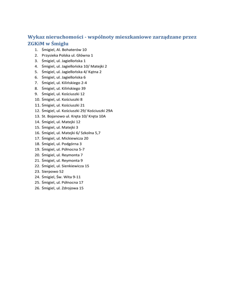 Wykaz nieruchomości - wspólnoty mieszkaniowe zarządzane przez ZGKiM w Śmiglu 1. 2. 3. 4. 5. 6. 7. 8. 9. 10. Śmigiel, Al. Bohaterów 10 Przysieka Polska ul. Główna 1 Śmigiel, ul. Jagiellońska 1 Śmigiel, ul. Jagiellońska 10/ Matejki 2 Śmigiel, ul. Jagiellońska 4/ Kątna 2 Śmigiel, ul. Jagiellońska 6 Śmigiel, ul. Kilińskiego 2-4 Śmigiel, ul. Kilińskiego 39 Śmigiel, ul. Kościuszki 12 Śmigiel, ul. Kościuszki 8 11. Śmigiel, ul. Kościuszki 21 12. Śmigiel, ul. Kościuszki 29/ Kościuszki 29A 13. St. Bojanowo ul. Kręta 10/ Kręta 10A 14. Śmigiel, ul. Matejki 12 15. Śmigiel, ul. Matejki 3 16. Śmigiel, ul. Matejki 6/ Szkolna 5,7 17. Śmigiel, ul. Mickiewicza 20 18. Śmigiel, ul. Podgórna 3 19. Śmigiel, ul. Północna 5-7 20. Śmigiel, ul. Reymonta 7 21. Śmigiel, ul. Reymonta 9 22. Śmigiel, ul. Sienkiewicza 15 23. Sierpowo 52 24. Śmigiel, Św. Wita 9-11 25. Śmigiel, ul. Północna 17 26. Śmigiel, ul. Zdrojowa 15