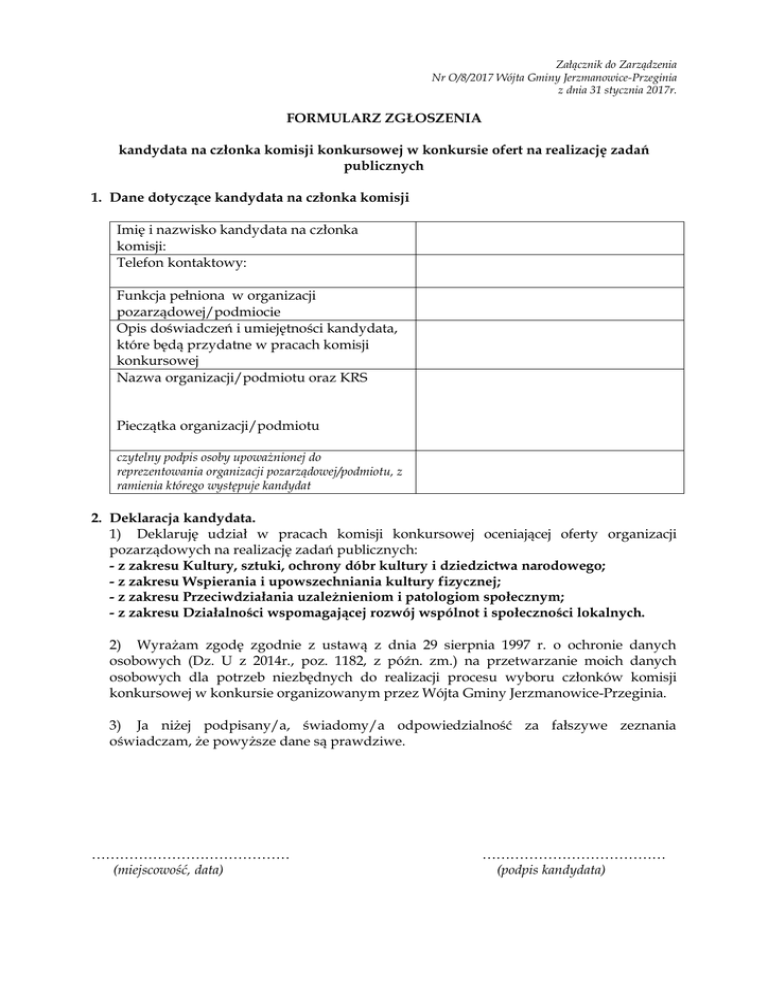 Załącznik do Zarządzenia Nr O/8/2017 Wójta Gminy Jerzmanowice-Przeginia z dnia 31 stycznia 2017r. FORMULARZ ZGŁOSZENIA kandydata na członka komisji konkursowej w konkursie ofert na realizację zadań publicznych 1. Dane dotyczące kandydata na członka komisji Imię i nazwisko kandydata na członka komisji: Telefon kontaktowy: Funkcja pełniona w organizacji pozarządowej/podmiocie Opis doświadczeń i umiejętności kandydata, które będą przydatne w pracach komisji konkursowej Nazwa organizacji/podmiotu oraz KRS Pieczątka organizacji/podmiotu czytelny podpis osoby upoważnionej do reprezentowania organizacji pozarządowej/podmiotu, z ramienia którego występuje kandydat 2. Deklaracja kandydata. 1) Deklaruję udział w pracach komisji konkursowej oceniającej oferty organizacji pozarządowych na realizację zadań publicznych: - z zakresu Kultury, sztuki, ochrony dóbr kultury i dziedzictwa narodowego; - z zakresu Wspierania i upowszechniania kultury fizycznej; - z zakresu Przeciwdziałania uzależnieniom i patologiom społecznym; - z zakresu Działalności wspomagającej rozwój wspólnot i społeczności lokalnych. 2) Wyrażam zgodę zgodnie z ustawą z dnia 29 sierpnia 1997 r. o ochronie danych osobowych (Dz. U z 2014r., poz. 1182, z późn. zm.) na przetwarzanie moich danych osobowych dla potrzeb niezbędnych do realizacji procesu wyboru członków komisji konkursowej w konkursie organizowanym przez Wójta Gminy Jerzmanowice-Przeginia. 3) Ja niżej podpisany/a, świadomy/a odpowiedzialność za fałszywe zeznania oświadczam, że powyższe dane są prawdziwe. …………………………………… (miejscowość, data) ………………………………… (podpis kandydata)
