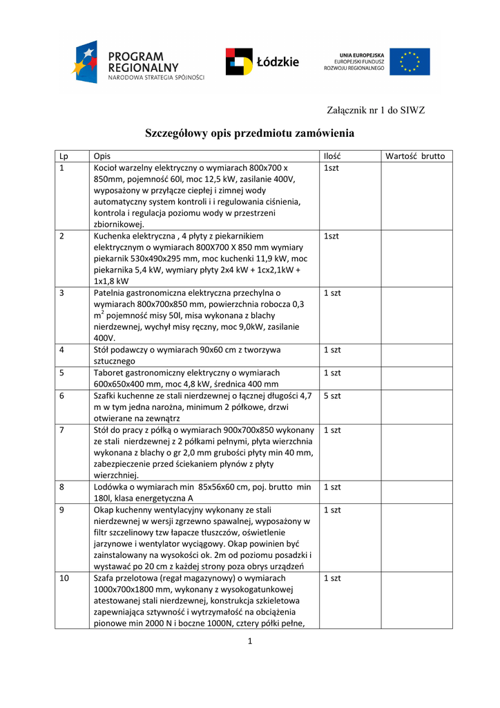 Załącznik nr 1 do SIWZ Szczegółowy opis przedmiotu zamówienia Lp 1 2 3 4 5 6 7 8 9 10 Opis Kocioł warzelny elektryczny o wymiarach 800x700 x 850mm, pojemność 60l, moc 12,5 kW, zasilanie 400V, wyposażony w przyłącze ciepłej i zimnej wody automatyczny system kontroli i i regulowania ciśnienia, kontrola i regulacja poziomu wody w przestrzeni zbiornikowej. Kuchenka elektryczna , 4 płyty z piekarnikiem elektrycznym o wymiarach 800X700 X 850 mm wymiary piekarnik 530x490x295 mm, moc kuchenki 11,9 kW, moc piekarnika 5,4 kW, wymiary płyty 2x4 kW + 1cx2,1kW + 1x1,8 kW Patelnia gastronomiczna elektryczna przechylna o wymiarach 800x700x850 mm, powierzchnia robocza 0,3 m2 pojemność misy 50l, misa wykonana z blachy nierdzewnej, wychył misy ręczny, moc 9,0kW, zasilanie 400V. Stół podawczy o wymiarach 90x60 cm z tworzywa sztucznego Taboret gastronomiczny elektryczny o wymiarach 600x650x400 mm, moc 4,8 kW, średnica 400 mm Szafki kuchenne ze stali nierdzewnej o łącznej długości 4,7 m w tym jedna narożna, minimum 2 półkowe, drzwi otwierane na zewnątrz Stół do pracy z półką o wymiarach 900x700x850 wykonany ze stali nierdzewnej z 2 półkami pełnymi, płyta wierzchnia wykonana z blachy o gr 2,0 mm grubości płyty min 40 mm, zabezpieczenie przed ściekaniem płynów z płyty wierzchniej. Lodówka o wymiarach min 85x56x60 cm, poj. brutto min 180l, klasa energetyczna A Okap kuchenny wentylacyjny wykonany ze stali nierdzewnej w wersji zgrzewno spawalnej, wyposażony w filtr szczelinowy tzw łapacze tłuszczów, oświetlenie jarzynowe i wentylator wyciągowy. Okap powinien być zainstalowany na wysokości ok. 2m od poziomu posadzki i wystawać po 20 cm z każdej strony poza obrys urządzeń Szafa przelotowa (regał magazynowy) o wymiarach 1000x700x1800 mm, wykonany z wysokogatunkowej atestowanej stali nierdzewnej, konstrukcja szkieletowa zapewniająca sztywność i wytrzymałość na obciążenia pionowe min 2000 N i boczne 1000N, cztery półki pełne, 1 Ilość 1szt 1szt 1 szt 1 szt 1 szt 5 szt 1 szt 1 szt 1 szt 1 szt Wartość brutto 11 12 13 14 15 16 17 18 19 drzwi suwane Stół załadowczy z otworem na odpady i zlewozmywakiem o wymiarach 1400x700x850 mm, stół wykonany z kołnierzem ochronnym o wysokości 200 mm, otwór na baterie 1 kolumnowy z zamontowanym młynkiem do rozdrabniania odpadów montowanym do zlewozmywaka z odpływem 3,5 cala, uruchamiany za pomocą włącznika pneumatycznego Zmywarka gastronomiczna do naczyń (3 fazowa) podblatowa, wyposażona w funkcję wyprażania, sterowany czasowo dozownik środka myjącego i płuczącego, kosz na szkło o wymiarach 50x50 cm, kosz na talerze, pojemnik na sztućce, stojak na talerzyk Szafa na talerze (regał) o wymiarach 1200x700x1800 mm, z półkami pełnymi wykonany z wysokogatunkowej atestowanej stali nierdzewnej, konstrukcja szkieletowa zapewniająca sztywność i wytrzymałość na obciążenia pionowe min 2000 N i boczne 1000N, cztery półki pełne, drzwi suwane Zamrażarka skrzyniowa, pojemność min 650 l, wymiary zewnętrzne min 200x76 x 84 cm, oszranianie ręczne, zakres temperatury -18 do -210 C, zdolność zamrażania 52 kg/24h, klasa energetyczna A, zasilanie 230V, statyczny układ chłodzenia Szafy magazynowe przelotowe, dwupoziomowe z drzwiami suwalnymi i czterema półkami o wymiarach 1000x600x2000 mm, wykonane z atestowanej wysokogatunkowej stali nierdzewnej, stopki regulowane, wyposażenie modułu: 2 półki w każdym poziomie Stół do pracy z półką o wymiarach 800x700x850 wykonany ze stali nierdzewnej z 2 półkami pełnymi, płyta wierzchnia wykonana z blachy o gr 2,0 mm i grubości płyty 40 mm, zabezpieczenie przed ściekaniem płynów z płyty wierzchniej. Wyparzacz do jaj o wymiarach min 184x460x380 mm, moc min 16W, zasilanie 230V, długość fali min 253,7 nm, klasa odporności min IP 20, długość trwania cyklu 1 -1,5 min, wykonany ze stali nierdzewnej, jednorazowy wsad na 30 szt, trwałość promienników UV min 7500h Stół ze zlewem o wymiarach 1100x 700x850 wykonany z blachy nierdzewnej, płyta wierzchnia płaska o gr. Blachy 2,0mm, wysokość rantów 100 mm, grubość płyty 40mm Kosz na odpadki wykonany ze stali nierdzewnej o poj. min 60 l, wyposażony w układ jezdny z pokrywą. 2 1 szt 1 szt 1 szt 1 szt 2 szt 1 szt 1 szt 1 szt 2 szt
