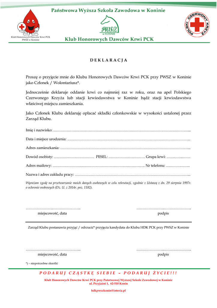 DEKLARACJA Proszę o przyjęcie mnie do Klubu Honorowych Dawców Krwi PCK przy PWSZ w Koninie jako Członek / Wolontariusz*. Jednocześnie deklaruje oddanie krwi co najmniej raz w roku, oraz na apel Polskiego Czerwonego Krzyża lub stacji krwiodawstwa w Koninie bądź stacji krwiodawstwa właściwej miejscu zamieszkania. Jako Członek Klubu deklaruję opłacać składki członkowskie w wysokości ustalonej przez Zarząd Klubu. Imię i nazwisko: …………………………………………………………………………………………………... Data i miejsce urodzenia: ………………………………………………………………………………………... Adres zamieszkania: ……………………………………………………………………………………………... Dowód osobisty: …………………………… PESEL: ………………………… Grupa krwi: …………..…… Adres mailowy: …………………………………………………………………. Nr telefonu: ……………….. Nazwa i adres zakładu pracy: …………………………………………………………………………………... Wyrażam zgodę na przetwarzanie moich danych osobowych w celu rekrutacji, zgodnie z Ustawą z dn. 29 sierpnia 1997r. o ochronie osobowych (Dz. U. z 2014r. poz. 1182). …………………..………………….. miejscowość, data …………………..………………….. podpis Zarząd Klubu postanawia przyjąć / odrzucić* przyjęcia kandydata do Klubu HDK PCK przy PWSZ w Koninie …………………..………………….. miejscowość, data …………………..………………….. podpis *) – niepotrzebne skreślić PODARUJ CZĄSTKĘ SIEBIE – PODARUJ ŻYCIE!!! Klub Honorowych Dawców Krwi PCK przy Państwowej Wyższej Szkole Zawodowej w Koninie ul. Przyjaźni 1, 62-510 Konin [email protected]