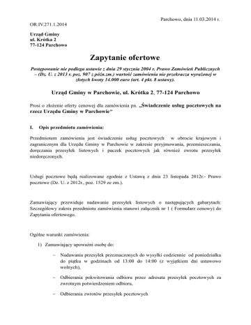 Parchowo, dnia 11.03.2014 r. OR.IV.271.1.2014 Urząd Gminy ul. Krótka 2 77-124 Parchowo Zapytanie ofertowe Postępowanie nie podlega ustawie z dnia 29 stycznia 2004 r. Prawo Zamówień Publicznych – (Dz. U. z 2013 r. poz. 907 z późn.zm.) wartość zamówienia nie przekracza wyrażonej w złotych kwoty 14.000 euro (art. 4 pkt. 8 ustawy). Urząd Gminy w Parchowie, ul. Krótka 2, 77-124 Parchowo Prosi o złożenie oferty cenowej dla zamówienia pn. „Świadczenie usług pocztowych na rzecz Urzędu Gminy w Parchowie” I. Opis przedmiotu zamówienia: Przedmiotem zamówienia jest świadczenie usług pocztowych w obrocie krajowym i zagranicznym dla Urzędu Gminy w Parchowie w zakresie przyjmowania, przemieszczania, doręczania przesyłek listowych i paczek pocztowych jak również zwrotu przesyłek niedoręczonych. Usługi pocztowe będą realizowane zgodnie z Ustawą z dnia 23 listopada 2012r.- Prawo pocztowe (Dz. U. z 2012r., poz. 1529 ze zm.). Zamawiający przewiduje nadawanie przesyłek listowych o następujących gabarytach: Szczegółowy zakres przedmiotu zamówienia stanowi załącznik nr 1 ( Formularz cenowy) do Zapytania ofertowego. Ogólne warunki zamówienia: 1) Zamawiający upoważni osobę do: − Nadawania przesyłek przeznaczonych do wysyłki codziennie od poniedziałku do piątku w godzinach od 13:00 do 14:00 (z wyjątkiem dni ustawowo wolnych), − Odbierania pokwitowania odbioru przez adresata przesyłek pocztowych za zwrotnym potwierdzeniem odbioru, − Odbierania zwrotów przesyłek pocztowych 2) Wykonawca dostarczy paczki do siedziby Zamawiającego. 3) Zamawiający zobowiązuje się do sporządzania dla nadawanych przesyłek zestawień uwzględniając ilość, wartość, wagę oraz podział na przesyłki rejestrowane i nierejestrowane. 4) W sytuacji wysyłki przesyłek nieokreślonych w Załączniku nr 1 do Zapytania obowiązywała będzie cena zgodnie z obowiązującym cennikiem. 5) Wykonawca przekaże bezpłatnie Zamawiającemu druki zwrotnego potwierdzenia odbioru. 6) Potwierdzenie odbioru przez adresata dla przesyłek pocztowych za zwrotnym potwierdzeniem odbioru, Wykonawca będzie przekazywał Zamawiającemu niezwłocznie po dokonaniu doręczenia przesyłki 7) Zamawiający wymaga, aby Wykonawca dysponował placówką nadawczą w miejscowości w której znajduje się jednostka Zamawiającego. UWAGA! W przypadku gdy Wykonawca nie dysponuje placówką w miejscowości jednostki Zamawiającego, Wykonawca zobowiązuje się we własnym zakresie oraz w cenie podanej w ofercie do: 1) Odbierania wysyłek codziennie w godzinach 13:00- 14:00 od poniedziałku do piątku (z wyjątkiem dni ustawowo wolnych), 2) Nadawania przesyłek w dniu ich odbioru przez Wykonawcę od Zamawiającego, 3) Przekazywanie pokwitowania odbioru przez adresata przesyłek pocztowych za zwrotnym potwierdzeniem odbioru, 4) Przekazywanie zwrotów przesyłek pocztowych, 5) Opracowywanie przesyłek rejestrowanych (R) II. Termin realizacji zamówienia Od 01.04.2014r. do 31.03.2015r. III. Termin oraz sposób złożenia oferty: Oferty należy złożyć w terminie do 20.03.2014 r. do godz. 10.00, w Sekretariacie Urzędu Gminy w Parchowie, ul. Krótka 2, 77-124 Parchowo, I piętro,pokój nr 28. Wymaga się, aby oferta została zamieszczona w zaklejonej kopercie z napisem: „Dotyczy świadczenia usług pocztowych na rzecz Urzędu Gminy w Parchowie”. IV. Termin związania ofertą 14 dni od upływu terminu składania ofert. V. Kryteria oceny ofert - Cena - 20% - Referencje w zakresie świadczenia usług pocztowych w obrocie krajowym i zagranicznym o wartości nie niższej niż 30 tys. zł., od 2013 r. do 2014 r.-10% - Termin dostarczania korespondencji zgodny z Ustawą z dnia 23 listopada 2012 r. - Prawo pocztowe (Dz.U. Z 2012 r., poz. 1529 ze zm.) - 10% - Punkt odbioru korespondencji w miejscowości Zamawiającego - 60% VI. Pozostałe Informacje Informujemy, że zaproponowane ceny będą porównane z innymi ofertami. Z Wykonawcą, który przedstawi najkorzystniejszą ofertę zostanie podpisana umowa O wynikach postępowania Oferenci zostaną poinformowani droga elektroniczną (numer tel. fax i adres email należy podać w załączniku nr 1) Zamawiający zastrzega sobie unieważnienie zapytania ofertowego bez podania przyczyny Uprawnieni do kontaktów z Wykonawcami: Mirosława Grzegorowska tel. (59) 821 48 08 e-mail: [email protected] załączniki: 1. Formularz cenowy. 2. Formularz ofertowy.