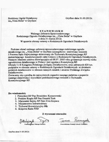 Gryfino diaia 31.03.2012r. Rodzinny Ogród Działkowy im„Vista Bella" w Gryfinie STANOWISKO ¡ Walnego Zebrania Sprawozdawczego , Rodzinnego Ogrodu Działkowego im. „Vista Bella" w Grjyfinie z dnia 31 marca 2012r. W sprawie obrony ustawy o Rodzinnych Ogrodach Działkowych Podczas obrad walnego zebrania sprawozdawczego rodzinnego ogrodu działkowego im. „Vista Bella" w Gryfinie szczegółowo omówiono wniosek I Prezesa Sądu Najwyższego skierowany do Trybunału Konstytucyjnego RP zaskarżającego konstytucyjność całej Ustawy o Rodzinnych Ogrodach Działkowych. Naszym zdaniem ustawa obowiązująca od 08.07. 2005 roku gwarantuje rozwój ruchu ogrodnictwa działkowego w Polsce i jest zgodna z Konstytucją RJP. Obrady I i II Kongresu Polskiego Związku Działkowców, oraz zebranych 620 tys, podpisów w obronie ustawy o Rodzinnych Ogrodach Działkowych to działanie polskich działkowców w obronie naszych działek i struktur Polskiego Związku Działkowców. Zwracamy się z prośbą do najwyższych organów naszego państwa o poparcie naszego stanowiska i wycofanie przedmiotowego wniosek z Trybunału Konstytucyjnego RP. Do wiadomości; l Prezydent RP Pan Bronisław Komorowski 2. Premier Rządu RP Pan Donald Tusk 3. Marszałek Sejmu RP Pani Ewa Kopacz 4. Ministerstwo Infrastruktury 5. Trybunał Konstytucyjny Rty 6. Krajowa Rada PZD Z wyrazami szacunku Gryfino dnia 31,03.2012r.