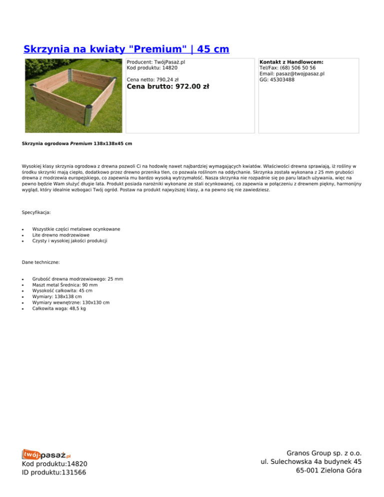 Skrzynia na kwiaty "Premium" | 45 cm Producent: TwójPasaż.pl Kod produktu: 14820 Cena netto: 790,24 zł Kontakt z Handlowcem: Tel/Fax: (68) 506 50 56 Email: [email protected] GG: 45303488 Cena brutto: 972.00 zł Skrzynia ogrodowa Premium 138x138x45 cm Wysokiej klasy skrzynia ogrodowa z drewna pozwoli Ci na hodowlę nawet najbardziej wymagających kwiatów. Właściwości drewna sprawiają, iż rośliny w środku skrzynki mają ciepło, dodatkowo przez drewno przenika tlen, co pozwala roślinom na oddychanie. Skrzynka została wykonana z 25 mm grubości drewna z modrzewia europejskiego, co zapewnia mu bardzo wysoką wytrzymałość. Nasza skrzynka nie rozpadnie się po paru latach używania, więc na pewno będzie Wam służyć długie lata. Produkt posiada narożniki wykonane ze stali ocynkowanej, co zapewnia w połączeniu z drewnem piękny, harmonijny wygląd, który idealnie wzbogaci Twój ogród. Postaw na produkt najwyższej klasy, a na pewno się nie zawiedziesz. Specyfikacja: ● ● ● Wszystkie części metalowe ocynkowane Lite drewno modrzewiowe Czysty i wysokiej jakości produkcji Dane techniczne: ● ● ● ● ● ● Grubość drewna modrzewiowego: 25 mm Maszt metal Średnica: 90 mm Wysokość całkowita: 45 cm Wymiary: 138x138 cm Wymiary wewnętrzne: 130x130 cm Całkowita waga: 48,5 kg Kod produktu:14820 ID produktu:131566 Granos Group sp. z o.o. ul. Sulechowska 4a budynek 45 65-001 Zielona Góra