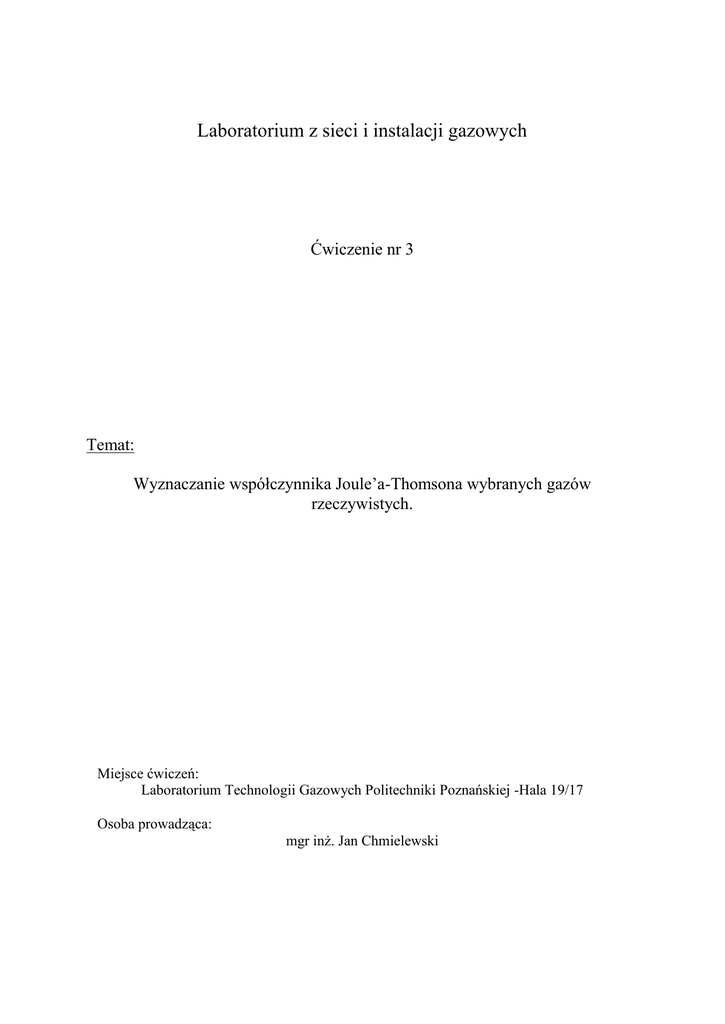 Laboratorium z sieci i instalacji gazowych Ćwiczenie nr 3 Temat: Wyznaczanie współczynnika Joule’a-Thomsona wybranych gazów rzeczywistych. Miejsce ćwiczeń: Laboratorium Technologii Gazowych Politechniki Poznańskiej -Hala 19/17 Osoba prowadząca: mgr inż. Jan Chmielewski 1. Cel ćwiczenia W niniejszym ćwiczeniu zajmujemy się pomiarem części właściwości termodynamicznych gazów rzeczywistych. Jedną z tych właściwości i jednocześnie celem ćwiczenia jest wyznaczenie współczynnika Joule’a-Thomsona dla poszczególnych badanych gazów . 2. Opis zagadnienia Współczynnik Joule’a-Thomsona wyznaczymy na podstawie obserwacji efektu Joule’aThomsona, który polega na zmianie temperatury gazu rzeczywistego przy izentalpowym dławieniu. Współczynnik Joule’a-Thomsona charakteryzuje stopień obniżenia temperatury gazów na skutek spadku ciśnienia p na zwężce/reduktorze i wywołanym nim obniżeniem temperatury t. Współczynnik ten opisuje poniższy wzór: v T v T p T h P Cp h T P lim dla P 0 (1) h określający zmianę temperatury (dT) przy zmianie ciśnienia (dP) w przemianie izentalpowej. Dla gazu doskonałego współczynnik jest równy zeru. Natomiast dla gazu i rzeczywistego może on przyjmować następujące wartości: a) 0, gdy T h b) c) h h 0, gdy T 0, gdy T v T v (2) p v T p v T p v (3) v (4) W przypadku trzecim punkt w którym zachodzi wartość inwersji. i =0 nazywamy punktem Punkt krytyczny K jest zdefiniowany: (∂p/∂V)T=Tc = 0 (∂2p/∂V2)T=Tc = 0 (5) czyli w punkcie krytycznym nie ma różnicy między ciśnieniem, objętością i temperaturą fazy gazowej i ciekłej; oznacza to że nie ma różnicy faz. Dlatego możemy napisać: T = Tc P = Pc Vm = Vm,c Z = pVm/(MR)T= 1 + BM(T) ρm +C(T) ρm2 + ... (6) Powyższe równanie jest równaniem wirialnym na współczynnik ściśliwości Z gdzie: (MR) = 8314 [J/(mol*K)] B, C,... – stałe, oznaczają drugi, trzeci itp. współczynniki wirialne Z - współczynnik ściśliwości Dla większości zastosowań technicznych można stosować równanie tylko z drugim współczynnikiem , czyli B: B = b(0)+b(1)T+b(2)T2 [m3/kmol] stąd równanie [6] przyjmie postać: Z = 1 + (b(0)+b(1)T+b(2)T2 ) ρm b(0) - 0,29867 - 0,86834 CH4 CO2 (7) b(1) 1,33425 x 10-3 4,0375 x 10-3 b(2) - 1,59761 x 10-6 - 5,1657 x 10-6 3. Opis stanowiska Do realizacji ćwiczenia posłuży nam specjalnie zaprojektowane stanowisko, którego rysunek jest przedstawiony poniżej. Interesujący nas efekt Joule’a-Thomsona uzyskujemy dzięki założonej pomiędzy kołnierze zwężce o średnicy otworu 2 mm. Przepływający przez rurkę o średnicy 3/4” badany gaz, ulega rozprężeniu po przejściu przez zwężkę. Efekt ten obserwujemy na podstawie odczytu różnicy wartości ciśnienia i temperatury przed i za zwężką pomiarową. Rurka na badanym odcinku jest umieszczona w zaizolowanej termicznie obudowie. Do izolacji termicznej stanowiska użyto ziarenka perlitu ekspandowanego, którego współczynnik przewodzenia ciepła λ waha się w granicach 0,045-0,059 W/mK. Źródłem badanych gazów są butle techniczne zawierające metan (CH4) oraz dwutlenek węgla (CO2). Do pomiaru ciśnienia użyto manometry o zakresie od –1 do +9 bar i klasie pomiaru 0,6. Temperaturę odczytuje się za pomocą termopar PT 100. Manometr 1 Manometr 2 PT 100 PT 100 Reduktory Licznik gazu Zawór Obudowa z izolacją CH4 Zwężka Kołnierz CO2 Rys.1 Schemat stanowiska do pomiaru współczynnika Joule’a-Thomsona Wylot gazu 4. Przebieg ćwiczenia Część I W ćwiczeniu należy dokonać pomiaru spadku temperatury w funkcji ciśnienia dla podanych gazów rzeczywistych. Następnie z otrzymanych pomiarów należy obliczyć współczynnik Joule’a-Thomsona, ciepło potrzebne do ogrzania stacji redukcyjnej oraz współczynnik ściśliwości. a) Współczynnik ten możemy obliczyć ze wzoru: T p f T1 , p1 b) Gęstości badanych gazów ρR (przed reduktorem) oraz, ρZ (przed zwężką) dla warunków (Pmax,T) obliczamy korzystając ze wzoru: P1 [Pa] M ρm [kg/m3] (MR) T1 [K] gdzie: (MR) = 8314 [J/(kmol*K)] – uniwersalna stała gazowa M – masa cząsteczkowa Do wyznaczenia współczynnika ściśliwości korzystamy ze wzoru: Z = 1 + Bm ρm+Cm ρ2m gdzie: Bm = b(0)+b(1)T1+b(2)T12 [m3/kmol] Cm= c(0)+c(1)T1+c(2)T12 [m6/kmol2] b(0) b(1) b(2) c(0) c(1) -3 -6 -3 CH4 - 0,29867 1,33425 x 10 - 1,59761 x 10 9,2726 x10 -3,7613x 10-5 CO2 - 0,86834 4,0375 x 10-3 - 5,1657 x 10-6 2,051 x10-3 3,488x 10-5 c(2) 4,93 x 10-8 - 8,37 x 10-8 c) Ilość ciepła potrzebnego do ogrzewania gazu przed na przykład stacją redukcyjną obliczamy według: Q C P ( T) [W] m cp - ciepło właściwe gazu pod stałym ciśnieniem odpowiednio dla metanu i dwutlenku węgla m – strumień masy [kg/s] Możemy przyjąć odpowiednio: Ciepło właściwe Cp [kJ/kgK] CH4 2,235 Masę gazu znajdującego się w butli obliczymy: m ρ R VB VB – pojemność butli [m3] CO2 1,292 Rys. 2 Zależność współczynnika ściśliwości dla wybranych gazów rzeczywistych Politechnika Poznańska Imię i nazwisko Temat: Wyznaczanie współczynnika Joule’a-Thomsona wybranych gazów rzeczywistych oraz pomiar procesu ich spalania Grupa Semestr/rok akademicki Prowadzący Data wykonania ćwiczenia/godz. Laboratorium z termodynamiki Ocena Zadania do wykonania: 1. Wyznaczyć współczynnik Joule’a-Thomsona dla metanu oraz dwutlenku węgla. 2. Obliczyć własności badanych gazów. Tabela pomiarowa dla CH4 - Część I Na zwężce Lp T1[°C] T2[°C] ∆T P1[bar] P2 [bar] ∆P µ v0 [m3] v1 [m3] vg [m3/h] µ v0 [m3] v1 [m3] vg [m3/h] 1 2 3 4 Na reduktorze Lp T1[°C] T2[°C] ∆T P1[bar] P2 [bar] ∆P 1 Przed zwężką Obliczone własności gazu Gęstość gazu Współczynnik ściśliwości Ilość ciepła Pojemność butli V= ρZ = ZZ = QZ = Przed reduktorem [kg/m3] ρR = ZR = [W] QR = 3 [m ] Masa gazu w butli m= [kg/m3] [W] [kg] Tabela pomiarowa dla CO2 - Część I Na zwężce Lp T1[°C] T2[°C] ∆T P1[bar] P2 [bar] ∆P µ v0 [m3] v1 [m3
