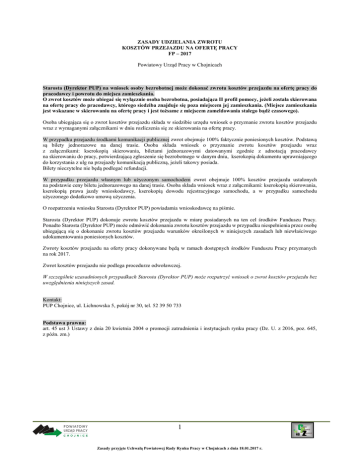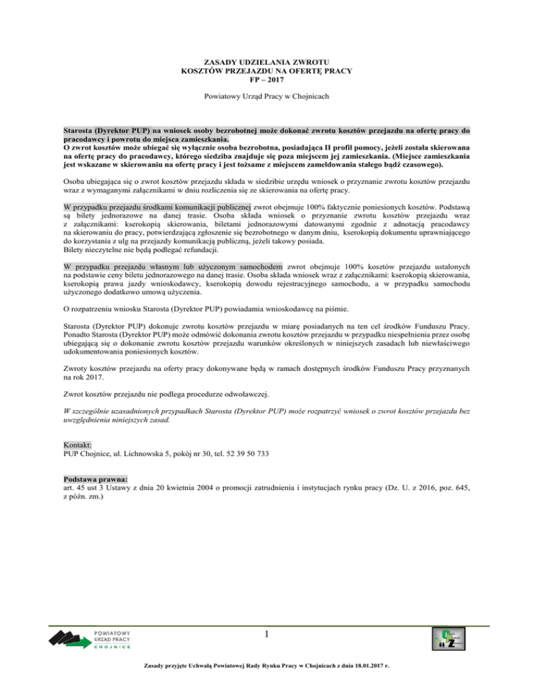 ZASADY UDZIELANIA ZWROTU KOSZTÓW PRZEJAZDU NA OFERTĘ PRACY FP – 2017 Powiatowy Urząd Pracy w Chojnicach Starosta (Dyrektor PUP) na wniosek osoby bezrobotnej może dokonać zwrotu kosztów przejazdu na ofertę pracy do pracodawcy i powrotu do miejsca zamieszkania. O zwrot kosztów może ubiegać się wyłącznie osoba bezrobotna, posiadająca II profil pomocy, jeżeli została skierowana na ofertę pracy do pracodawcy, którego siedziba znajduje się poza miejscem jej zamieszkania. (Miejsce zamieszkania jest wskazane w skierowaniu na ofertę pracy i jest tożsame z miejscem zameldowania stałego bądź czasowego). Osoba ubiegająca się o zwrot kosztów przejazdu składa w siedzibie urzędu wniosek o przyznanie zwrotu kosztów przejazdu wraz z wymaganymi załącznikami w dniu rozliczenia się ze skierowania na ofertę pracy. W przypadku przejazdu środkami komunikacji publicznej zwrot obejmuje 100% faktycznie poniesionych kosztów. Podstawą są bilety jednorazowe na danej trasie. Osoba składa wniosek o przyznanie zwrotu kosztów przejazdu wraz z załącznikami: kserokopią skierowania, biletami jednorazowymi datowanymi zgodnie z adnotacją pracodawcy na skierowaniu do pracy, potwierdzającą zgłoszenie się bezrobotnego w danym dniu, kserokopią dokumentu uprawniającego do korzystania z ulg na przejazdy komunikacją publiczną, jeżeli takowy posiada. Bilety nieczytelne nie będą podlegać refundacji. W przypadku przejazdu własnym lub użyczonym samochodem zwrot obejmuje 100% kosztów przejazdu ustalonych na podstawie ceny biletu jednorazowego na danej trasie. Osoba składa wniosek wraz z załącznikami: kserokopią skierowania, kserokopią prawa jazdy wnioskodawcy, kserokopią dowodu rejestracyjnego samochodu, a w przypadku samochodu użyczonego dodatkowo umową użyczenia. O rozpatrzeniu wniosku Starosta (Dyrektor PUP) powiadamia wnioskodawcę na piśmie. Starosta (Dyrektor PUP) dokonuje zwrotu kosztów przejazdu w miarę posiadanych na ten cel środków Funduszu Pracy. Ponadto Starosta (Dyrektor PUP) może odmówić dokonania zwrotu kosztów przejazdu w przypadku niespełnienia przez osobę ubiegającą się o dokonanie zwrotu kosztów przejazdu warunków określonych w niniejszych zasadach lub niewłaściwego udokumentowania poniesionych kosztów. Zwroty kosztów przejazdu na oferty pracy dokonywane będą w ramach dostępnych środków Funduszu Pracy przyznanych na rok 2017. Zwrot kosztów przejazdu nie podlega procedurze odwoławczej. W szczególnie uzasadnionych przypadkach Starosta (Dyrektor PUP) może rozpatrzyć wniosek o zwrot kosztów przejazdu bez uwzględnienia niniejszych zasad. Kontakt: PUP Chojnice, ul. Lichnowska 5, pokój nr 30, tel. 52 39 50 733 Podstawa prawna: art. 45 ust 3 Ustawy z dnia 20 kwietnia 2004 o promocji zatrudnienia i instytucjach rynku pracy (Dz. U. z 2016, poz. 645, z późn. zm.) 1 Zasady przyjęte Uchwałą Powiatowej Rady Rynku Pracy w Chojnicach z dnia 18.01.2017 r.