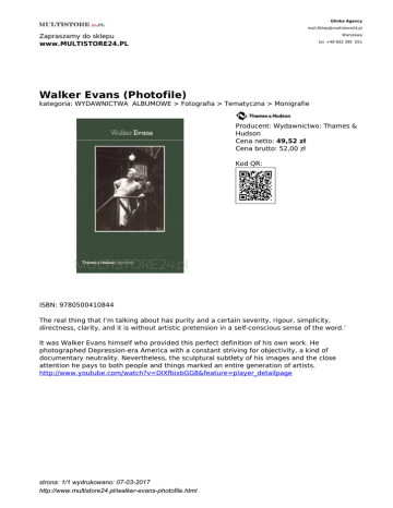 Glinka Agency mail;[email protected] Zapraszamy do sklepu www.MULTISTORE24.PL Warszawa tel. +48 602 395 051 Walker Evans (Photofile) kategoria: WYDAWNICTWA ALBUMOWE > Fotografia > Tematyczna > Monigrafie Producent: Wydawnictwo: Thames & Hudson Cena netto: 49,52 zł Cena brutto: 52,00 zł Kod QR: ISBN: 9780500410844 The real thing that I’m talking about has purity and a certain severity, rigour, simplicity, directness, clarity, and it is without artistic pretension in a self-conscious sense of the word.’ It was Walker Evans himself who provided this perfect definition of his own work. He photographed Depression-era America with a constant striving for objectivity, a kind of documentary neutrality. Nevertheless, the sculptural subtlety of his images and the close attention he pays to both people and things marked an entire generation of artists. http://www.youtube.com/watch?v=DlXfbixbGG8&feature=player_detailpage strona: 1/1 wydrukowano: 07-03-2017 http://www.multistore24.pl/walker-evans-photofile.html