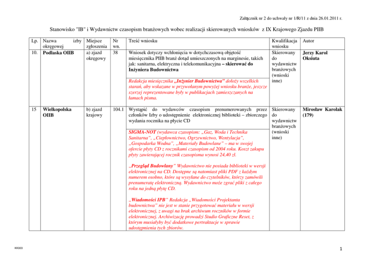 Załącznik nr 2 do uchwały nr 1/R/11 z dnia 26.01.2011 r. Stanowisko "IB" i Wydawnictw czasopism branżowych wobec realizacji skierowanych wniosków z IX Krajowego Zjazdu PIIB Lp. Nazwa izby Miejsce okręgowej zgłoszenia 10. Podlaska OIIB a) zjazd okręgowy Nr wn. 38 Treść wniosku Wniosek dotyczy wchłonięcia w dotychczasową objętość miesięcznika PIIB branż dotąd umieszczonych na marginesie, takich jak: sanitarna, elektryczna i telekomunikacyjna – skierować do Inżyniera Budownictwa Redakcja miesięcznika „Inżynier Budownictwa” dołoży wszelkich starań, aby wskazane w przywołanym powyżej wniosku branże, jeszcze szerzej reprezentowane były w publikacjach zamieszczanych na łamach pisma. 15 Wielkopolska OIIB b) zjazd krajowy Kwalifikacja wniosku Skierowany do wydawnictw branżowych (wnioski inne) 104.1 Wystąpić do wydawców czasopism prenumerowanych przez Skierowany członków Izby o udostępnienie elektronicznej biblioteki – zbiorczego do wydania rocznika na płycie CD wydawnictw branżowych (wnioski SIGMA-NOT (wydawca czasopism: „Gaz, Woda i Technika inne) Sanitarna”, „Ciepłownictwo, Ogrzewnictwo, Wentylacja”, „Gospodarka Wodna”, „Materiały Budowlane” – ma w swojej ofercie płyty CD z rocznikami czasopism od 2004 roku. Koszt zakupu płyty zawierającej rocznik czasopisma wynosi 24,40 zł. Autor Jerzy Karol Oksiuta Mirosław Karolak (179) „Przegląd Budowlany” Wydawnictwo nie posiada biblioteki w wersji elektronicznej na CD. Dostępne są natomiast pliki PDF z każdym numerem osobno, które są wysyłane do czytelników, którzy zamówili prenumeratę elektroniczną. Wydawnictwo może zgrać pliki z całego roku na jedną płytę CD. „Wiadomości IPB” Redakcja „Wiadomości Projektanta budownictwa” nie jest w stanie przygotować materiału w wersji elektronicznej, z uwagi na brak archiwum roczników w formie elektronicznej. Archiwizację prowadzi Studio Graficzne Reset, z którym musiałyby być dodatkowe pertraktacje w sprawie udostępnienia tych zbiorów. KK003 1 Załącznik nr 2 do uchwały nr 1/R/11 z dnia 26.01.2011 r. Stanowisko "IB" i Wydawnictw czasopism branżowych wobec realizacji skierowanych wniosków z IX Krajowego Zjazdu PIIB „Biuletyn INPE” Redakcja i zakład wydawniczy INPE postanowiły począwszy od Rocznika 2011 wysyłać płytę wraz z pierwszym numerem roku następnego. SEP COSIW (wydawca czasopisma:, „Spektrum – magazyn informacyjny SEP”) Wiadomości Melioracyjne i Łąkarskie redakcja Wiadomości Melioracyjnych i Łąkarskich od tego roku udostępni treść rocznika na płytce, która będzie dołączona do wysyłki ostatniego tegorocznego numeru. Sprawa będzie omawiana na najbliższym posiedzeniu Komitetu Redakcyjnego jeszcze w tym miesiącu i będzie skalkulowana cena prenumeraty papierowej w pakiecie z płytką. O podjętej decyzji i dostępności rocznika na płytce redakcja poinformuje Czytelników na łamach czasopisma. Brak odpowiedzi z Wydawnictw: Inżynieria i Budownictwo, Drogownictwo, Wiadomości Naftowe i Gazownicze, Inżynieria Morska i Geotechnika, KK003 2