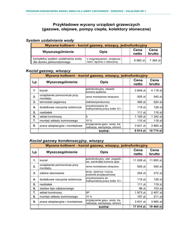 PROGRAM OGRANICZENIA NISKIEJ EMISJI DLA GMINY CZECHOWICE - DZIEDZICE - ZAŁĄCZNIK NR 3 Przykładowe wyceny urządzeń grzewczych (gazowe, olejowe, pompy ciepła, kolektory słoneczne) System uzdatniania wody Wycena kotłowni - kocioł gazowy, wiszący, jednofunkcyjny Cena Cena Wyszczególnienie Opis netto brutto kompletny system uzdatniania wody dla domku jednorodzinnego z magnetyzerem, zmiękczaniem, łącznie z robocizną 6 882 zł. 7 364 zł. Kocioł gazowy, wiszący Lp 1. 2. 3. Wycena kotłowni - kocioł gazowy, wiszący, jednofunkcyjny Cena Cena Wyszczególnienie Opis netto brutto kocioł urządzenie pomocnicze przy montaŜu termostat zegarowy 4. dodatkowe naczynie wzbiorcze 5. 6. 7. naddatek wkład kominowy montaŜ wkładu kominowego 8. prace adaptacyjne i montaŜowe jednofunkcyjny, otwarta komora spalania 3 848 zł. 4 118 zł. rama montaŜowa skręcana 505 zł. 540 zł. stałotemperaturowy 490 zł. 524 zł. przystosowane do maksymalnej pracy kotła 12 l. 119 zł. 128 zł. 111 zł. 1 100 zł. 110 zł. 119 zł. 1 342 zł. 118 zł. 3 631 zł. 3 885 zł. 9 914 zł. 10 774 zł. S 10 % przyłączenie gazu, wody, kanalizacja, wentylacja, remont suma: Kocioł gazowy kondensacyjny, wiszący Lp Wycena kotłowni - kocioł gazowy, wiszący, jednofunkcyjny Cena Cena Wyszczególnienie Opis netto brutto 1. kocioł jednofunkcyjny, ster. pogodowe, zamknięta komora spal. 2. urządzenie pomocnicze przy montaŜu rama montaŜowa skręcana 3. zdalne sterowanie 4. dodatkowe naczynie wzbiorcze 5. 6. 7. 8. naddatek zestaw leja odpływowego wkład kominowy montaŜ wkładu kominowego 9. prace adaptacyjne i montaŜowe temp. dzienna i nocna, przewód przyłączeniowy przystosowane do maksymalnej pracy kotła 12 l. SP 10 % przyłączenie gazu, wody, kanalizacja, wentylacja, remont suma: 11 028 zł. 11 800 zł. 505 zł. 540 zł. 254 zł. 272 zł. 119 zł. 128 zł. 111 zł. 96 zł. 1 973 zł. 197 zł. 119 zł. 103 zł. 2 407 zł. 211 zł. 3 631 zł. 3 885 zł. 17 914 zł. 19 464 zł. PROGRAM OGRANICZENIA NISKIEJ EMISJI DLA GMINY CZECHOWICE - DZIEDZICE - ZAŁĄCZNIK NR 3 Kocioł gazowy, wiszący Lp 1. Wycena kotłowni - kocioł gazowy, wiszący, dwufunkcyjny Cena Cena Wyszczególnienie Opis netto brutto kocioł 3. urządzenie pomocnicze przy montaŜu termostat zegarowy 4. dodatkowe naczynie wzbiorcze 5. 6. 7. naddatek wkład kominowy montaŜ wkładu kominowego 8. prace adaptacyjne i montaŜowe 2. dwufunkcyjny, otwarta komora spalania 4 691 zł. 5 019 zł. rama montaŜowa skręcana 643 zł. 688 zł. stałotemperaturowy przystosowane do maksymalnej pracy kotła 12 l. 490 zł. 524 zł. 119 zł. 128 zł. 111 zł. 1 100 zł. 110 zł. 119 zł. 1 342 zł. 118 zł. 3 631 zł. 3 885 zł. 10 895 zł. 11 822 zł. S 10 % przyłączenie gazu, wody, kanalizacja, wentylacja, remont suma: Kocioł gazowy kondensacyjny, wiszący Lp Wycena kotłowni - kocioł gazowy, wiszący, jednofunkcyjny Cena Cena Wyszczególnienie Opis netto brutto 1. kocioł dwufunkcyjny, ster. pogodowe zamknięta komora spalania 2. urządzenie pomocnicze przy montaŜu rama montaŜowa skręcana 3. zdalne sterowanie 4. dodatkowe naczynie wzbiorcze 5. 6. 7. 8. zestaw lejo odpływowego naddatek wkład kominowy montaŜ wkładu kominowego 9. prace adaptacyjne i montaŜowe temperatura dzienna i nocna, przewód przyłączeniowy przystosowane do maksymalnej pracy kotła 12 l. SP 10 % Przyłączenie gazu, wody, kanalizacja, wentylacja, remont suma: 13 322 zł. 14 254 zł. 643 zł. 688 zł. 254 zł. 272 zł. 119 zł. 128 zł. 96 zł. 111 zł. 1 973 zł. 197 zł. 103 zł. 119 zł. 2 407 zł. 211 zł. 3 631 zł. 3 885 zł. 20 346 zł. 22 066 zł. PROGRAM OGRANICZENIA NISKIEJ EMISJI DLA GMINY CZECHOWICE - DZIEDZICE - ZAŁĄCZNIK NR 3 Kocioł gazowy wolno stojący Wycena kotłowni - kocioł gazowy stojący Lp Wyszczególnienie 1. kocioł 2. termostat pokojowy 3. 4. 5. 6. 7. 8. 9. 10. roŜdzielacz obiegu grzewczego wspornik rozdzielacza przeponowe naczynie wzbiorcze armatura zabezpieczająca podstawa pod kocioł naddatek wkład kominowy montaŜ wkładu kominowego 11. prace adaptacyjne i montaŜowe Opis stałotemperaturowy do sterowania temperaturą pomieszczenia bez mieszacza podwójny 25 l. 5% S 10 % Przyłączenie gazu, wody, kanalizacja, wentylacja, remont suma: Cena netto Cena brutto 5 548 zł. 5 936 zł. 125 zł. 134 zł. 1 837 zł. 758 zł. 153 zł. 307 zł. 458 zł. 222 zł. 1 100 zł. 110 zł. 1 966 zł. 811 zł. 163 zł. 329 zł. 490 zł. 238 zł. 1 342 zł. 118 zł. 3 952 zł. 4 228 zł. 14 571 zł. 15 755 zł. Cena netto Cena brutto Kocioł gazowy wolno stojący Wycena kotłowni - kocioł gazowy stojący Lp Wyszczególnienie 1. kocioł 2. termostat pokojowy 3. 4. 5. 6. 7. 9. 10. 11. rozdzielacz obiegu grzewczego wspornik rozdzielacza przeponowe naczynie wzbiorcze armatura zabezpieczająca podstawa pod kocioł zestaw uzupełniający do obiegu z mieszaczem naddatek wkład kominowy montaŜ wkładu kominowego 12. prace adaptacyjne i montaŜowe 8. Opis regulator pogodowy elektroniczne sterowanie nastawa dzienna i tygodniowa z mieszaczem podwójny 25 l. komplet 5% S 10 % przyłączenie gazu, wody, kanalizacja, wentylacja, remont suma: 7 569 zł. 8 099 zł. 331 zł. 354 zł. 2 284 zł. 758 zł. 153 zł. 307 zł. 458 zł. 2 444 zł. 811 zł. 163 zł. 329 zł. 490 zł. 995 zł. 1 064 zł. 222 zł. 1 100 zł. 110 zł. 238 zł. 1 342 zł. 118 zł. 3 952 zł. 4 228 zł. 18 239 zł. 19 681 zł. PROGRAM OGRANICZENIA NISKIEJ EMISJI DLA GMINY CZECHOWICE - DZIEDZICE - ZAŁĄCZNIK NR 3 Kocioł gazowy kondensacyjny wolno stojący Wycena kotłowni - kocioł gazowy stojący Lp Wyszczególnienie Opis 1. 2. 3. regulator pogodowy standard 5. 6. 7. 8. 9. 10. kocioł termostat pokojowy rozdzielacz obiegu grzewczego zestaw uzupełniający do obiegu z mieszaczem naczynie wzbiorcze wspornik rozdzielacza mały rozdzielacz naddatek wkład kominowy montaŜ wkładu kominowego 11. prace adaptacyjne i montaŜowe 4. sterowanie z mieszaczem komplet 25 l. podwójny zestaw zabezpieczeń 5% S 10 % pr