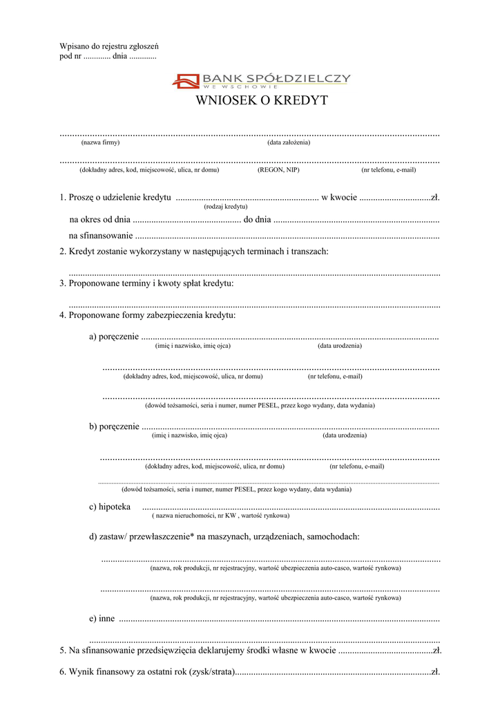 Wpisano do rejestru zgłoszeń pod nr ............. dnia ............. WNIOSEK O KREDYT ....................................................................................................................................................... (nazwa firmy) (data załoŜenia) ....................................................................................................................................................... (dokładny adres, kod, miejscowość, ulica, nr domu) (REGON, NIP) (nr telefonu, e-mail) 1. Proszę o udzielenie kredytu .............................................................. w kwocie ...............................zł. (rodzaj kredytu) na okres od dnia ............................................... do dnia ........................................................................ na sfinansowanie .................................................................................................................................... 2. Kredyt zostanie wykorzystany w następujących terminach i transzach: ................................................................................................................................................................. 3. Proponowane terminy i kwoty spłat kredytu: ................................................................................................................................................................. 4. Proponowane formy zabezpieczenia kredytu: a) poręczenie ................................................................................................................................. (imię i nazwisko, imię ojca) (data urodzenia) ...................................................................................................................................... (dokładny adres, kod, miejscowość, ulica, nr domu) (nr telefonu, e-mail) ...................................................................................................................................... (dowód toŜsamości, seria i numer, numer PESEL, przez kogo wydany, data wydania) b) poręczenie ................................................................................................................................. (imię i nazwisko, imię ojca) (data urodzenia) ....................................................................................................................................... (dokładny adres, kod, miejscowość, ulica, nr domu) (nr telefonu, e-mail) ........................................................................................................................................................................................................... (dowód toŜsamości, seria i numer, numer PESEL, przez kogo wydany, data wydania) c) hipoteka ................................................................................................................................. ( nazwa nieruchomości, nr KW , wartość rynkowa) d) zastaw/ przewłaszczenie* na maszynach, urządzeniach, samochodach: ................................................................................................................................................... (nazwa, rok produkcji, nr rejestracyjny, wartość ubezpieczenia auto-casco, wartość rynkowa) ................................................................................................................................................... (nazwa, rok produkcji, nr rejestracyjny, wartość ubezpieczenia auto-casco, wartość rynkowa) e) inne ........................................................................................................................................... ........................................................................................................................................................ 5. Na sfinansowanie przedsięwzięcia deklarujemy środki własne w kwocie .........................................zł. 6. Wynik finansowy za ostatni rok (zysk/strata).....................................................................................zł. 7. Wynik finansowy bieŜący (zysk/strata)..............................................................................................zł. 8. Dane dotyczące podmiotów gospodarczych w działalność których jesteście Państwo zaangaŜowani. Nazwa Adres Status prawny Wielkość udziałów w % 9. Zobowiązania wobec banków oraz innych osób prawnych i fizycznych. Bank / wierzyciel (nazwa i adres) Kwota kredytu / zobowiązania 10. Posiadane nieruchomości. Lokalizacja i wykorzystanie 11. Posiadane pojazdy i maszyny. Marka Rok produkcji Wartość rynkowa 12. Inne informacje: ................................................................................................................................... .................................................................................................................................................................... 13. Posiadamy otwarte rachunki bieŜące w Banku.................................................................................... .................................................................................................................................................................... 14. Na podstawie art. 105 ust.4a, 4a1, 4a2 ustawy Prawo bankowe z dnia 29 sierpnia 1997 (Dz. U. 2002, Nr 72 poz. 665 z późn. zm.) upowaŜniam Bank Spółdzielczy we Wschowie z siedzibą we Wschowie ul. Daszyńskiego 19 67-400 Wschowa do wystąpienia za pośrednictwem Biura Informacji Gospodarczej InfoMonitor S.A. z siedzibą w Warszawie („BIG InfoMonitor”) o udostępnienie z Biura Informacji Kredytowej S.A. i Związku Banków Polskich danych dotyczących mojego wymagalnego zadłuŜenia wobec banków lub instytucji upowaŜnionych do udzielania kredytów, przekraczającego 500 złotych (pięćset złotych) lub braku danych o takim zadłuŜeniu. 15. Wiarygodność podanych danych stwierdzam własnoręcznym podpisem pod rygorem 