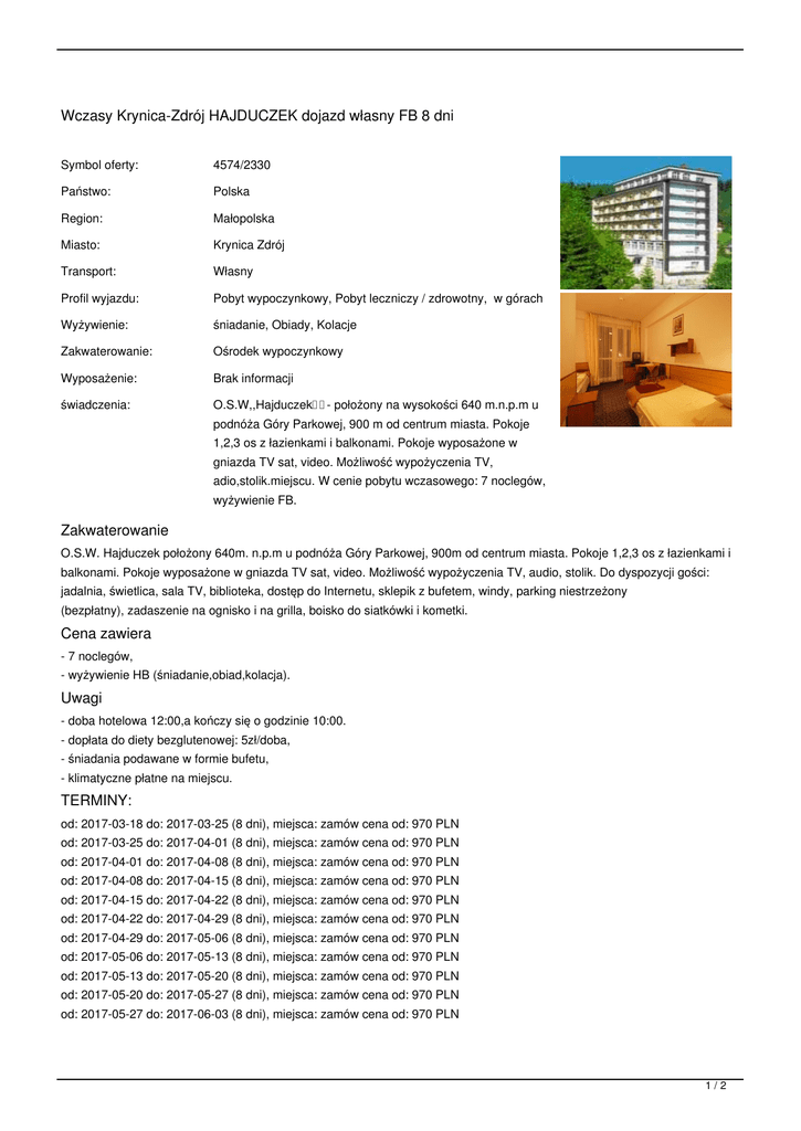 Wczasy Krynica-Zdrój HAJDUCZEK dojazd własny FB 8 dni Symbol oferty: 4574/2330 Państwo: Polska Region: Małopolska Miasto: Krynica Zdrój Transport: Własny Profil wyjazdu: Pobyt wypoczynkowy, Pobyt leczniczy / zdrowotny, w górach Wyżywienie: śniadanie, Obiady, Kolacje Zakwaterowanie: Ośrodek wypoczynkowy Wyposażenie: Brak informacji świadczenia: O.S.W,,Hajduczek- położony na wysokości 640 m.n.p.m u podnóża Góry Parkowej, 900 m od centrum miasta. Pokoje 1,2,3 os z łazienkami i balkonami. Pokoje wyposażone w gniazda TV sat, video. Możliwość wypożyczenia TV, adio,stolik.miejscu. W cenie pobytu wczasowego: 7 noclegów, wyżywienie FB. Zakwaterowanie O.S.W. Hajduczek położony 640m. n.p.m u podnóża Góry Parkowej, 900m od centrum miasta. Pokoje 1,2,3 os z łazienkami i balkonami. Pokoje wyposażone w gniazda TV sat, video. Możliwość wypożyczenia TV, audio, stolik. Do dyspozycji gości: jadalnia, świetlica, sala TV, biblioteka, dostęp do Internetu, sklepik z bufetem, windy, parking niestrzeżony (bezpłatny), zadaszenie na ognisko i na grilla, boisko do siatkówki i kometki. Cena zawiera - 7 noclegów, - wyżywienie HB (śniadanie,obiad,kolacja). Uwagi - doba hotelowa 12:00,a kończy się o godzinie 10:00. - dopłata do diety bezglutenowej: 5zł/doba, - śniadania podawane w formie bufetu, - klimatyczne płatne na miejscu. TERMINY: od: 2017-03-18 do: 2017-03-25 (8 dni), miejsca: zamów cena od: 970 PLN od: 2017-03-25 do: 2017-04-01 (8 dni), miejsca: zamów cena od: 970 PLN od: 2017-04-01 do: 2017-04-08 (8 dni), miejsca: zamów cena od: 970 PLN od: 2017-04-08 do: 2017-04-15 (8 dni), miejsca: zamów cena od: 970 PLN od: 2017-04-15 do: 2017-04-22 (8 dni), miejsca: zamów cena od: 970 PLN od: 2017-04-22 do: 2017-04-29 (8 dni), miejsca: zamów cena od: 970 PLN od: 2017-04-29 do: 2017-05-06 (8 dni), miejsca: zamów cena od: 970 PLN od: 2017-05-06 do: 2017-05-13 (8 dni), miejsca: zamów cena od: 970 PLN od: 2017-05-13 do: 2017-05-20 (8 dni), miejsca: zamów cena od: 970 PLN od: 2017-05-20 do: 2017-05-27 (8 dni), miejsca: zamów cena od: 970 PLN od: 2017-05-27 do: 2017-06-03 (8 dni), miejsca: zamów cena od: 970 PLN 1/2 od: 2017-06-03 do: 2017-06-10 (8 dni), miejsca: zamów cena od: 970 PLN od: 2017-09-16 do: 2017-09-23 (8 dni), miejsca: zamów cena od: 970 PLN od: 2017-09-23 do: 2017-09-30 (8 dni), miejsca: zamów cena od: 970 PLN od: 2017-09-30 do: 2017-10-07 (8 dni), miejsca: zamów cena od: 970 PLN od: 2017-10-07 do: 2017-10-14 (8 dni), miejsca: zamów cena od: 970 PLN od: 2017-10-14 do: 2017-10-21 (8 dni), miejsca: zamów cena od: 970 PLN od: 2017-10-21 do: 2017-10-28 (8 dni), miejsca: zamów cena od: 970 PLN od: 2017-10-28 do: 2017-11-04 (8 dni), miejsca: zamów cena od: 970 PLN od: 2017-11-04 do: 2017-11-11 (8 dni), miejsca: zamów cena od: 970 PLN od: 2017-11-11 do: 2017-11-18 (8 dni), miejsca: zamów cena od: 970 PLN od: 2017-11-18 do: 2017-11-25 (8 dni), miejsca: zamów cena od: 970 PLN od: 2017-11-25 do: 2017-12-02 (8 dni), miejsca: zamów cena od: 970 PLN od: 2017-12-02 do: 2017-12-09 (8 dni), miejsca: zamów cena od: 970 PLN CENNIK: Długość pobytu: 8 dni 8 dni Grupa cenowa: A B (-) (-) Wyżywienie (do wyboru) (*) FB (śniadanie obiad kolacja) Pobyt w obiekcie (do wyboru) (*) pokój dwuosobowy standardowo dla osób: 2 (-) POKÓJ TRZYOSOBOWY STUDIO standardowo dla osób: 3 (-) POKÓJ CZTEROOSOBOWY STUDIO standardowo dla osób: 4 (-) Pokój 2os z możliwością dostawki standardowo dla osób: 3 (-) Rodzaj osoby (do wyboru) dziecko 3-10lat w pokoju 2 os. z dost/studio (-) (-) (-) (-) 745 745 (-) (-) 930 930 970 970 785 785 970 Osoba dorosła w pokoju 2 os z możliwościa dostawki 930 970 Dzieci do lat 3 bez świadczeń Gratis Osoba dorosła w pokoju 4 os. typu STUDIO (*) osoba dorosła w pokoju 2 os dziecko 3-10lat w pokoju 2os./studio Osoba dorosła w pokoju 3 os. typu STUDIO Inne (do wyboru) dopłata do SGL 75 930 75 Waluta: PLN Aktualne ceny z systemu S.A.R.T. (-) - cena usługi, podatku kalkulowana przy osobie lub gratis (*) - kwota wliczona w cenę standardową 2/2
