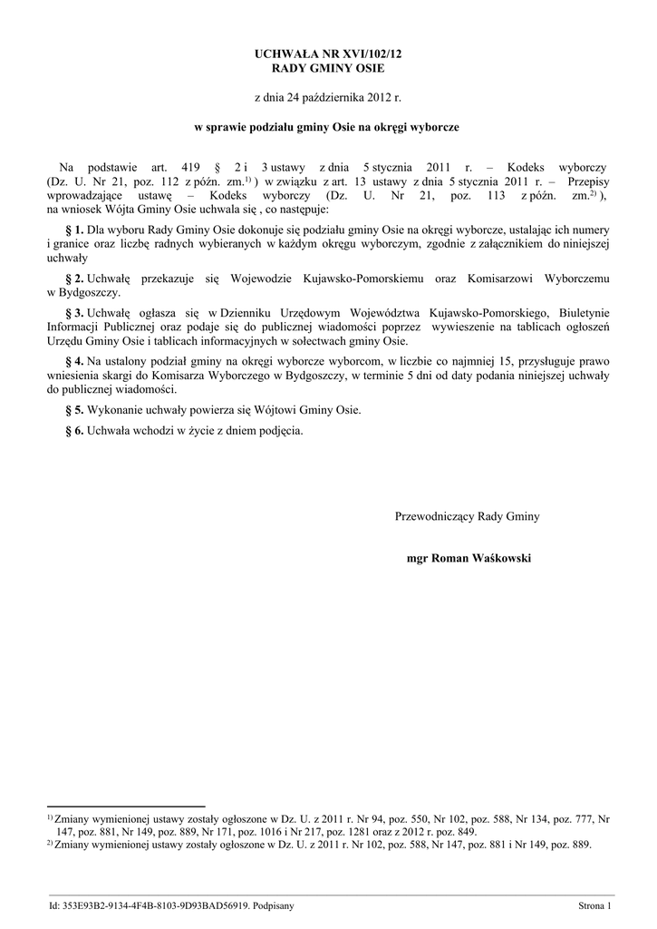 UCHWAŁA NR XVI/102/12 RADY GMINY OSIE z dnia 24 października 2012 r. w sprawie podziału gminy Osie na okręgi wyborcze Na podstawie art. 419 § 2 i 3 ustawy z dnia 5 stycznia 2011 r. – Kodeks wyborczy (Dz. U. Nr 21, poz. 112 z późn. zm.1) ) w związku z art. 13 ustawy z dnia 5 stycznia 2011 r. – Przepisy wprowadzające ustawę – Kodeks wyborczy (Dz. U. Nr 21, poz. 113 z późn. zm.2) ), na wniosek Wójta Gminy Osie uchwala się , co następuje: § 1. Dla wyboru Rady Gminy Osie dokonuje się podziału gminy Osie na okręgi wyborcze, ustalając ich numery i granice oraz liczbę radnych wybieranych w każdym okręgu wyborczym, zgodnie z załącznikiem do niniejszej uchwały § 2. Uchwałę przekazuje się Wojewodzie Kujawsko-Pomorskiemu oraz Komisarzowi Wyborczemu w Bydgoszczy. § 3. Uchwałę ogłasza się w Dzienniku Urzędowym Województwa Kujawsko-Pomorskiego, Biuletynie Informacji Publicznej oraz podaje się do publicznej wiadomości poprzez wywieszenie na tablicach ogłoszeń Urzędu Gminy Osie i tablicach informacyjnych w sołectwach gminy Osie. § 4. Na ustalony podział gminy na okręgi wyborcze wyborcom, w liczbie co najmniej 15, przysługuje prawo wniesienia skargi do Komisarza Wyborczego w Bydgoszczy, w terminie 5 dni od daty podania niniejszej uchwały do publicznej wiadomości. § 5. Wykonanie uchwały powierza się Wójtowi Gminy Osie. § 6. Uchwała wchodzi w życie z dniem podjęcia. Przewodniczący Rady Gminy mgr Roman Waśkowski 1) Zmiany wymienionej ustawy zostały ogłoszone w Dz. U. z 2011 r. Nr 94, poz. 550, Nr 102, poz. 588, Nr 134, poz. 777, Nr 147, poz. 881, Nr 149, poz. 889, Nr 171, poz. 1016 i Nr 217, poz. 1281 oraz z 2012 r. poz. 849. 2) Zmiany wymienionej ustawy zostały ogłoszone w Dz. U. z 2011 r. Nr 102, poz. 588, Nr 147, poz. 881 i Nr 149, poz. 889. ————————————————————————————————————————————————————————— Id: 353E93B2-9134-4F4B-8103-9D93BAD56919. Podpisany Strona 1 Załącznik do Uchwały Nr XVI/102/12 Rady Gminy Osie z dnia 24 października 2012 r. Numer okręgu wyborczego Granice okręgu wyborczego Liczba wybieranych radnych 1 Sołectwo OSIE –część, wieś OSIE ulice: DWORCOWA, DWORZEC, KOŚCIELNA, POLNA, PROF. ALFONSA HOFFMANNA, RYNEK, STARY TARTAK 2 Sołectwo OSIE –część, wieś OSIE ulice: BRZOZOWA, JODŁOWA, LIPOWA, MŁYŃSKA, SOSNOWA, SZKOLNA, ŚWIERKOWA Sołectwo OSIE –część, wieś OSIE ulice: BOCZNA, KOŚCIUSZKI, KS. SYCHTY, SIENKIEWICZA, WYBUDOWANIE POD JASZCZ, WYBUDOWANIE POD MIEDZNO, TARGOWA Sołectwo OSIE –część, wieś OSIE ulice: KOPERNIKA, MICKIEWICZA, PRUSA, SPORTOWA, osada GRZYBEK, przysiółek STARNIE Sołectwo OSIE –część, wieś OSIE ulice: KAMIENNA, STAROGARDZKA, WYBUDOWANIE POD NOWE, WYBUDOWANIE POD STAROGARD, osada leśna ORLI DWÓR, przysiółek OSKI PIEC Sołectwo OSIE –część, wieś OSIE ulice: GWARNA, KSIĘDZA SEMRAUA Sołectwo OSIE –część, wieś OSIE ulice: ANDRYKOWSKIEGO, DOLNA, KOCHANOWSKIEGO, NOWY ŚWIAT 1 8 Sołectwo BRZEZINY 1 9 Sołectwo MIEDZNO 1 10 Sołectwa: PRUSKIE , WIERZCHY 1 11 Sołectwa: RADAŃSKA, STRA RZEKA 1 12 Sołectwo JASZCZ 1 13 Sołectwo WAŁKOWISKA 1 14 Sołectwo TLEŃ 1 15 Sołectwo ŁĄŻEK 1 3 4 5 6 7 1 1 1 1 1 1 ————————————————————————————————————————————————————————— Id: 353E93B2-9134-4F4B-8103-9D93BAD56919. Podpisany Strona 1 Uzasadnienie Ustawa z dnia 5 stycznia 2011 r. – Kodeks wyborczy wprowadza tzw. jednomandatowe okręgi wyborcze , co oznacza, że w okręgu wyborczym tworzonym dla wyboru rady w gminie niebędącej miastem na prawach powiatu wybiera się 1 radnego . Zgodnie z art. 13 ust. 1 ustawy z dnia 5 stycznia 2011 r. Przepisy wprowadzające ustawę — Kodeks wyborczy (Dz. U. Nr 21, poz. 113, z późn. zm.1)) Rada Gminy, zobowiązana jest do dokonania podziału gmin na okręgi wyborcze w wyborach do rady gminy, w terminie do dnia 1 listopada 2012 r. Projekt podziału Gminy Osie na okręgi wyborcze opracowano zgodnie z zasadami wynikającymi z art. 417 – 419 ustawy - Kodeksu wyborczego. Zgodnie z przepisami w/w ustawy okręg wyborczy obejmuje część obszaru gminy. Przy dokonywaniu podziału brano pod uwagę zasadę , że w gminach na terenach wiejskichokręgiem wyborczym jest jednostka pomocnicza gminy (sołectwo) . Jednak z uwagi na fakt, że niektóre sołectwa nie posiadały odpowiedniej liczby mieszkańców na koniec III kwartału 2012 r. (zgodnej z normą przedstawicielką ) wystąpiła konieczność połączenia sąsiadujących ze sobą jednostek dla utworzenia okręgu wyborczego tj. - sołectwa: Pruskie, Wierzchy w jeden okręg wyborczy Nr 10 - sołectwo Radańska, Stara Rzeka w jeden okręg wyborczy Nr 11 Natomiast w przypadku sołectwa Osie należało je podzielić na 7 okręgów wyborczych. W związku z tym , że niemożliwe było dokonanie podziału Gminy Osie na okręgi wyborcze w sposób zapewniający dokładne zachowanie jednolitej normy przedstawicielstwa w każdym okręgu wyborczym, skorzystano z możliwości dopuszczalnego odchylenia od tej normy. Zakres dopuszczalnego odchylenia od jednolitej normy przedstawicielskiej określa art. 419 § 2 i 3 Kodeksu Wyborczego. Podział na okręgi wyborcze, ich granice i numery oraz liczbę radnych wybieranych w każdym okręgu ustala, na wniosek wójta, rada gminy według jednolitej normy przedstawicielstwaobliczonejprzez podzielenie liczby mieszkańców gminy przez liczbę radnych wybieranych do danej rady, z uwzględnieniem w/w i poniższych zasad. Dopuszczalne jest tworzenia na obszarze gminy jednomandatowych okręgów wyborczych, w których liczba mieszkańców jest równa 50% wartości jednolitej normy przedstawicielskiej lub większa od niej, a zarazem jest mniejsza od 150% tej wartości. W gminie Osie przedstawia się to następująco (na dzień 30.09.2012 