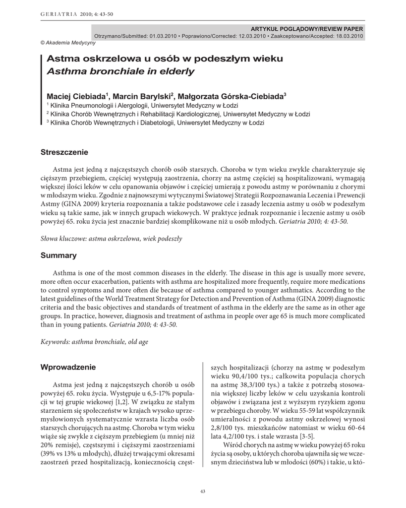 G E R I A T R I A 2010; 4: 43-50 ARTYKUŁ POGLĄDOWY/REVIEW PAPER Otrzymano/Submitted: 01.03.2010 • Poprawiono/Corrected: 12.03.2010 • Zaakceptowano/Accepted: 18.03.2010 © Akademia Medycyny Astma oskrzelowa u osób w podeszłym wieku Asthma bronchiale in elderly Maciej Ciebiada1, Marcin Barylski2, Małgorzata Górska-Ciebiada3 Klinika Pneumonologii i Alergologii, Uniwersytet Medyczny w Łodzi Klinika Chorób Wewnętrznych i Rehabilitacji Kardiologicznej, Uniwersytet Medyczny w Łodzi 3 Klinika Chorób Wewnętrznych i Diabetologii, Uniwersytet Medyczny w Łodzi 1 2 Streszczenie Astma jest jedną z najczęstszych chorób osób starszych. Choroba w tym wieku zwykle charakteryzuje się cięższym przebiegiem, częściej występują zaostrzenia, chorzy na astmę częściej są hospitalizowani, wymagają większej ilości leków w celu opanowania objawów i częściej umierają z powodu astmy w porównaniu z chorymi w młodszym wieku. Zgodnie z najnowszymi wytycznymi Światowej Strategii Rozpoznawania Leczenia i Prewencji Astmy (GINA 2009) kryteria rozpoznania a także podstawowe cele i zasady leczenia astmy u osób w podeszłym wieku są takie same, jak w innych grupach wiekowych. W praktyce jednak rozpoznanie i leczenie astmy u osób powyżej 65. roku życia jest znacznie bardziej skomplikowane niż u osób młodych. Geriatria 2010; 4: 43-50. Słowa kluczowe: astma oskrzelowa, wiek podeszły Summary Asthma is one of the most common diseases in the elderly. The disease in this age is usually more severe, more often occur exacerbation, patients with asthma are hospitalized more frequently, require more medications to control symptoms and more often die because of asthma compared to younger asthmatics. According to the latest guidelines of the World Treatment Strategy for Detection and Prevention of Asthma (GINA 2009) diagnostic criteria and the basic objectives and standards of treatment of asthma in the elderly are the same as in other age groups. In practice, however, diagnosis and treatment of asthma in people over age 65 is much more complicated than in young patients. Geriatria 2010; 4: 43-50. Keywords: asthma bronchiale, old age Wprowadzenie szych hospitalizacji (chorzy na astmę w podeszłym wieku 90,4/100 tys.; całkowita populacja chorych na astmę 38,3/100 tys.) a także z potrzebą stosowania większej liczby leków w celu uzyskania kontroli objawów i związana jest z wyższym ryzykiem zgonu w przebiegu choroby. W wieku 55-59 lat współczynnik umieralności z powodu astmy oskrzelowej wynosi 2,8/100 tys. mieszkańców natomiast w wieku 60-64 lata 4,2/100 tys. i stale wzrasta [3-5]. Wśród chorych na astmę w wieku powyżej 65 roku życia są osoby, u których choroba ujawniła się we wczesnym dzieciństwa lub w młodości (60%) i takie, u któ- Astma jest jedną z najczęstszych chorób u osób powyżej 65. roku życia. Występuje u 6,5-17% populacji w tej grupie wiekowej [1,2]. W związku ze stałym starzeniem się społeczeństw w krajach wysoko uprzemysłowionych systematycznie wzrasta liczba osób starszych chorujących na astmę. Choroba w tym wieku wiąże się zwykle z cięższym przebiegiem (u mniej niż 20% remisje), częstszymi i cięższymi zaostrzeniami (39% vs 13% u młodych), dłużej trwającymi okresami zaostrzeń przed hospitalizacją, koniecznością częst- 43 G E R I A T R I A 2010; 4: 43-50 rych choroba ujawniła się późno, dopiero po 60-65 roku życia (40%). Czas trwania choroby ma bezpośredni wpływ na ciężkość choroby u osób starszych. Przebieg choroby i rokowanie u chorych na astmę w podeszłym wieku zależy także od funkcji płuc, poziomu nadreaktywności oskrzeli, stopnia odwracalności obturacji, współistnienia atopii, percepcji objawów przez chorego, stosowanego leczenia i współistniejących chorób. pojemność życiowa płuc (FVC) i wskaźnik Tiffenau (FEV1/FVC) [10,11]. W zakresie FEV1 tempo rocznego spadku w wieku 60-79 lat jest znacznie większe niż w młodszej populacji i może sięgać od 32 mln/rok u kobiet do 37 mln/rok dla mężczyzn (w porównaniu do 5 mln/rok u kobiet i 4,5 mln/rok u mężczyzn w wieku 20-39 lat). Wraz z wiekiem, w wyniku wzrostu sztywności klatki piersiowej i zmniejszenia skoku sprężystego miąższu płuc, dochodzi także do niewielkiego wzrostu całkowitej pojemności życiowej płuc (TLC), czynnościowej pojemności zalegającej (FRC) i objętości zalegającej (RV). W następstwie zmian dokonujących się w układzie oddechowym u osób starszych występuje tendencja do przedwczesnego zamykania się drobnych oskrzelików w czasie wydechu i blokady wypływu powietrza z płuc (zjawisko pułapki powietrznej). Między 20. a 70. rokiem życia pułapka powietrza oceniana w badaniu pletyzmograficznym zwiększa się o ok. 50%. Pułapka może zwiększać prawdopodobieństwo wystąpienia nadreaktywności oskrzeli. Występowanie pułapki powietrznej u starszych chorych w czasie napadu astmy oskrzelowej nasila zjawisko hiperinflacji dynamicznej, zwiększa pracę mięśni oddechowych i nasila poczucie duszności [10,11]. W badaniach Cassino wykazano, że wielkość czynnościowej pojemności zalegającej (FRC) zależy od czasu trwania choroby a zwiększenie RV zależy od stopnia nasilenia zaburzeń obturacyjnych [12]. U osób starszych dochodzi także do zaburzenia autonomicznej regulacji napięcia mięśni dróg oddechowych. Wykazano, że u zdrowych osób w podeszłym wieku jak i u chorych na astmę o późnym początku objawów (po 65. roku życia) występuje nieprawidłowe powinowactwo receptorów beta do swoich agonistów, przy niezmienionej liczbie receptorów beta na powierzchni komórek (u młodych chorych na astmę liczba receptorów na powierzchni komórek jest zmniejszona). Nieprawidłowa funkcja receptora beta-adrenergicznego może być przyczyną zachwiania autoregulacji napięcia dróg oddechowych i sprzyja zmniejszonej odpowiedzi dróg oddechowych na leki bronchodilatacyjne. Przyczyniać się t