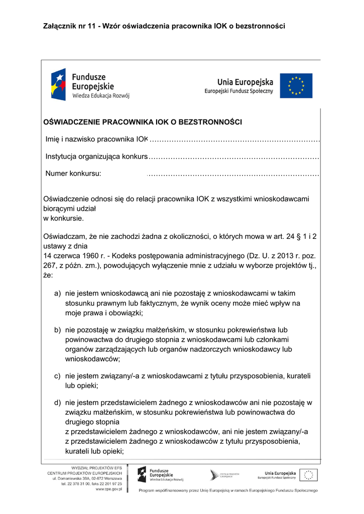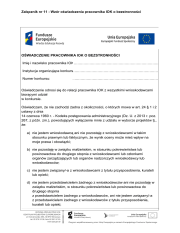 Zał. nr 11 Wzór oświadczenia pracownika IOK o bezstronności