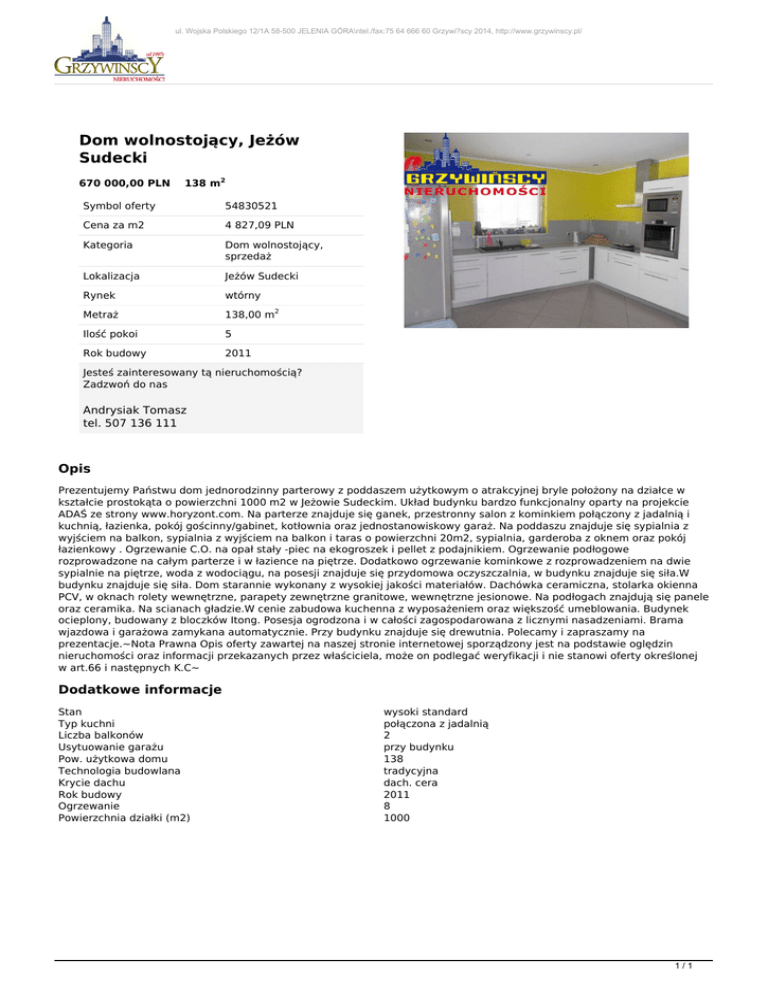 ul. Wojska Polskiego 12/1A 58-500 JELENIA GÓRA\ntel./fax:75 64 666 60 Grzywi?scy 2014, http://www.grzywinscy.pl/ Dom wolnostojący, Jeżów Sudecki 670 000,00 PLN 138 m2 Symbol oferty 54830521 Cena za m2 4 827,09 PLN Kategoria Dom wolnostojący, sprzedaż Lokalizacja Jeżów Sudecki Rynek wtórny Metraż 138,00 m2 Ilość pokoi 5 Rok budowy 2011 Jesteś zainteresowany tą nieruchomością? Zadzwoń do nas Andrysiak Tomasz tel. 507 136 111 Opis Prezentujemy Państwu dom jednorodzinny parterowy z poddaszem użytkowym o atrakcyjnej bryle położony na działce w kształcie prostokąta o powierzchni 1000 m2 w Jeżowie Sudeckim. Układ budynku bardzo funkcjonalny oparty na projekcie ADAŚ ze strony www.horyzont.com. Na parterze znajduje się ganek, przestronny salon z kominkiem połączony z jadalnią i kuchnią, łazienka, pokój gościnny/gabinet, kotłownia oraz jednostanowiskowy garaż. Na poddaszu znajduje się sypialnia z wyjściem na balkon, sypialnia z wyjściem na balkon i taras o powierzchni 20m2, sypialnia, garderoba z oknem oraz pokój łazienkowy . Ogrzewanie C.O. na opał stały -piec na ekogroszek i pellet z podajnikiem. Ogrzewanie podłogowe rozprowadzone na całym parterze i w łazience na piętrze. Dodatkowo ogrzewanie kominkowe z rozprowadzeniem na dwie sypialnie na piętrze, woda z wodociągu, na posesji znajduje się przydomowa oczyszczalnia, w budynku znajduje się siła.W budynku znajduje się siła. Dom starannie wykonany z wysokiej jakości materiałów. Dachówka ceramiczna, stolarka okienna PCV, w oknach rolety wewnętrzne, parapety zewnętrzne granitowe, wewnętrzne jesionowe. Na podłogach znajdują się panele oraz ceramika. Na scianach gładzie.W cenie zabudowa kuchenna z wyposażeniem oraz większość umeblowania. Budynek ocieplony, budowany z bloczków Itong. Posesja ogrodzona i w całości zagospodarowana z licznymi nasadzeniami. Brama wjazdowa i garażowa zamykana automatycznie. Przy budynku znajduje się drewutnia. Polecamy i zapraszamy na prezentacje.~Nota Prawna Opis oferty zawartej na naszej stronie internetowej sporządzony jest na podstawie oględzin nieruchomości oraz informacji przekazanych przez właściciela, może on podlegać weryfikacji i nie stanowi oferty określonej w art.66 i następnych K.C~ Dodatkowe informacje Stan Typ kuchni Liczba balkonów Usytuowanie garażu Pow. użytkowa domu Technologia budowlana Krycie dachu Rok budowy Ogrzewanie Powierzchnia działki (m2) wysoki standard połączona z jadalnią 2 przy budynku 138 tradycyjna dach. cera 2011 8 1000 1/1 Powered by TCPDF (www.tcpdf.org)