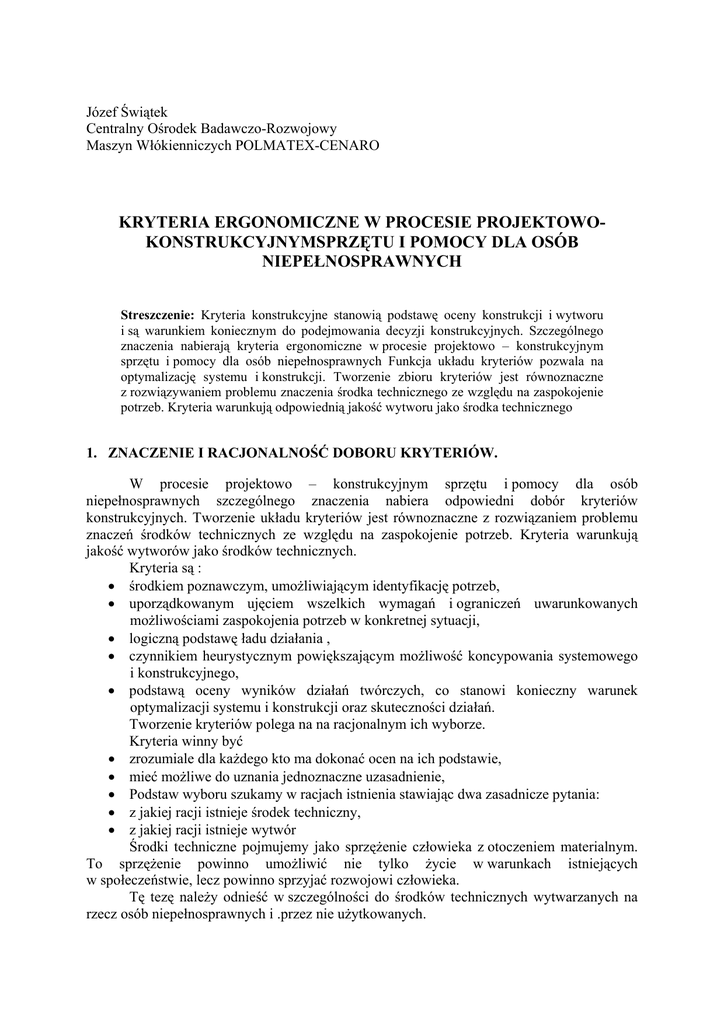 KRYTERIA ERGONOMICZNE W PROCESIE PROJEKTOWOKONSTRUKCYJNYMSPRZĘTU I POMOCY DLA OSÓB