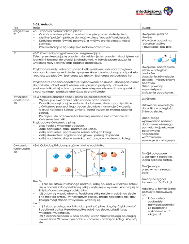 Tok rozgrzewka 3' 5' 3-03. Wahadło Treść 43-1. Zabawa bieżna: "chroń plecy". − Obrońca kozłuje piłkę i chroni własne plecy przed dotknięciem. − Myśliwy "poluje" - próbuje dotknąć w plecy "obcych" kozłujących. − Kozłujący może również polować, a myśliwy bronić pleców kolegi z dwójki. − Przemieszczajcie się wyłącznie krokiem dostawnym. Uwagi Dwójkami, piłka na dwójkę. W dwójce podział na "obrońcę" z piłką i "myśliwego" bez piłki. 43-2. Ćwiczenia przygotowujące i rozgrzewające. Dzieci przemieszczają się przodem do siebie - jeden przodem drugi tyłem, od jednej linii bocznej do drugiej (wahadłowo). W trakcie przemieszczania wykonują rzuty i chwyty oraz zadania dodatkowe. Dwójkami, naprzeciwko siebie w odległości około 3m. Ustawienie: równolegle do siatki - między liniami Przykładowe zadania dodatkowe wykonywane po rzucie: -dotknięcie dłonią bocznymi. do parkietu, -obrót wokół własnej osi, -przysiad podparty, -doskok do Dzieci powinny postawy siatkarskiej w bok i z powrotem, -stepowanie w rozkroku, -podskoki zapamiętywać z nogi na nogę, -podskoki obunóż ze skrętami bioder. ćwiczenia dodatkowe. Przykładowe rzuty: -oburącz sprzed klatki piersiowej, -oburącz zza głowy, -oburącz kozłem sprzed bioder, -poprzez skłon tułowia, oburącz od parkietu, -oburącz zza pleców, -jednorącz zza głowy, -jednorącz po parkiecie itp. ćwiczenia analityczne 10' ćwiczenia syntetyczne 10' 43-3. Odbicia oburącz dolne i górne po przemieszczeniu. − Wykonujcie ćwiczenia z piłką zadane przez trenera. − Dodatkowo wykonujcie zadania dodatkowe, które zapamiętaliście z ćwiczenia poprzedniego. Jeden decyduje - wykonuje ćwiczenie, a drugi naśladuje kolegę. Zmiana "lidera" razem ze zmianą zadania z piłką. − Po dojściu do przeciwnej linii bocznej zmieńcie role i zmieńcie też ćwiczenie bez piłki. Przykładowe ćwiczenia z piłką: − złap i odbij z własnego podrzutu, − odbij nad siebie, złap i podrzuć do kolegi, − odbij nad siebie, poczekaj na kozioł i odbij do kolegi, − odbij dwukrotnie: najpierw nad głowę i później do przodu, − odbij nad siebie, złap w wyskoku, rzuć zza głowy kozłem do kolegi. Dwójkami. Ustawienie: równolegle do siatki - w odległości 5-6m od siebie. Dzieci mogą wprowadzać zadania dodatkowe własnego pomysłu. Najciekawsze powinny być nagrodzone wyróżnieniem wykonuje je cała grupa. 43-4. Odbicia piłki oburącz górne i dolne nad siatką. Dwójki połączone w zastępy 4-osobowe, jedna piłka na zastęp. Dwójkami po przeciwnych stronach siatki. ćw. A. − (1) Zza linii ataku, z własnego podrzutu odbij oburącz w wyskoku. Ustaw się w obronie i złap przebijaną piłkę - najlepiej w wyskoku. Wycofaj się za linię końcową swojego boiska (5m). − (2) Ustaw się w polu obrony. Przebijaną piłkę najpierw odbij nad siebie i na metr do przodu. W następnym odbiciu przebij nad siatką tak, aby kolega mógł złapać w wyskoku. Wycofaj się. ćw. B − (1) Z siadu prostego na linii ataku, podrzuć piłkę do góry. Szybko wstań i odbij nad siatką. Przebijaną piłkę odbij nad siebie, usiądź i złap w siadzie. Wycofaj się. − (2) Z leżenia przodem w polu obrony, wstań razem z kolegą po drugiej stronie siatki. W pierwszym odbiciu - od razu - przebij do kolegi. Wycofaj się. Zmiany na sygnał trenera co 10-12 akcji. Najpierw w formie ścisłej później w zabawowej, np.: − który zastęp zdobędzie najwięcej punktów za bezbłędne wykonanie w 15 akcjach? ćwiczenia globalne 10' część końcowa 2' 43-5. Zabawa: "najdłuższa akcja" na dwa odbicia. − Odbij piłkę nad siatką tak, aby ułatwić odbicie koledze po drugiej stronie - współpracujecie. Po przebiciu nad siatką wycofaj się za plecy kolegi po swojej stronie. − Zawsze każdy może odbić piłkę dwukrotnie - nieobowiązkowo, pod warunkiem, że drugie odbicie musi być inne niż pierwsze, np.: jeśli pierwsze było "dolne", to drugie musi być "górne". − Liczcie odbicia nad siatką w jednej serii - do błędu. Po błędzie nową serię liczcie od zera. 43-6. Ćwiczenia rozciągające. Siad rozkroczny, kolana proste, ramiona w górze. Skłon boczny, z podparciem ręki kierunkowej na parkiecie. Dwójki w zastępach 4-osobowych. W kolejnych rundach zabawy dwójki łączone w inne zastępy wg systemu: "każdy z każdym".
