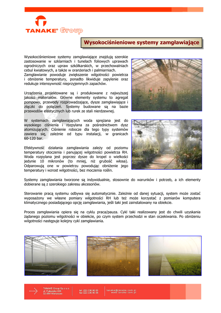 Wysokociśnieniowe systemy zamgławiające Wysokociśnieniowe systemy zamgławiające znajdują szerokie zastosowanie w szklarniach i tunelach foliowych uprawach ogrodniczych oraz upraw szkółkarskich, w przechowalniach cebul kwiatowych, a takŜe w oranŜeriach i palmiarniach. Zamgławianie powoduje zwiększenie wilgotności powietrza i obniŜenie temperatury, ponadto likwiduje zapylenie oraz redukuje intensywność nieprzyjemnych zapachów. Urządzenia projektowane są i produkowane z najwyŜszej jakości materiałów. Główne elementy systemu to agregat pompowy, przewody rozprowadzające, dysze zamgławiające i złączki do połączeń. Systemy budowane są na bazie przewodów elastycznych lub rurek ze stali nierdzewnej. W systemach zamgławiających woda spręŜana jest do wysokiego ciśnienia i rozpylana za pośrednictwem dysz atomizujących. Ciśnienie robocze dla tego typy systemów zawiera się, zaleŜnie od typu instalacji, w granicach 60-120 bar. Efektywność działania zamgławiania zaleŜy od poziomu temperatury otoczenia i panującej wilgotności powietrza RH. Woda rozpylana jest poprzez dysze do kropel o wielkości jedynie 10 mikronów (to mniej, niŜ grubość włosa). Odparowują one w powietrzu powodując obniŜenie jego temperatury i wzrost wilgotności, bez moczenia roślin. Systemy zamgławiania tworzone są indywidualnie, stosownie do warunków i potrzeb, a ich elementy dobierane są z szerokiego zakresu akcesoriów. Sterowanie pracą systemu odbywa się automatycznie. ZaleŜnie od danej sytuacji, system moŜe zostać wyposaŜony we własne pomiary wilgotności RH lub teŜ moŜe korzystać z pomiarów komputera klimatycznego posiadającego opcję zamgławiania, jeśli taki jest zainstalowany na obiekcie. Proces zamgławiania opiera się na cyklu praca/pauza. Cykl taki realizowany jest do chwili uzyskania Ŝądanego poziomu wilgotności w obiekcie, po czym system przechodzi w stan oczekiwania. Po obniŜeniu wilgotności następuje kolejny cykl zamgławiania.