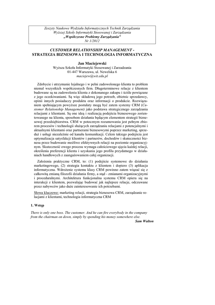 Zeszyty Naukowe Wydziału Informatycznych Technik Zarządzania Wyższej Szkoły Informatyki Stosowanej i Zarządzania „Współczesne Problemy Zarządzania” Nr 1/2012 CUSTOMER RELATIONSHIP MANAGEMENT STRATEGIA BIZNESOWA I TECHNOLOGIA INFORMATYCZNA Jan Maciejewski Wyższa Szkoła Informatyki Stosowanej i Zarzadzania 01-447 Warszawa, ul. Newelska 6 [email protected] Zdobycie i utrzymanie lojalnego i w pełni zadowolonego klienta to problem niemal wszystkich współczesnych firm. Długoterminowe relacje z klientem budowane są na zadowoleniu klienta z dokonanego zakupu i ściśle powiązane z jego oczekiwaniami. Są więc składową jego potrzeb, obietnic sprzedawcy, opinii innych posiadaczy produktu oraz informacji o produkcie. Rozwiązaniem spełniającym powyższe postulaty mogą być zatem systemy CRM (Customer Relationship Management) jako podstawa strategicznego zarządzania relacjami z klientami. Są one ideą i realizacją podejścia biznesowego zorientowanego na klienta, sposobem działania będącym elementem strategii biznesowej przedsiębiorstwa. CRM w potocznym rozumowaniu jest pełnym zbiorem procesów i technologii służących zarządzaniu relacjami z potencjalnymi i aktualnymi klientami oraz partnerami biznesowymi poprzez marketing, sprzedaż i usługi niezależnie od kanału komunikacji. Celem takiego podejścia jest optymalizacja satysfakcji klientów i partnerów, dochodów i skuteczności biznesu przez budowanie możliwe efektywnych relacji na poziomie organizacyjnym. Skuteczność owego procesu wymaga całościowego ujęcia każdej relacji, określenia preferencji klienta i uzyskania jego profilu przydatnego w działaniach handlowych z zaangażowaniem całej organizacji. Założenia praktyczne CRM, to: (1) podejście systemowe do działania marketingowego, (2) strategia kontaktu z klientem i dopiero (3) aplikacja informatyczna. Wdrożenie systemu klasy CRM powinno zatem wiązać się z całkowitą zmianą filozofii działania firmy, a stąd - zmianami organizacyjnymi i proceduralnymi. Architektura funkcjonalna systemu CRM opiera się na interakcji z klientem, pozwalając budować jak najlepsze relacje, odczuwane przez nabywców jako duże zainteresowanie ich potrzebami. Słowa kluczowe: marketing relacji, strategia biznesowa CRM, zarządzanie relacjami z klientami, technologia informatyczna CRM 1. Wstęp There is only one boss. The customer. And he can fire everybody in the company from the chairman on down, simply by spending his money somewhere else. Sam Walton J. Maciejewski Podstawą zorientowanej na klienta i odnoszącej sukcesy firmy jest zdolność pozyskiwania i utrzymywania klientów przynoszących zyski. Jednym z istotnych sposobów osiągnięcia tego celu jest umiejętność efektywnego zarządzania relacjami z klientami. Proces ich obsługi przekracza na ogół granice funkcjonalne poszczególnych działów organizacji. To nie tylko dział sprzedaży, ale również działy serwisu, marketingu, logistyki i controllingu, biorą udział w pełnym cyklu kontaktów z klientami, bowiem relacje z klientem, które nawiązane zostały w jednym dziale, mają wpływ na rodzaj i treść kontaktów w innych działach czy departamentach danej firmy. Granice działów, a często także fizyczne oddalenie utrudniają wymianę informacji o klientach, a w przypadku znacznej ich liczby wręcz ją uniemożliwiają. Problemy występują także przy zarządzaniu polityką kontaktów z wybranymi jednostkami i grupami klientów. Tymczasem, efektywna obsługa klienta wymaga profesjonalnej wiedzy o wszystkich jego kontaktach z pracownikami firmy, wiedzy dostępnej w łatwy, przejrzysty sposób i w stosunkowo szybkim czasie. Rozwiązaniem wskazanych problemów może być systemowe ujęcie zarzadzania relacjami z klientami wsparte zintegrowanym systemem informatycznym o bardzo popularnym dziś akronimie – CRM (ang. Customer Relationship Management), oznaczającym Zarządzanie Relacjami z Klientami. System taki wyposażony w centralne repozytorium danych, jakim jest hurtownia danych z systemami Business Intelligence i Data Mining jest w stanie dostarczyć pełny zakres informacji i wiedzy w zakresie tworzenia strategii biznesowej organizacji. Jest to kompletne od strony organizacyjnej i technologicznej rozwiązanie informatyczne dla przedsiębiorstw, wspierające pracę wszystkich działów organizacji pracujących w bezpośrednim kontakcie z klientem. System taki umożliwia zamknięcie „pętli obsługi klienta”, zaczynając od poszukiwań związanych z typowaniem potencjalnego klienta, akcjach marketingowych, sprzedaży, produkcji, logistyce, finansach, na wsparciu klienta kończąc. Umożliwia zatem szybki dostęp agenta kontaktującego się z klientem do pełnej informacji o nim w każdej chwili. Rozwiązania tego typu ułatwiają przedsiębiorstwom dynamiczną relację z klientami, udostępniając narzędzia, które są intuicyjne dla użytkowników i efektywne dla przedsiębiorstwa. Zastosowanie tego typu narzędzi ułatwia przejście od tradycyjnego modelu marketingu, sprzedaży i obsługi klienta do modelu z wykorzystaniem technologii teleinformatycznych w tym infrastruktury Internetu jako nowoczesnego medium, tworząc mobilne e’CRM-y. Pozwala to na szerszą penetrację rynku i lepszą obsługę klienta, a także umożliwia indywidualizację produktów i usług dla coraz to bardziej wyrafinowanych grup klientów. Systemy tego typu zapewniają ramy i podstawowe narzędzia do kontaktów z klientem i oceny jego potrzeb, zaś zintegrowanie systemów teleinformatycznych w organizacyjne Contact Center, pozwala optymalnie realizować niezbędne działania operacyjne, co wpływa na zaspokojenie potrzeb wymagającego dziś klienta w ramach silnej konkurencyjności. 100 Customer Relationship Management Artykuł niniejszy ma wykazać, że CRM, jako współczesne narzędzie marketingowe skierowane do klienta, to nie tylko system informatyczny, ale przede wszystkim systemowe podej