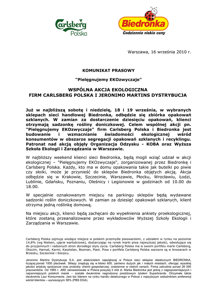 Warszawa, 16 września 2010 r. KOMUNIKAT PRASOWY "Pielęgnujemy EKOzwyczaje" WSPÓLNA AKCJA EKOLOGICZNA FIRM CARLSBERG POLSKA I JERONIMO MARTINS DYSTRYBUCJA Już w najbliższą sobotę i niedzielę, 18 i 19 września, w wybranych sklepach sieci handlowej Biedronka, odbędzie się zbiórka opakowań szklanych. W zamian za dostarczenie dziesięciu opakowań, klienci otrzymają sadzonkę rośliny doniczkowej. Celem wspólnej akcji pn. "Pielęgnujemy EKOzwyczaje" firm Carlsberg Polska i Biedronka jest budowanie i wzmacnianie świadomości ekologicznej wśród konsumentów w obszarze segregacji opakowań szklanych i recyklingu. Patronat nad akcją objęły Organizacja Odzysku - KOBA oraz Wyższa Szkoła Ekologii i Zarządzania w Warszawie. W najbliższy weekend klienci sieci Biedronka, będą mogli wziąć udział w akcji ekologicznej – "Pielęgnujemy EKOzwyczaje", zorganizowanej przez Biedronkę i Carlsberg Polska. Każdy, kto ma w domu opakowania takie jak butelki po piwie czy słoiki, może je przynieść do sklepów Biedronka objętych akcją. Akcja odbędzie się w Krakowie, Szczecinie, Warszawie, Płocku, Wrocławiu, Łodzi, Lublinie, Gdańsku, Poznaniu, Oleśnicy i Legionowie w godzinach od 10.00 do 18.00. W specjalnie oznakowanym miejscu na parkingu sklepów będą wydawane sadzonki roślin doniczkowych. W zamian za dziesięć opakowań szklanych, klient otrzyma jedną roślinkę domową. Na miejscu akcji, klienci będą zachęcani do wypełnienia ankiety proekologicznej, które zostaną przeanalizowane przez wykładowców Wyższej Szkoły Ekologii i Zarządzania w Warszawie. Carlsberg Polska zajmuje wiodące miejsce w polskim przemyśle piwowarskim, z udziałem w rynku na poziomie 14,8% (wg Nielsen, ujęcie wartościowe), dostarczając na rynek marki piwa najwyższej jakości, odwołujące się do przyjemnych i radosnych stron dorosłego stylu życia. Carlsberg Polska ma w swoim portfelu marki Carlsberg, Okocim, Harnaś, Karmi, Kasztelan, Bosman, Piast. Piwa z portfela Carlsberg Polska warzone są w browarach w Brzesku, Szczecinie i Sierpcu. Jeronimo Martins Dystrybucja S.A. jest właścicielem największej w Polsce sieci sklepów detalicznych BIEDRONKA, liczącej ponad 1500 placówek. Sklepy znajdują się w blisko 600, zarówno dużych jak i małych miastach, oferując wysokiej jakości artykuły spożywcze oraz produkty chemii gospodarczej, codziennie w niskich cenach. Firma zatrudnia ponad 26 000 pracowników. Od 1995 r. JMD zainwestowała w Polsce powyżej 3 mld zł. Marka Biedronka jest jedną z najpopularniejszych i najcenniejszych polskich marek – została dwukrotnie nagrodzona prestiżowym tytułem Superbrands. Otrzymała także dwukrotnie Laur Konsumenta. Jest też liderem na rynku handlu detalicznego w Polsce z najwyższym wskaźnikiem preferencji wśród klientów – wynoszącym 58% (PBS DGA). "Troska o środowisko naturalne to jeden z filarów filozofii działania Biedronki. Wdrażamy go w praktyce w naszych sklepach, m.in. stosując system segregacji odpadów i stawiając na oszczędność. Kładziemy również wielki nacisk na promocję postaw przyjaznych środowisku wśród naszych pracowników i klientów. Stąd udział Biedronki w takich akcjach, jak Dzień Ziemi czy niniejszy projekt realizowany wspólnie z Carlsberg Polska. Takich działań nigdy nie za dużo!"Dagmara Łakoma, Starszy Specjalista ds. Ochrony Środowiska Jeronimo Martins Dystrybucja. "Rozwijana od wielu lat polityka ekologiczna jest jednym z najważniejszych filarów działalności Carlsberg Polska. Aby minimalizować wpływ naszych browarów i biur na otoczenie, poczyniliśmy wiele inwestycji proekologicznych, prowadzimy również edukacyjny program Zielone Biuro wśród naszych pracowników. Jednocześnie czujemy powinność edukowania naszego konsumenta, wyjaśniania, co należy uczynić z butelką po wypiciu trunku. Jedynym sprawdzonym sposobem na zmniejszenie problemów ekologicznych związanych z opakowaniami szklanymi jest ich recykling, który oszczędza zużycie energii i zapobiega gromadzeniu odpadów" - mówi Adam Pawełas, Menedżer ds. Środowiska w Carlsberg Polska. "To bardzo słuszna inicjatywa, dlatego w pełni ją popierając, objęliśmy nad nią patronat. Jestem przekonany, że połączenie sił obu firm przy organizacji ekologicznej akcji edukacyjnej, zwiększy dotarcie do konsumentów z prośrodowiskowym apelem o segregację odpadów w naszych domach. Tego rodzaju akcje są potrzebne, by w szczególny sposób uczulić konsumentów na odpowiedzialne postępowanie z opakowaniami szklanymi."– mówi Zbigniew Skowronek, Dyrektor ds. Handlowych w KOBA, Organizacji Odzysku S.A. Organizacja Odzysku KOBA zapewni profesjonalny, proekologiczny recykling szkła, zebranego podczas ogólnopolskiej akcji "Pielęgnujemy EKOzwyczaje". Komunikacja akcji "Pielęgnujemy EKOzwyczaje" odbywa się na poziomie sklepów Biedronka objętych promocją poprzez plakaty i ulotki. Rewers ulotki zawiera treści edukacyjne, przedstawiając korzyści dla środowiska naturalnego z segregacji odpadów szklanych. Wskazuje jednocześnie prawidłowy sposób segregowania w domach i na osiedlach mieszkaniowych. Akcją ekologiczną zostały objęte poniższe sklepy sieci handlowej Biedronka: Poznań ul. Bukowska 121/123 Carlsberg Polska zajmuje wiodące miejsce w polskim przemyśle piwowarskim, z udziałem w rynku na poziomie 14,8% (wg Nielsen, ujęcie wartościowe), dostarczając na rynek marki piwa najwyższej jakości, odwołujące się do przyjemnych i radosnych stron dorosłego stylu życia. Carlsberg Polska ma w swoim portfelu marki Carlsberg, Okocim, Harnaś, Karmi, Kasztelan, Bosman, Piast. Piwa z portfela Carlsberg Polska warzone są w browarach w Brzesku, Szczecinie i Sierpcu. Jeronimo Martins Dystrybucja S.A. jest właścicielem największej w Polsce sieci sklepów detalicznych BIEDRONKA, liczącej ponad 1500 placówek. Sklepy znajdują się w blisko 600, zarówno dużych jak i małych miastach, ofer