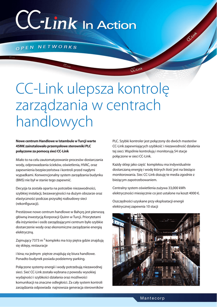 CC-Link ulepsza kontrolę zarządzania w centrach handlowych Nowe centrum Handlowe w Istambule w Turcji warte 45M€ zainstalowało przemysłowe sterowniki PLC połączone za pomocą sieci CC-Link Miało to na celu zautomatyzowanie procesów dostarczania wody, odprowadzania ścieków, oświetlenia, HVAC, oraz zapewnienia bezpieczeństwa i kontroli przed nagłymi wypadkami. Konwencjonalny system zarządzania budynku (BMS) nie był w stanie tego zapewnić. Decyzja ta została oparta na potrzebie niezawodności, szybkiej instalacji, bezawaryjności na dużym obszarze oraz elastyczności podczas przyszłej rozbudowy sieci (rekonfiguracji). PLC. Szybki kontroler jest połączony do dwóch masterów CC-Link zapewniających szybkość i niezawodność działania tej sieci. Wspólnie kontrolują i monitorują 54 stacje połączone w sieci CC-Link. Każdy sklep jako część kompleksu ma indywidualnie dostarczaną energię i wodę których ilość jest na bieżąco monitorowania. Siec CC-Link dozuję te media zgodnie z bieżącym zapotrzebowaniem. Centralny system oświetlenia zużywa 33,000 kWh elektryczności miesięcznie co jest ustalone na koszt 4000 €. Oszczędności uzyskane przy eksploatacji energii elektrycznej zapewnia 10 stacji Prestiżowe nowe centrum handlowe w Bahçeş jest pierwszą główną inwestycją Korporacji Quinn w Turcji. Priorytetami dla inżynierów i osób zarządzającymi centrum było szybkie dostarczenie wody oraz ekonomiczne zarządzanie energią elektryczną. Zajmujący 7373 m ² kompleks ma trzy piętra gdzie znajdują się sklepy, restauracje i kina; na jednym piętrze znajdują się biura handlowe. Ponadto budynek posiada podziemny parking. Połączone systemy energii i wody potrzebują niezawodnej sieci. Sieć CC-Link została wybrana z powodu wysokiej wydajności i szybkości działania oraz możliwości komunikacji na znaczne odległości. Za cały system kontroli zarządzania odpowiada najnowsza generacja sterowników Mantecorp CC-Link. Urządzenia te inteligentnie zarządzają użytkowaniem oświetlenia. Stacje CC-Link kontrolują strefy oświetlenia na pięciu piętrach i zależnie od zapotrzebowania regulują oświetleniem. Zautomatyzowanie oświetlenia, za pomocą sieci CC-Link powoduję oszczędność do 25% rocznych kosztów. Powoduje to że instalacja systemu zwraca się w czasie mniejszym niż 1 rok. W każdym Centrum handlowym jest wbudowany specjalny panel który pokazuję aktualne dane związane z mediami. Panel ten jest połączony do sieci CC-Link . Pokazuje on aktualne wartości mediów takich jak : zużyta energia; zapas energii; działanie zapasowego generatora; obciążenia; zużycie wody; zapas wody; alarmy oraz ostrzeżenia wynikające z użytkowania. System ten szczególnie docenili właściciele poszczególnych sklepów w opisanym centrum handlowym. Całkowita długość sieci w tym kompleksie wynosi ponad 1 km. Jednym z głównych czynników wyboru sieci CC-Link w tym budynku była możliwość usuwania stacji, bez konieczności zatrzymywania sieci. Konwencjonalne systemy monitoringu wyposażone są w przewody zasilające które muszą powracać do głównej sterowni co powoduje dodatkowe koszty, używając sieci CCLink koszty są redukowane do 20%. Ponadto warto podkreślić, że zaprojektowanie i instalacja sieci CC-Link zajęły cztery miesiące. Jeśli wprowadzono by konwencjonalną technologię czas instalacji mógłby wynieść do sześciu miesięcy. w w w. c l p a - e u r o p e . c o m CC-Link Partner Association - Europe PA NE ON Tel: +49 2102 486 1750 or +44 1707 278953 RT TI R A S S O CIA email: [email protected] I www.clpa-europe.com