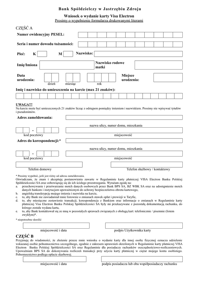 Bank Spółdzielczy w Jastrzębiu Zdroju Wniosek o wydanie karty Visa Electron Prosimy o wypełnienie formularza drukowanymi literami CZĘŚĆ A Numer ewidencyjny PESEL: Seria i numer dowodu tożsamości: Płeć: K Nazwisko: M Nazwisko rodowe matki Imię/Imiona Data urodzenia: Miejsce urodzenia: dzień miesiąc rok Imię i nazwisko do umieszczenia na karcie (max 21 znaków): UWAGA!!! Na karcie może być umieszczonych 21 znaków licząc z odstępem pomiędzy imieniem i nazwiskiem. Prosimy nie wpisywać tytułów i pseudonimów. Adres zameldowania: nazwa ulicy, numer domu, mieszkania kod pocztowy miejscowość Adres do korespondencji:* nazwa ulicy, numer domu, mieszkania kod pocztowy Telefon domowy miejscowość Telefon służbowy / kontaktowy * Prosimy wypełnić, jeśli jest różny od adresu zameldowania. Oświadczam, że znam i akceptuję postanowienia zawarte w Regulaminie karty płatniczej VISA Electron Banku Polskiej Spółdzielczości SA oraz zobowiązuję się do ich ścisłego przestrzegania. Wyrażam zgodę na: a. przechowywanie i przetwarzanie moich danych osobowych przez Bank BPS SA, BZ WBK SA oraz na udostępnienie moich danych bankom i instytucjom upoważnionym do ochrony bezpieczeństwa obrotu kartowego, b. angielską transkrypcję mojego imienia i nazwiska na karcie, c. to, aby Bank nie zawiadamiał mnie listownie o zmianach stawek opłat i prowizji w Taryfie, d. to, aby miesięczne zestawienie transakcji, korespondencja z Bankiem oraz informacje o zmianach w Regulaminie karty płatniczej Visa Electron Banku Polskiej Spółdzielczości SA były mi przekazywane z pozostałą dokumentacją rachunku, do którego została wydana karta, e. to, aby Bank kontaktował się ze mną w pozostałych sprawach związanych z obsługą kart: telefonicznie / pisemnie (listem zwykłym)*. * niepotrzebne skreślić miejscowość i data podpis Użytkownika karty CZĘŚĆ B Przyjmuję do wiadomości, że złożenie przeze mnie wniosku o wydanie karty dla innej osoby fizycznej oznacza udzielenie wskazanej osobie pełnomocnictwa szczególnego, zgodnie z zakresem uprawnień określonych w Regulaminie karty płatniczej VISA Electron Banku Polskiej Spółdzielczości SA oraz Regulaminie dla posiadaczy rachunków oszczędnościowo-rozliczeniowych. Upoważniam BPS SA do dokonywania rozliczeń transakcji przy użyciu karty płatniczej w ciężar mojego konta osobistego. Pełnomocnictwo podlega opłacie skarbowej. miejscowość i data podpis posiadacza lub obu współposiadaczy rachunku WYPEŁNIA BANK SPÓŁDZIELCZY W JASTRZĘBIU ZDROJU LUB PUNKT KASOWY BANKU Data przyjęcia wniosku stempel dzienny i czytelny podpis pracownika przyjmującego wniosek Karta wydana do rachunku (pełny numer) ......8470 0001................................................................................ Nr karty Propozycja pracownika do wydania karty Visa Electron: 1.Data założenia rachunku: 2.Imię i nazwisko posiadacza rachunku: 3.Adres: ul. 4.Kwota miesięcznych stałych wpływów na rachunek: 5.Nazwa zakładu pracy ( wpłaty własne)*: 6.Kwota limitu, debetu*: 7.Data spłaty: 8.Ocena prowadzenia rachunku: Proponuję wydać kartę Visa Electron.* Proponuję nie wydawać karty Visa Electron.* ..................... miejscowość i data .......................................... czytelny podpis i pieczątka imienna upoważnionego pracownika Decyzja członka Zarządu: Wyrażam zgode na wydanie karty............................... Odmawiam wydania karty Visa Electron......................... * niepotrzebne skreslić