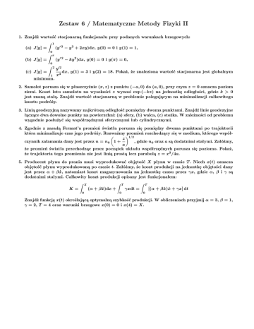 Zestaw 6 / Matematyczne Metody Fizyki II 1. Znajdź wartość stacjonarną funkcjonału przy podanych warunkach brzegowych: Z 1 (a) J [y] = (y 0 2 − y 2 + 2xy)dx, y(0) = 0 i y(1) = 1, 0 Z π (y 0 2 − ky 2 )dx, y(0) = 0 i y(π) = 0, (b) J [y] = 0 Z 2 (c) J [y] = 1 y 02 x3 dx, y(1) = 3 i y(2) = 18. Pokaż, że znaleziona wartość stacjonarna jest globalnym minimum. 2. Samolot porusza się w płaszczyźnie (x, z) z punktu (−a, 0) do (a, 0), przy czym z = 0 oznacza poziom ziemi. Koszt lotu samolotu na wysokości z wynosi exp (−kz) na jednostkę odległości, gdzie k > 0 jest znaną stałą. Znajdź wartość stacjonarną w problemie polegającym na minimalizacji całkowitego kosztu podróży. 3. Linią geodezyjną nazywamy najkrótszą odległość pomiędzy dwoma punktami. Znajdź linie geodezyjne łączące dwa dowolne punkty na powierzchni: (a) sfery, (b) walca, (c) stożka. W zależności od problemu wygodnie posłużyć się współrzędnymi sferycznymi lub cylindrycznymi. 4. Zgodnie z zasadą Fermat’a promień światła porusza się pomiędzy dwoma punktami po trajektorii która minimalizuje czas jego podróży. Rozważmy promień rozchodzący się w medium, którego współ z 1/2 czynnik załamania dany jest przez n = n0 1 + , gdzie n0 oraz a są dodatnimi stałymi. Załóżmy, a że promień światła przechodząc przez początek układu współrzędnych porusza się poziomo. Pokaż, że trajektoria tego promienia nie jest linią prostą lecz parabolą z = x2 /4a. 5. Producent płynu do prania musi wyprodukować objętość X płynu w czasie T . Niech x(t) oznacza objętość płynu wyprodukowaną po czasie t. Załóżmy, że koszt produkcji na jednostkę objętości dany jest przez α + β ẋ, natomiast koszt magazynowania na jednostkę czasu przez γx, gdzie α, β i γ są dodatnimi stałymi. Całkowity koszt produkcji opisany jest funkcjonałem: Z X K= Z T (α + β ẋ)dx + 0 Z T γxdt = 0 [(α + β ẋ)ẋ + γx] dt 0 Znajdź funkcję x(t) określającą optymalną szybkość produkcji. W obliczeniach przyjmij α = 3, β = 1, γ = 2, T = 4 oraz warunki brzegowe x(0) = 0 i x(4) = X.