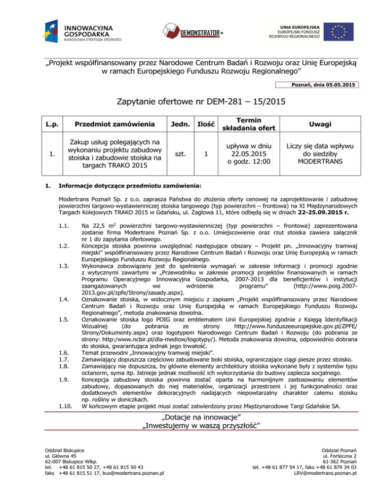 „Projekt współfinansowany przez Narodowe Centrum Badań i Rozwoju oraz Unię Europejską w ramach Europejskiego Funduszu Rozwoju Regionalnego” Poznań, dnia 05.05.2015 Zapytanie ofertowe nr DEM-281 – 15/2015 L.p. Przedmiot zamówienia Jedn. Ilość Termin składania ofert Uwagi 1. Zakup usług polegających na wykonaniu projektu zabudowy stoiska i zabudowie stoiska na targach TRAKO 2015 szt. 1 upływa w dniu 22.05.2015 o godz. 12:00 Liczy się data wpływu do siedziby MODERTRANS 1. Informacje dotyczące przedmiotu zamówienia: Modertrans Poznań Sp. z o.o. zaprasza Państwa do złożenia oferty cenowej na zaprojektowanie i zabudowę powierzchni targowo-wystawienniczej stoiska targowego (typ powierzchni – frontowa) na XI Międzynarodowych Targach Kolejowych TRAKO 2015 w Gdańsku, ul. Żaglowa 11, które odbędą się w dniach 22-25.09.2015 r. 1.1. 1.2. 1.3. 1.4. 1.5. 1.6. 1.7. 1.8. 1.9. 1.10. Na 22,5 m2 powierzchni targowo-wystawienniczej (typ powierzchni – frontowa) zaprezentowana zostanie firma Modertrans Poznań Sp. z o.o. Umiejscowienie oraz rzut stoiska zawiera załącznik nr 1 do zapytania ofertowego. Koncepcja stoiska powinna uwzględniać następujące obszary – Projekt pn. „Innowacyjny tramwaj miejski” współfinansowany przez Narodowe Centrum Badań i Rozwoju oraz Unię Europejską w ramach Europejskiego Funduszu Rozwoju Regionalnego. Wykonawca zobowiązany jest do spełnienia wymagań w zakresie informacji i promocji zgodnie z wytycznymi zawartymi w „Przewodniku w zakresie promocji projektów finansowanych w ramach Programu Operacyjnego Innowacyjna Gospodarka, 2007-2013 dla beneficjentów i instytucji zaangażowanych we wdrożenie programu” (http://www.poig.20072013.gov.pl/zpfe/Strony/zasady.aspx). Oznakowanie stoiska, w widocznym miejscu z zapisem „Projekt współfinansowany przez Narodowe Centrum Badań i Rozwoju oraz Unię Europejską w ramach Europejskiego Funduszu Rozwoju Regionalnego”, metoda znakowania dowolna. Oznakowanie stoiska logo POIG oraz emblematem Unii Europejskiej zgodnie z Księgą Identyfikacji Wizualnej (do pobrania ze strony http://www.funduszeeuropejskie.gov.pl/ZPFE/ Strony/Dokumenty.aspx) oraz logotypem Narodowego Centrum Badań i Rozwoju (do pobrania ze strony: http:/www.ncbir.pl/dla-mediow/logotypy/). Metoda znakowania dowolna, odpowiednio dobrana do stoiska, gwarantująca jednak jego trwałość. Temat przewodni „Innowacyjny tramwaj miejski”. Zamawiający dopuszcza częściowo zabudowane boki stoiska, ograniczające ciągi piesze przez stoisko. Zamawiający nie dopuszcza, by główne elementy architektury stoiska wykonane były z systemów typu octanorm, syma itp. Istnieje jednak możliwość ich wykorzystania do budowy zaplecza socjalnego. Koncepcja zabudowy stoiska powinna zostać oparta na harmonijnym zastosowaniu elementów zabudowy, dopasowanych do niej materiałów, organizacji przestrzeni i jej funkcjonalności oraz dodatkowych elementów dekoracyjnych nadających niepowtarzalny charakter całemu stoisku np. rośliny w doniczkach. W końcowym etapie projekt musi zostać zatwierdzony przez Międzynarodowe Targi Gdańskie SA. „Dotacje na innowacje” „Inwestujemy w waszą przyszłość” Oddział Biskupice ul. Główna 45 62-007 Biskupice Wlkp. tel. +48 61 815 50 27, +48 61 815 50 43 faks +48 61 815 51 17, [email protected] Oddział Poznań ul. Forteczna 2 61-362 Poznań tel. +48 61 877 54 17, faks +48 61 879 34 03 [email protected] „Projekt współfinansowany przez Narodowe Centrum Badań i Rozwoju oraz Unię Europejską w ramach Europejskiego Funduszu Rozwoju Regionalnego” 1.11. 1.12. 1.13. 1.14. 2. Dopuszczalna wysokość zabudowy wynosi 2,5 m. Elementy konstrukcyjne powyżej 2,5 m i wychodzące poza obrys stoiska wymagają indywidualnych uzgodnień i pisemnej zgody MTG SA. Zabudowa stoiska powinna uwzględniać: 1.12.1. jedno miejsce obsługi oraz niewyeksponowaną przestrzeń do prowadzenia indywidualnych rozmów, 1.12.2. przestrzeń wystawienniczą, 1.12.3. przestrzeń socjalną z półkami, 1.12.4. meble i sprzęt multimedialny (telewizor plazmowy – możliwość połączenia z laptopem, na którym zostanie wyświetlona prezentacja dotycząca działalności Modertrans Poznań Sp. z o.o.), 1.12.5. wieszak na ubrania, 1.12.6. kosz na śmieci, 1.12.7. stojak na foldery, 1.12.8. sprzęt AGD, tj. ekspres do kawy, czajnik elektryczny, 1.12.9. podłączenie wody + terma + zlewozmywak z odpływem, 1.12.10. instalację elektryczną i oświetlenie zabudowy. Wykonawca zobowiązany jest do: 1.13.1. montażu oraz demontażu stoiska, 1.13.2. wykonania instalacji elektrycznej i oświetleniowej zabudowy, 1.13.3. przekazania praw autorskich i plików produkcyjnych wyników prac powstałych w ramach zamówienia, na płycie CD/DVD lub innym nośniku elektronicznym. W ramach zamówienia Wykonawca zobowiązany będzie do zapewnienia: 1.14.1. napojów - woda gazowana i niegazowana, soki, napoje gazowane, kawa, herbata przy założeniu, że w trakcie targów zostanie obsłużonych ok. 80 gości, 1.14.2. poczęstunku – ciastka, cukierki, paluszki, orzeszki przy założeniu, że w trakcie targów zostanie obsłużonych ok. 80 gości. Kryteria wyboru: 2.1. Przy wyborze oferty najkorzystniejszej Zamawiający zastosuje następujące kryteria Lp. Kryterium Waga Punkty 1. Cena 60% 60 pkt 2. Oryginalność i estetyka 40% 40 pkt 2.2. Punkty za kryterium „cena” zostaną obliczone według wzoru: 2.3. Punkty za kryterium „oryginalność i estetyka” zostaną przyznane w skali punktowej do 40 pkt, na podstawie przedstawionego projektu stoiska. Wykonawca ma obowiązek zawrzeć w projekcie stoiska, elementy składowe określone przez Zamawiającego. W ocenie będą brane pod uwagę następujące elementy: „Dotacje na innowacje” „Inwestujemy w waszą przyszłość” Oddział Biskupice ul. Główna 45 62-007 Biskupice Wlkp. tel. +48 61 815 50 27, +48 61 815 50 43 faks +48 61 815 51 17, [email protected] Oddział Poznań ul. 