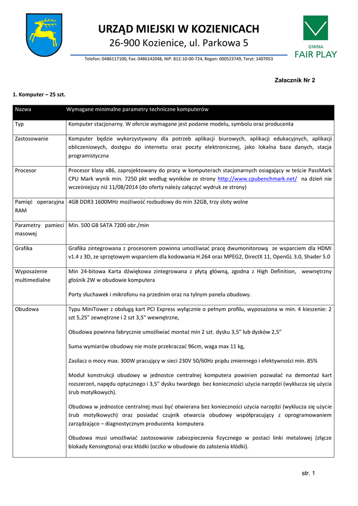 URZĄD MIEJSKI W KOZIENICACH 26-900 Kozienice, ul. Parkowa 5 Telefon: 0486117100, Fax: 0486142048, NIP: 812-10-00-724, Regon: 000523749, Teryt: 1407053 Załacznik Nr 2 1. Komputer – 25 szt. Nazwa Wymagane minimalne parametry techniczne komputerów Typ Komputer stacjonarny. W ofercie wymagane jest podanie modelu, symbolu oraz producenta Zastosowanie Komputer będzie wykorzystywany dla potrzeb aplikacji biurowych, aplikacji edukacyjnych, aplikacji obliczeniowych, dostępu do internetu oraz poczty elektronicznej, jako lokalna baza danych, stacja programistyczna Procesor Procesor klasy x86, zaprojektowany do pracy w komputerach stacjonarnych osiagający w teście PassMark CPU Mark wynik min. 7250 pkt według wyników ze strony http://www.cpubenchmark.net/ na dzień nie wcześniejszy niż 11/08/2014 (do oferty należy załączyć wydruk ze strony) Pamięć operacyjna 4GB DDR3 1600MHz możliwość rozbudowy do min 32GB, trzy sloty wolne RAM Parametry pamieci Min. 500 GB SATA 7200 obr./min masowej Grafika Grafika zintegrowana z procesorem powinna umożliwiać pracę dwumonitorową ze wsparciem dla HDMI v1.4 z 3D, ze sprzętowym wsparciem dla kodowania H.264 oraz MPEG2, DirectX 11, OpenGL 3.0, Shader 5.0 Wyposażenie multimedialne Min 24-bitowa Karta dźwiękowa zintegrowana z płytą główną, zgodna z High Definition, wewnętrzny głośnik 2W w obudowie komputera Porty słuchawek i mikrofonu na przednim oraz na tylnym panelu obudowy. Obudowa Typu MiniTower z obsługą kart PCI Express wyłącznie o pełnym profilu, wyposażona w min. 4 kieszenie: 2 szt 5,25” zewnętrzne i 2 szt 3,5” wewnętrzne, Obudowa powinna fabrycznie umożliwiać montaż min 2 szt. dysku 3,5” lub dysków 2,5” Suma wymiarów obudowy nie może przekraczać 96cm, waga max 11 kg, Zasilacz o mocy max. 300W pracujący w sieci 230V 50/60Hz prądu zmiennego i efektywności min. 85% Moduł konstrukcji obudowy w jednostce centralnej komputera powinien pozwalać na demontaż kart rozszerzeń, napędu optycznego i 3,5” dysku twardego bez konieczności użycia narzędzi (wyklucza się użycia śrub motylkowych). Obudowa w jednostce centralnej musi być otwierana bez konieczności użycia narzędzi (wyklucza się użycie śrub motylkowych) oraz posiadać czujnik otwarcia obudowy współpracujący z oprogramowaniem zarządzająco – diagnostycznym producenta komputera. Obudowa musi umożliwiać zastosowanie zabezpieczenia fizycznego w postaci linki metalowej (złącze blokady Kensingtona) oraz kłódki (oczko w obudowie do założenia kłódki). str. 1 URZĄD MIEJSKI W KOZIENICACH 26-900 Kozienice, ul. Parkowa 5 Telefon: 0486117100, Fax: 0486142048, NIP: 812-10-00-724, Regon: 000523749, Teryt: 1407053 Obudowa musi być wyposażona w zamek szybkiego dostępu który nie wystaje poza obrys obudowy i musi być usytuowany na bocznym panelu. Obudowa musi posiadać wbudowany wizualny system diagnostyczny, służący do sygnalizowania i diagnozowania problemów z komputerem i jego komponentami, a w szczególności musi sygnalizować: - uszkodzenie lub brak pamięci RAM - uszkodzenie złączy PCI i PCIe, płyty głównej - uszkodzenie kontrolera Video - uszkodzenie dysku twardego - awarię BIOS’u - awarię procesora Oferowany system diagnostyczny nie może wykorzystywać minimalnej ilości wolnych slotów wymaganych dla płyty głównej Każdy komputer powinien być oznaczony niepowtarzalnym numerem seryjnym umieszonym na obudowie, oraz musi być wpisany na stałe w BIOS. Zgodność systemami operacyjnymi standardami z Potwierdzenie kompatybilności komputera z oferowanym systemem operacyjnym (załączyć wydruk ze strony producenta oprogramowania) i Bezpieczeństwo Zintegrowany z płytą główną dedykowany układ sprzętowy służący do tworzenia i zarządzania wygenerowanymi przez komputer kluczami szyfrowania. Zabezpieczenie to musi posiadać możliwość szyfrowania poufnych dokumentów przechowywanych na dysku twardym przy użyciu klucza sprzętowego Zdalne zarządzanie Wbudowana w płytę główną technologia zarządzania i monitorowania komputerem na poziomie sprzętowym działająca niezależnie od stanu czy obecności systemu operacyjnego oraz stanu włączenia komputera podczas pracy na zasilaczu sieciowym AC, obsługująca zdalną komunikację sieciową w oparciu o protokół IPv4 oraz IPv6, a także zapewniająca: - - - - monitorowanie konfiguracji komponentów komputera - CPU, Pamięć, HDD wersja BIOS płyty głównej; zdalną konfigurację ustawień BIOS, zdalne przejęcie konsoli tekstowej systemu, przekierowanie procesu ładowania systemu operacyjnego z wirtualnego CD ROM lub FDD z serwera zarządzającego; zdalne przejecie pełnej konsoli graficznej systemu tzw. KVM Redirection (Keyboard, Video, Mouse) bez udziału systemu operacyjnego ani dodatkowych programów, również w przypadku braku lub uszkodzenia systemu operacyjnego do rozdzielczości 1920x1080 włącznie; zapis i przechowywanie dodatkowych informacji o wersji zainstalowanego oprogramowania i zdalny odczyt tych informacji (wersja, zainstalowane uaktualnienia, sygnatury wirusów, itp.) z wbudowanej pamięci nieulotnej. technologia zarządzania i monitorowania komputerem na poziomie sprzętowym powinna być zgodna z otwartymi standardami DMTF WS-MAN 1.0.0 (http://www.dmtf.org/standards/wsman) oraz DASH 1.0.0 (http://www.dmtf.org/standards/mgmt/dash/) nawiazywanie przez sprzętowy mechanizm zarządzania, zdalnego szyfrowanego protokołem SSL/TLS połączenia z predefiniowanym serwerem zarządzającym, w definiowanych odstępach str. 2 URZĄD MIEJSKI W KOZIENICACH 26-900 Kozienice, ul. Parkowa 5 Telefon: 0486117100, Fax: 0486142048, NIP: 812-10-00-724, Regon: 000523749, Teryt: 1407053 czasu, w przypadku wystąpienia predefiniowanego zdarzenia lub błędu systemowego (tzw. platform event) oraz na żądanie użytkownika z poziomu BIOS. - wbudowany sprzętowo log operacji zdalnego zarządzania, możliwy do kasowania tylko przez upoważnionego użytkownik