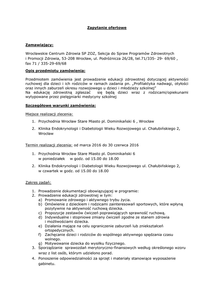 Zapytanie ofertowe Zamawiający: Wrocławskie Centrum Zdrowia SP ZOZ, Sekcja do Spraw Programów Zdrowotnych i Promocji Zdrowia, 53-208 Wrocław, ul. Podróżnicza 26/28, tel.71/335- 29- 69/60 , fax 71 / 335-29-69/68 Opis przedmiotu zamówienia: Przedmiotem zamówienia jest prowadzenie edukacji zdrowotnej dotyczącej aktywności ruchowej dla dzieci i ich rodziców w ramach zadania pn. „Profilaktyka nadwagi, otyłości oraz innych zaburzeń okresu rozwojowego u dzieci i młodzieży szkolnej” Na edukację zdrowotną zgłaszać się będą dzieci wraz z rodzicami/opiekunami wytypowane przez pielęgniarki medycyny szkolnej Szczegółowe warunki zamówienia: Miejsce realizacji zlecenia: 1. Przychodnia Wrocław Stare Miasto pl. Dominikański 6 , Wrocław 2. Klinika Endokrynologii i Diabetologii Wieku Rozwojowego ul. Chałubińskiego 2, Wrocław Termin realizacji zlecenia: od marca 2016 do 30 czerwca 2016 1. Przychodnia Wrocław Stare Miasto pl. Dominikański 6 w poniedziałek w godz. od 15.00 do 18.00 2. Klinika Endokrynologii i Diabetologii Wieku Rozwojowego ul. Chałubińskiego 2, w czwartek w godz. od 15.00 do 18.00 Zakres zadań: 1. Prowadzenie dokumentacji obowiązującej w programie: 2. Prowadzenie edukacji zdrowotnej w tym: a) Promowanie zdrowego i aktywnego trybu życia. b) Omówienie z dzieckiem i rodzicami zainteresowań sportowych, które wpłyną pozytywnie na aktywność ruchową dziecka. c) Propozycje zestawów ćwiczeń poprawiających sprawność ruchową. d) Indywidualne i stopniowe zmiany ćwiczeń zgodne ze stanem zdrowia i możliwościami dziecka. e) Działania mające na celu ograniczenie zaburzeń lub zniekształceń ortopedycznych. f) Zachęcanie dzieci i rodziców do wspólnego aktywnego spędzania czasu wolnego. g) Motywowanie dziecka do wysiłku fizycznego. 3. Sporządzanie sprawozdań merytoryczno-finansowych według określonego wzoru wraz z list osób, którym udzielono porad. 4. Ponoszenie odpowiedzialności za sprzęt i materiały stanowiące wyposażenie gabinetu. Warunki jakie musi spełniać Zleceniobiorca: a) wykształcenie kierunkowe: fizjoterapeuta lub rehabilitant oraz b) minimum 3-letnie doświadczenie w pracy na wyżej wymienionym stanowisku c) aktualne orzeczenie lekarza medycyny pracy o możliwości wykonywania świadczeń deklarowanych do realizacji zadań objętych zapytaniem ofertowym lub podpisane oświadczenie o posiadaniu aktualnego orzeczenia lekarza medycyny pracy o możliwości wykonywania świadczeń deklarowanych do realizacji zadań objętych zapytaniem ofertowym a) zaświadczenie o przeszkoleniu BHP ( dotyczy Realizatorów ubiegających się o udzielanie edukacji zdrowotnej na terenie Placówek Wrocławskiego Centrum Zdrowia) Kryteria oceny: a) cena b) wykształcenie c) doświadczenie Oferty proszę zgłaszać osobiście lub listownie w formie pisemnej na druku formularza ofertowego Miejsce i czas złożenia oferty: Wrocławskie Centrum Zdrowia SP ZOZ, ul. Podróżnicza 26/28; 53-208 Wrocław. Oferty przyjmowane są do 22 lutego 2016 do godziny 10:00 Załącznik: 1. Formularz ofertowy 2. Oświadczenie o posiadaniu aktualnego orzeczenia lekarza medycyny pracy o możliwości wykonywania świadczeń deklarowanych do realizacji zadań objętych zapytaniem ofertowym oraz aktualne wymagane szkolenia BHP Koordynator programu: Beata Józefowicz , tel. 71 335 29 69