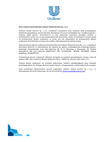 Dane osobowe Kontrahentów Unilever Poland Services Sp. z o.o. Unilever Poland Services Sp. z o.o. („Unilever”) przetwarza dane osobowe osób prowadzących działalność gospodarczą: swoich klientów, dostawców lub innych przedsiębiorców współpracujących z Unilever (dalej łącznie: „Kontrahenci”) w celu wykonania zawartych pomiędzy Unilever a Kontrahentami umów oraz w celu sprawozdawczości finansowej, chyba, że Kontrahenci wyrazili zgodę na przetwarzanie danych osobowych w innym celu lub uprawnienie do przetwarzanie danych osobowych Kontrahentów w innym celu wynika z obowiązujących przepisów prawa. Administratorem danych osobowych Kontrahentów jest Unilever Poland Services Sp. z o.o. z siedzibą w Warszawie (02-672), ul. Domaniewska 49, wpisaną do rejestru przedsiębiorców Krajowego Rejestru Sądowego, prowadzonego przez Sąd Rejonowy dla m. st. Warszawy w Warszawie, XIII Wydział Gospodarczy KRS pod numerem 0000271457, NIP: 5213415549; REGON: 140790901, Kapitał zakładowy: 50.000,00 PLN Przetwarzanie danych osobowych odbywać się będzie na zasadach przewidzianych ustawą z dnia 29 sierpnia 1997 roku o ochronie danych osobowych (Dz.U. z 2002r, Nr. 101 poz. 926 z późn. zm.). Podanie danych osobowych ma charakter dobrowolny. Osobom udostępniającym dane osobowe przysługuje prawo do: dostępu do treści swoich danych, ich poprawiania, a także żądania ich usunięcia Dane kontaktowe Administratora danych osobowych: Unilever Poland Services Sp. z o.o., ul. Domaniewska 49, 02-672 Warszawa, tel: (0-22) 570 60 00, [email protected].