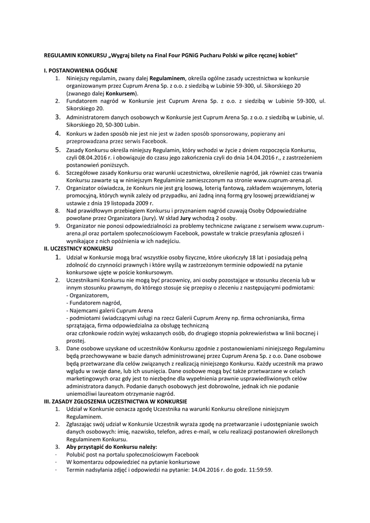 REGULAMIN KONKURSU „Wygraj bilety na Final Four PGNiG Pucharu Polski w piłce ręcznej kobiet” I. POSTANOWIENIA OGÓLNE 1. Niniejszy regulamin, zwany dalej Regulaminem, określa ogólne zasady uczestnictwa w konkursie organizowanym przez Cuprum Arena Sp. z o.o. z siedzibą w Lubinie 59-300, ul. Sikorskiego 20 (zwanego dalej Konkursem). 2. Fundatorem nagród w Konkursie jest Cuprum Arena Sp. z o.o. z siedzibą w Lubinie 59-300, ul. Sikorskiego 20. 3. Administratorem danych osobowych w Konkursie jest Cuprum Arena Sp. z o.o. z siedzibą w Lubinie, ul. Sikorskiego 20, 50-300 Lubin. 4. Konkurs w żaden sposób nie jest nie jest w żaden sposób sponsorowany, popierany ani przeprowadzana przez serwis Facebook. 5. Zasady Konkursu określa niniejszy Regulamin, który wchodzi w życie z dniem rozpoczęcia Konkursu, czyli 08.04.2016 r. i obowiązuje do czasu jego zakooczenia czyli do dnia 14.04.2016 r., z zastrzeżeniem postanowieo poniższych. 6. Szczegółowe zasady Konkursu oraz warunki uczestnictwa, określenie nagród, jak również czas trwania Konkursu zawarte są w niniejszym Regulaminie zamieszczonym na stronie www.cuprum-arena.pl. 7. Organizator oświadcza, że Konkurs nie jest grą losową, loterią fantową, zakładem wzajemnym, loterią promocyjną, których wynik zależy od przypadku, ani żadną inną formą gry losowej przewidzianej w ustawie z dnia 19 listopada 2009 r. 8. Nad prawidłowym przebiegiem Konkursu i przyznaniem nagród czuwają Osoby Odpowiedzialne powołane przez Organizatora (Jury). W skład Jury wchodzą 2 osoby. 9. Organizator nie ponosi odpowiedzialności za problemy techniczne związane z serwisem www.cuprumarena.pl oraz portalem społecznościowym Facebook, powstałe w trakcie przesyłania zgłoszeo i wynikające z nich opóźnienia w ich nadejściu. II. UCZESTNICY KONKURSU 1. Udział w Konkursie mogą brad wszystkie osoby fizyczne, które ukooczyły 18 lat i posiadają pełną zdolnośd do czynności prawnych i które wyślą w zastrzeżonym terminie odpowiedź na pytanie konkursowe ujęte w poście konkursowym. 2. Uczestnikami Konkursu nie mogą byd pracownicy, ani osoby pozostające w stosunku zlecenia lub w innym stosunku prawnym, do którego stosuje się przepisy o zleceniu z następującymi podmiotami: - Organizatorem, - Fundatorem nagród, - Najemcami galerii Cuprum Arena - podmiotami świadczącymi usługi na rzecz Galerii Cuprum Areny np. firma ochroniarska, firma sprzątająca, firma odpowiedzialna za obsługę techniczną oraz członkowie rodzin wyżej wskazanych osób, do drugiego stopnia pokrewieostwa w linii bocznej i prostej. 3. Dane osobowe uzyskane od uczestników Konkursu zgodnie z postanowieniami niniejszego Regulaminu będą przechowywane w bazie danych administrowanej przez Cuprum Arena Sp. z o.o. Dane osobowe będą przetwarzane dla celów związanych z realizacją niniejszego Konkursu. Każdy uczestnik ma prawo wglądu w swoje dane, lub ich usunięcia. Dane osobowe mogą byd także przetwarzane w celach marketingowych oraz gdy jest to niezbędne dla wypełnienia prawnie usprawiedliwionych celów administratora danych. Podanie danych osobowych jest dobrowolne, jednak ich nie podanie uniemożliwi laureatom otrzymanie nagród. III. ZASADY ZGŁOSZENIA UCZESTNICTWA W KONKURSIE 1. Udział w Konkursie oznacza zgodę Uczestnika na warunki Konkursu określone niniejszym Regulaminem. 2. Zgłaszając swój udział w Konkursie Uczestnik wyraża zgodę na przetwarzanie i udostępnianie swoich danych osobowych: imię, nazwisko, telefon, adres e-mail, w celu realizacji postanowieo określonych Regulaminem Konkursu. 3. Aby przystąpid do Konkursu należy: · Polubid post na portalu społecznościowym Facebook · W komentarzu odpowiedzied na pytanie konkursowe · Termin nadsyłania zdjęd i odpowiedzi na pytanie: 14.04.2016 r. do godz. 11:59:59. · Wraz ze zgłoszeniem konkursowym, w wiadomości prywatnej, należy przesład dane osobowe Uczestnika, tj.: imię i nazwisko, telefon oraz adres e-mail. · Uczestnik, który przystąpił do Konkursu i spełnia powyższe postanowienia niniejszego Regulaminu staje się Uczestnikiem Konkursu. IV. ZASADY WYŁONIENIA ZWYCIĘZCÓW KONKURSU I WYDANIE NAGRÓD 1. Zwycięzcy Konkursu zostaną wyłonieni spośród Uczestników, którzy polubią post na portalu społecznościowym Facebook oraz odpowiedzą prawidłowo w komentarzu na pytanie konkursowe, w zastrzeżonym przez Organizatora konkursu terminie. 2. Nagrody w Konkursie: 20 podwójnych biletów na mecze Finału Four PGNiG Pucharu Polski w piłce ręcznej kobiet, które odbędą się w dniach 16-17.04.2016. 3. Rozwiązanie Konkursu będzie miało miejsce w siedzibie Organizatora w dniu 14.04.2016 r. Ogłoszenie wyników Konkursu nastąpi na fanpage’u Cuprum Arena na portalu Facebook. 4. Nagrody będą mogły zostad odebrane jedynie drogą osobistego odbioru do dnia 15.04.2016 r. do godz. 21.00, w Punkcie Informacyjnym Cuprum Arena w godzinach pracy Punktu. W przypadku nieodebrania – bilety przepadają. 5. Organizator nie ponosi odpowiedzialności za brak możliwości przekazania nagrody z przyczyn leżących po stronie Uczestnika, a w szczególności w przypadku: niepodania danych adresowych w wyznaczonym terminie oraz podania błędnych, nieaktualnych lub niepełnych danych adresowych. 6. Laureatom nie przysługuje prawo zamiany nagród przyznanych w Konkursie na jej ekwiwalent pieniężny lub na inne nagrody rzeczowe. 7. Laureatom nie wolno przenosid nagrody na osoby trzecie. 8. Nadesłanie przez Uczestnika rozwiązania Konkursu drogą online oznacza, że wyraża on zgodę na opublikowanie imienia, nazwiska na liście laureatów na stronie www.cuprum-arena.pl V. ZASADY POSTĘPOWANIA REKLAMACYJNEGO 1. Wszelkie reklamacje dotyczące Konkursu należy zgłaszad do Organizatora w formie pisemnej – listem poleconym, pocztą kurierską lub osobiście w biurze Organizatora w ciągu 14 dni od ogłoszenia wyników, z zastrzeżeniem, że za termin zgłoszenia reklama