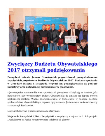 Zwycięzcy Budżetu Obywatelskiego 2017 otrzymali podziękowania Prezydent miasta Janusz Stankowiak pogratulował pomysłodawcom zwycięskich projektów w Budżecie Obywatelskim 2017. Podczas spotkania w Urzędzie Miasta 4 listopada wręczył im podziękowania za podjęte inicjatywy oraz aktywizację mieszkańców w głosowanie. – Jestem pełen uznania dla was – powiedział prezydent – Dziękuję za wysiłek, jaki podjęliście, aby wykorzystać Budżet Obywatelski do zmiany na lepsze swojej najbliższej okolicy. Wasze zaangażowanie w budowanie w naszym mieście społeczeństwa obywatelskiego napawa optymizmem. Jestem wam za to wdzięczny – zakończył Stankowiak. Listy gratulacyjne z podziękowaniami otrzymali: Wojciech Raczyński i Piotr Przybylski – zwycięzcy z rejonu nr 1. Ich projekt „Park linowy w Parku Kocborowskim” zdobył 513 głosów. Jolanta Reszkiewicz – zwyciężczyni z rejonu nr 2. Na jej projekt „Budowa boiska wielofunkcyjnego na placu zabaw „Akademia Fiku – Miku” przy ulicach Buchholza i Marii Curie Skłodowskiej zagłosowało 98 mieszkańców. Krzysztof Kamysz – zwycięzca z rejonu nr 3. Pomysł na „Ciepłą zimę dla psiaka” – modernizacja i przebudowa Schroniska dla Bezdomnych Zwierząt w Starogardzie Gdańskim” zdobył 581 głosów. Grażyna Błańska i Bartosz Molin – zwycięzcy z rejonu 4. „Twój Rodzinny Park Edukacji Sportowej i Wypoczynku”, który ma powstać na osiedlu Piastów uzyskał 270 głosów. Anna Lembicz i Tomasz Czaja – zwycięzcy projektów ogólnomiejskich. Na ich pomysł aby w Starogardzie powstała PrzySTAŃ – bezpieczne podpory dla rowerzystów na skrzyżowaniach mieszkańcy oddali 1742 głosów Zwycięzcą tegorocznego Budżetu Obywatelskiego jest również Piotr Pielecki – autor projektu „Jacek i Agatka Plac Zabaw” na ul. Grunwaldzkiej. Na jego pomysł zagłosowało 436 mieszkańców, stawiając go na pierwszym miejscu pod względem liczby głosów wśród wszystkich pozostałych projektów. Zgodnie z nowym regulaminem BO projekt z największą liczba głosów otrzyma 100 tys. zł na realizację. Wszystkie inwestycje, które w drodze głosowania wybrali mieszkańcy miasta, zostaną zrealizowane w 2017 roku.