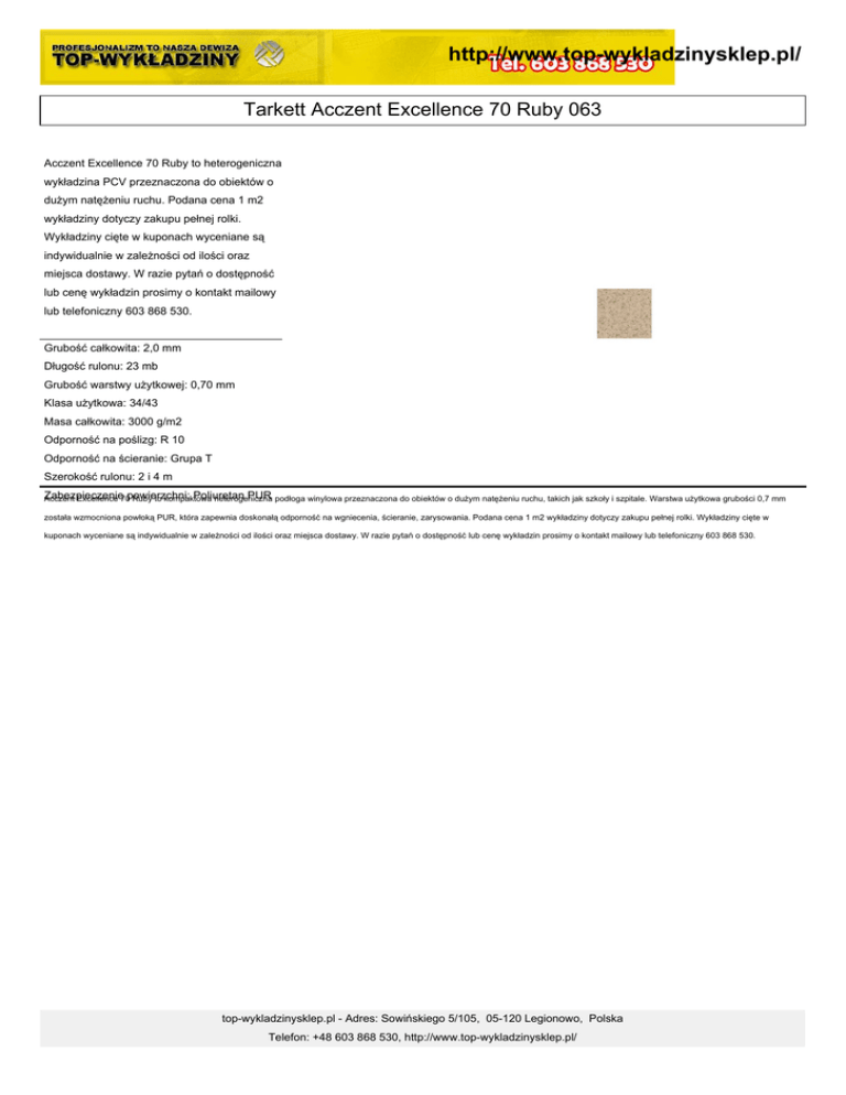 http://www.top-wykladzinysklep.pl/ Tarkett Acczent Excellence 70 Ruby 063 Acczent Excellence 70 Ruby to heterogeniczna wykładzina PCV przeznaczona do obiektów o dużym natężeniu ruchu. Podana cena 1 m2 wykładziny dotyczy zakupu pełnej rolki. Wykładziny cięte w kuponach wyceniane są indywidualnie w zależności od ilości oraz miejsca dostawy. W razie pytań o dostępność lub cenę wykładzin prosimy o kontakt mailowy lub telefoniczny 603 868 530. Grubość całkowita: 2,0 mm Długość rulonu: 23 mb Grubość warstwy użytkowej: 0,70 mm Klasa użytkowa: 34/43 Masa całkowita: 3000 g/m2 Odporność na poślizg: R 10 Odporność na ścieranie: Grupa T Szerokość rulonu: 2 i 4 m Zabezpieczenie Poliuretan PUR podłoga winylowa przeznaczona do obiektów o dużym natężeniu ruchu, takich jak szkoły i szpitale. Warstwa użytkowa grubości 0,7 mm Acczent Excellence 70powierzchni: Ruby to kompaktowa heterogeniczna została wzmocniona powłoką PUR, która zapewnia doskonałą odporność na wgniecenia, ścieranie, zarysowania. Podana cena 1 m2 wykładziny dotyczy zakupu pełnej rolki. Wykładziny cięte w kuponach wyceniane są indywidualnie w zależności od ilości oraz miejsca dostawy. W razie pytań o dostępność lub cenę wykładzin prosimy o kontakt mailowy lub telefoniczny 603 868 530. top-wykladzinysklep.pl - Adres: Sowińskiego 5/105, 05-120 Legionowo, Polska Telefon: +48 603 868 530, http://www.top-wykladzinysklep.pl/