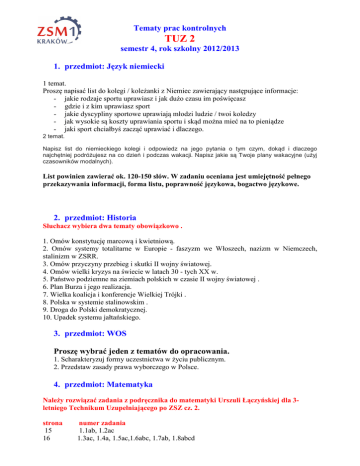 Tematy prac kontrolnych TUZ 2 semestr 4, rok szkolny 2012/2013 1. przedmiot: Język niemiecki 1 temat. Proszę napisać list do kolegi / koleżanki z Niemiec zawierający następujące informacje: - jakie rodzaje sportu uprawiasz i jak dużo czasu im poświęcasz - gdzie i z kim uprawiasz sport - jakie dyscypliny sportowe uprawiają młodzi ludzie / twoi koledzy - jak wysokie są koszty uprawiania sportu i skąd można mieć na to pieniądze - jaki sport chciałbyś zacząć uprawiać i dlaczego. 2 temat. Napisz list do niemieckiego kolegi i odpowiedz na jego pytania o tym czym, dokąd i dlaczego najchętniej podróżujesz na co dzień i podczas wakacji. Napisz jakie są Twoje plany wakacyjne (użyj czasowników modalnych). List powinien zawierać ok. 120-150 słów. W zadaniu oceniana jest umiejętność pełnego przekazywania informacji, forma listu, poprawność językowa, bogactwo językowe. 2. przedmiot: Historia Słuchacz wybiera dwa tematy obowiązkowo . 1. Omów konstytucję marcową i kwietniową. 2. Omów systemy totalitarne w Europie - faszyzm we Włoszech, nazizm w Niemczech, stalinizm w ZSRR. 3. Omów przyczyny przebieg i skutki II wojny światowej. 4. Omów wielki kryzys na świecie w latach 30 - tych XX w. 5. Państwo podziemne na ziemiach polskich w czasie II wojny światowej . 6. Plan Burza i jego realizacja. 7. Wielka koalicja i konferencje Wielkiej Trójki . 8. Polska w systemie stalinowskim . 9. Droga do Polski demokratycznej. 10. Upadek systemu jałtańskiego. 3. przedmiot: WOS Proszę wybrać jeden z tematów do opracowania. 1. Scharakteryzuj formy uczestnictwa w życiu publicznym. 2. Przedstaw zasady prawa wyborczego w Polsce. 4. przedmiot: Matematyka Należy rozwiązać zadania z podręcznika do matematyki Urszuli Łączyńskiej dla 3letniego Technikum Uzupełniającego po ZSZ cz. 2. strona 15 16 numer zadania 1.1ab, 1.2ac 1.3ac, 1.4a, 1.5ac,1.6abc, 1.7ab, 1.8abcd 17 28 29 30 31 47 48 56 57 58 59 70 71 79 80 96 97 98 1.9abc, 1.10całe,1.11bc,1.12ab, 1.13ab, 1.14ab 2.1bc, 2.2ac 2.3ab, 2.5ab, 2.6, 2.7a 2.8a, 2.9a, 2.11a, 2.12 2.13 3.1bc, 3.2ac, 3.3ac, 3.4ab 3.5b, 3.6, 3.7, 3.8, 3.9 4.1 4.2, 4.3ab, 4.5całe 4.7 i 4.8 -1 kolumna tabeli, 4.10 4.11 1.1ab, 1.2ab 1.3a, 1.6a, 1.7a 2.1, 2.2ab, 2.6ab, 2.8ab 3.1a, 3.2 3.8ab, 3.9a, 3.10a 3.11 5. przedmiot: Podstawy przedsiębiorczości Proszę opracować w formie referatu jeden z tematów: 1. 2. 3. 4. 5. 6. 7. 8. Metody rozwiązywania konfliktów. Na czym polega aktywne poszukiwanie pracy? Rodzaje umów o pracę. Która z umów jest najkorzystniejsza dla pracownika i dlaczego? Rodzaje bezrobocia, jego przyczyny i skutki. Rola banków w gospodarce. Giełda w Polsce. Rodzaje ubezpieczeń. Pozytywne i negatywne skutki globalizacji. 6. przedmiot: BHP Proszę w pracy kontrolnej omówić: wypadki przy pracy - rodzaje. Termin oddania pracy 24 kwietnia 2013. 7. przedmiot: Podwozia i nadwozia pojazdów samochodowych 1. 2. 3. Układy hamulcowe pneumatyczne (schematy, zasada działania); Zawieszenie aktywne w pojazdach samochodowych (budowa, zasada działania); Układ kierowniczy aktywny w pojazdach samochodowych (budowa, zasada działania). Do wyboru jeden z tematów. 8. przedmiot: Elektryczne i elektroniczne wyposażenie pojazdów samochodowych Zaprojektuj (bez obliczeń) układ elektroniczny, którego zadaniem jest opóźnianie wyłączenia oświetlenia wnętrza samochodu, z możliwością regulacji czasu opóźnienia. Narysuj schematy układu z zaznaczeniem przepływu prądu przy otwartych i zamkniętych drzwiach samochodu. Opisz zasadę działania powyższego układu. Na schemacie zaznacz zacisk instalacji samochodowej, z którego będzie zasilany ten układ. Termin oddania pracy 17.03.2013 r. 9. przedmiot: Pracownia elektrotechniki i elektroniki Zaprojektuj układ sterowania dmuchawy samochodowej mając do dyspozycji: - dwa przekaźniki o zaciskach 86, 85, 87, 88a, 87a(DIN72552) - dwa wyłączniki - kontrolkę zieloną i czerwoną - rezystor - bezpiecznik termiczny Warunki pracy dmuchawy: wyłączona, pierwszy bieg, kontrolka zielona, duże obroty, drugi bieg, kontrolka czerwona, małe obroty. Termin oddania pracy 14.04.2013 r. 10. przedmiot: Język polski Pisanie tekstu własnego w związku z tekstem literackim zamieszczonym w arkuszu. Wybierz temat i napisz wypracowanie. (min. 250 słów lub 2 str.) Temat 1. Analizując podany fragment Lalki Bolesława Prusa, scharakteryzuj występujących w nim bohaterów. Określ ich stosunek do nauki i miłości. Bolesław Prus Lalka (fragment) Wokulski stanął na ulicy. – Pan zajmuje się fizyką czy chemią?... – spytał zdziwiony. – Ach, czym ja się nie zajmuję!... – odparł Ochocki. – Fizyką, chemią i technologią... Przecież skończyłem wydział przyrodniczy w uniwersytecie i mechaniczny w politechnice... Udało mi się trochę ulepszyć mikroskop, zbudować jakiś nowy stos elektryczny6, jakąś tam lampę... Wokulski zdumiewał się coraz więcej. – Więc to pan jest tym Ochockim wynalazcą?... – Ja – odparł młody człowiek. – No, ale i cóż to znaczy?... Razem nic. Kiedy pomyślę, że w dwudziestym ósmym roku tylko tyle zrobiłem, ogarnia mnie desperacja7. Ogniwo Ochockiego albo – lampa elektryczna Ochockiego... jakież to głupie!... Rwać się8 gdzieś od dzieciństwa i utknąć na lampie, to okropne... Dobiegać środka życia i nie znaleźć nawet śladu drogi, po której by się iść chciało – cóż to za rozpacz!... – Chcę zadać panu pytanie... nie ... dwa pytania, bardzo poufne9, a może nawet drażliwe – mówił Ochocki. – Czy nie obrazi się pan? ... – Słucham – odparł Wokulski. – Pan był przyrodnikiem? – spytał Ochocki. – Tak. – I w dodatku przyrodnikiem entuzjastą. Wiem, co pan przeszedł, od dawna szanuję pana z tego powodu... Wspomnienie o trudnościach, z jakimi szamotał się pan, dodawało mi otuchy... Mówiłem sobie: zrobię przynajmniej to, co ten człowiek, a ponieważ nie mam takich przeszkód, więc –